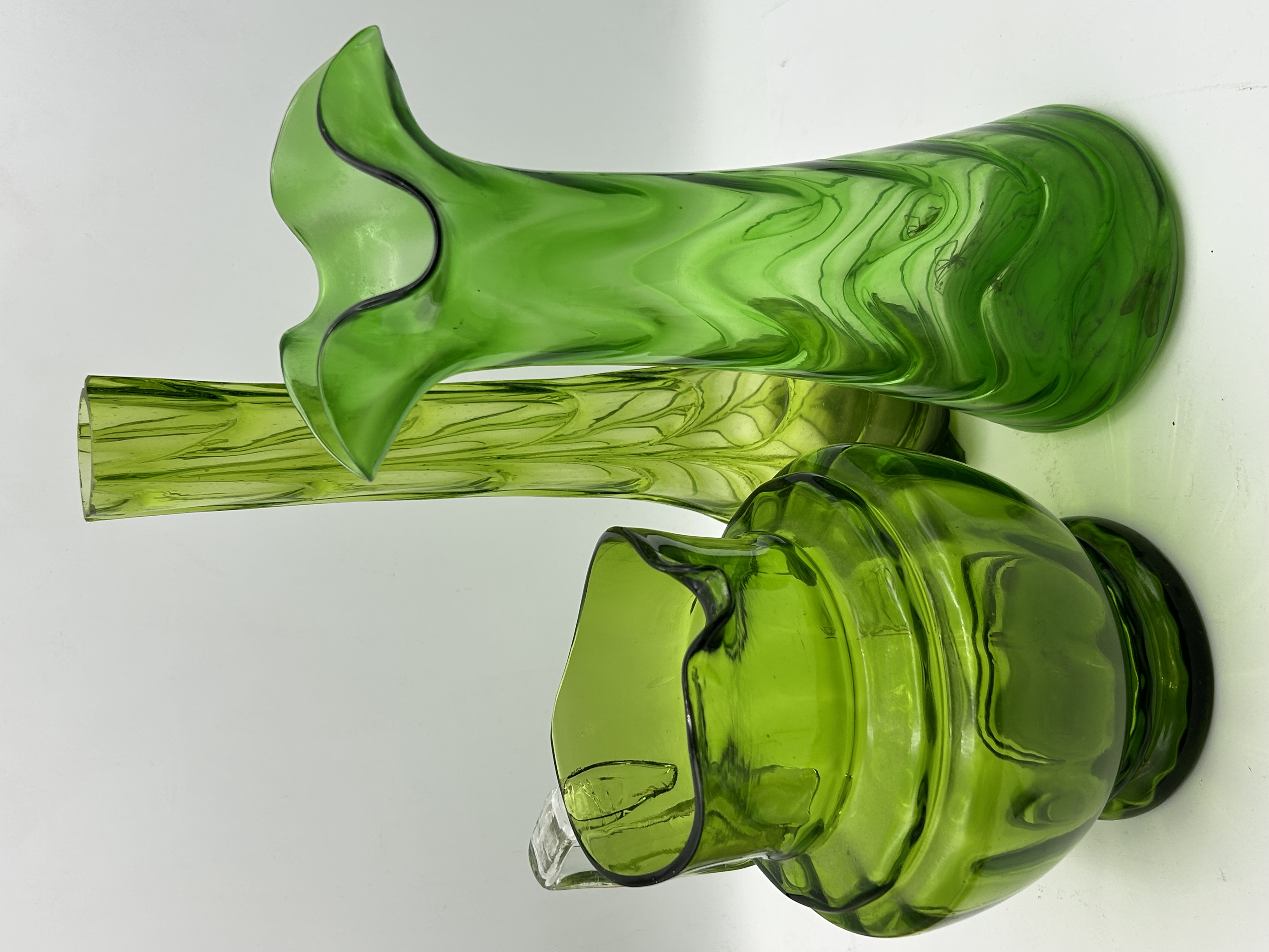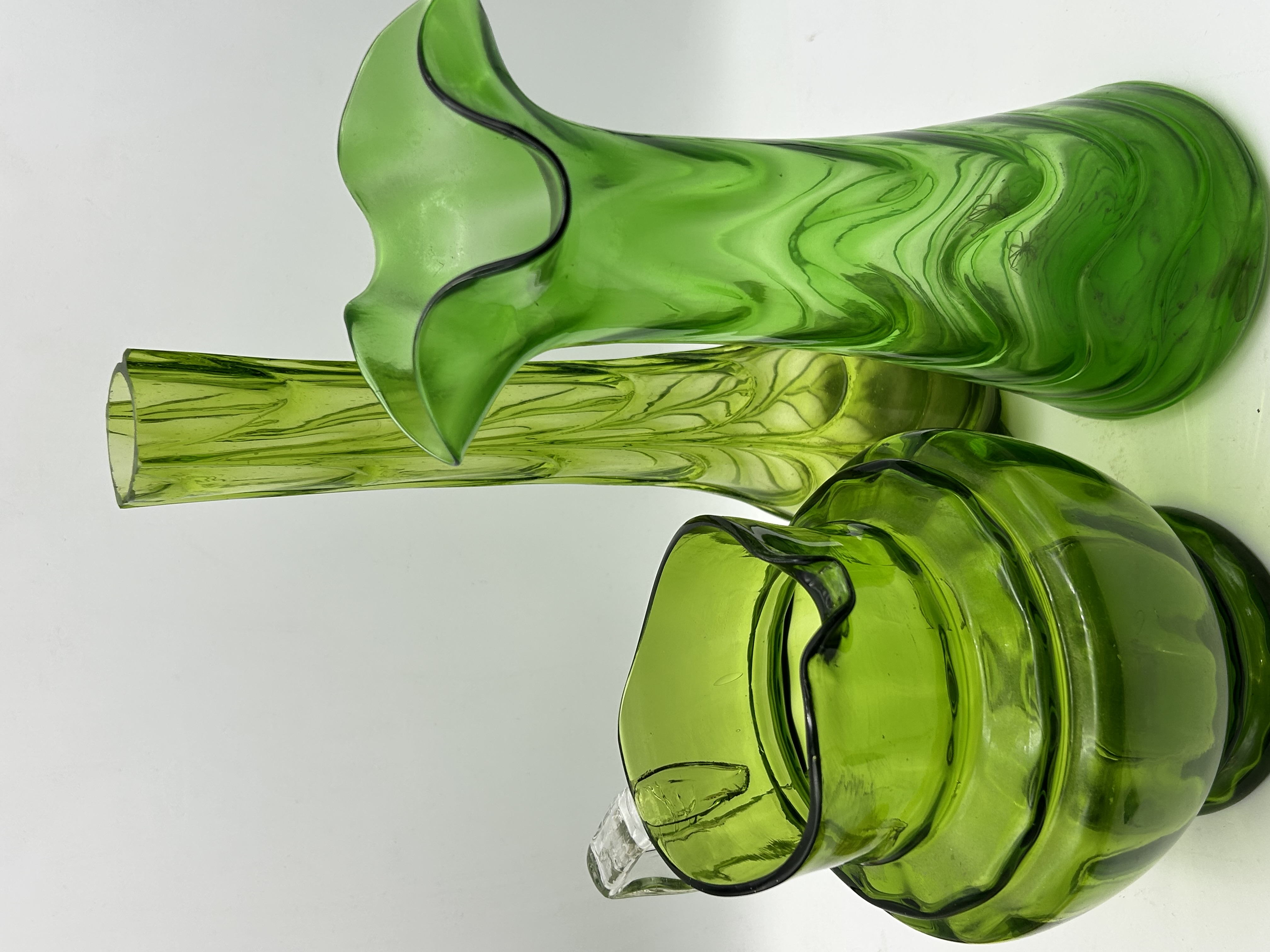 A collection of three mid-century modern green art glass items. The group includes a Viking Art Glass Epic line vase in a medium green color, featuring a fluted, ruffled rim and a wavy, textured body. The second item is a hand-blown green glass pitcher with a ribbed, bulbous body and an applied clear glass handle. The third item is a slender cylindrical vase in light green glass featuring a pulled-feather or swirled pattern. All items are hand-blown and do not bear visible maker’s marks or signatures.