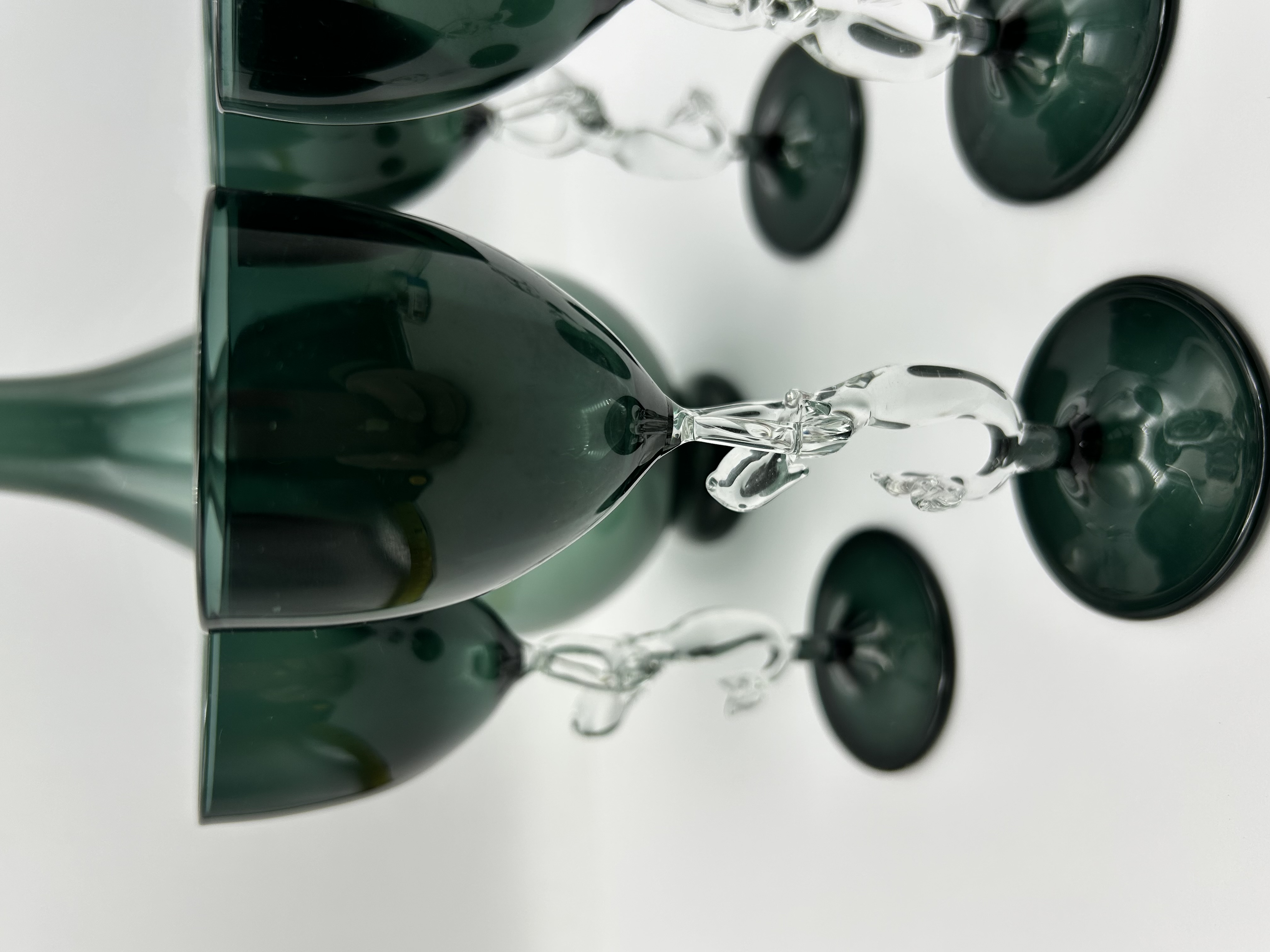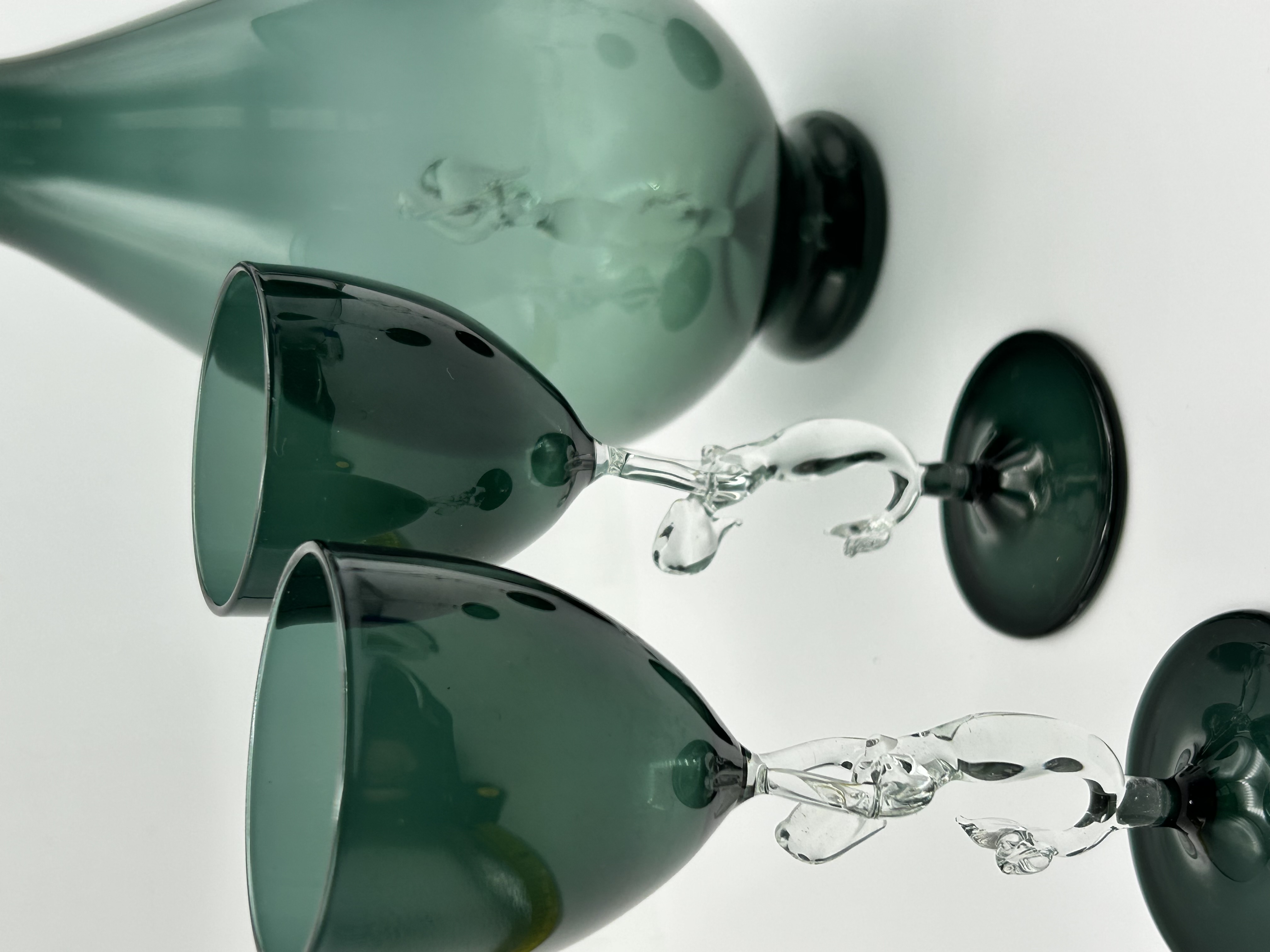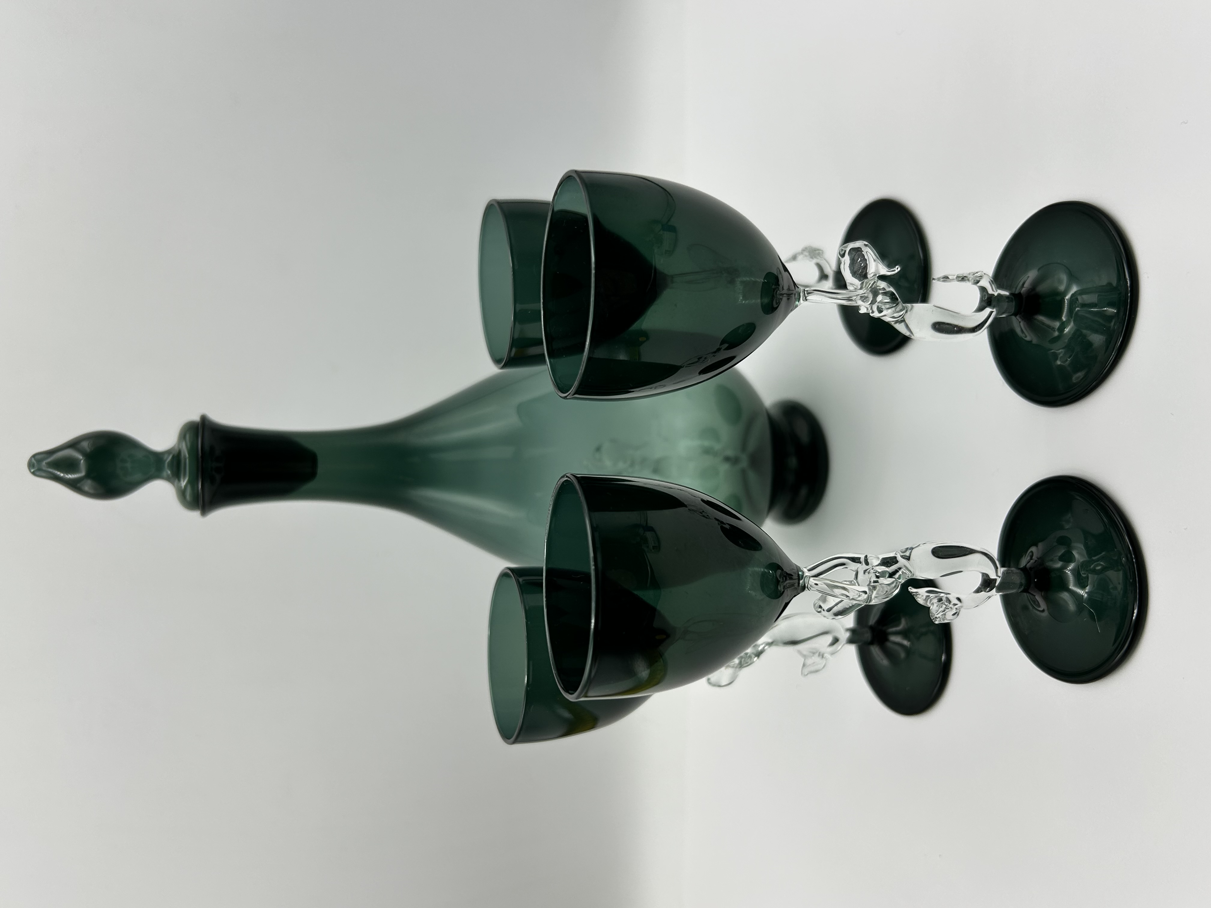 A set of Art Deco Bimini glass barware, attributed to the Bimini Werkstatte founded by Fritz Lampl in Vienna. The collection is crafted from hand-blown emerald green and clear glass. The pieces feature clear glass figural elements in the form of mermaids, which serve as the stems for the glasses and as an internal decorative element within the body of the decanter. The set comprises a decanter with a matching green glass stopper and several stemmed glasses with translucent green bowls and circular bases. This Bimini Mermaid design is characteristic of Austrian lampworked glass production from the 1920s and 1930s. No maker marks or signatures are visible on the items.
