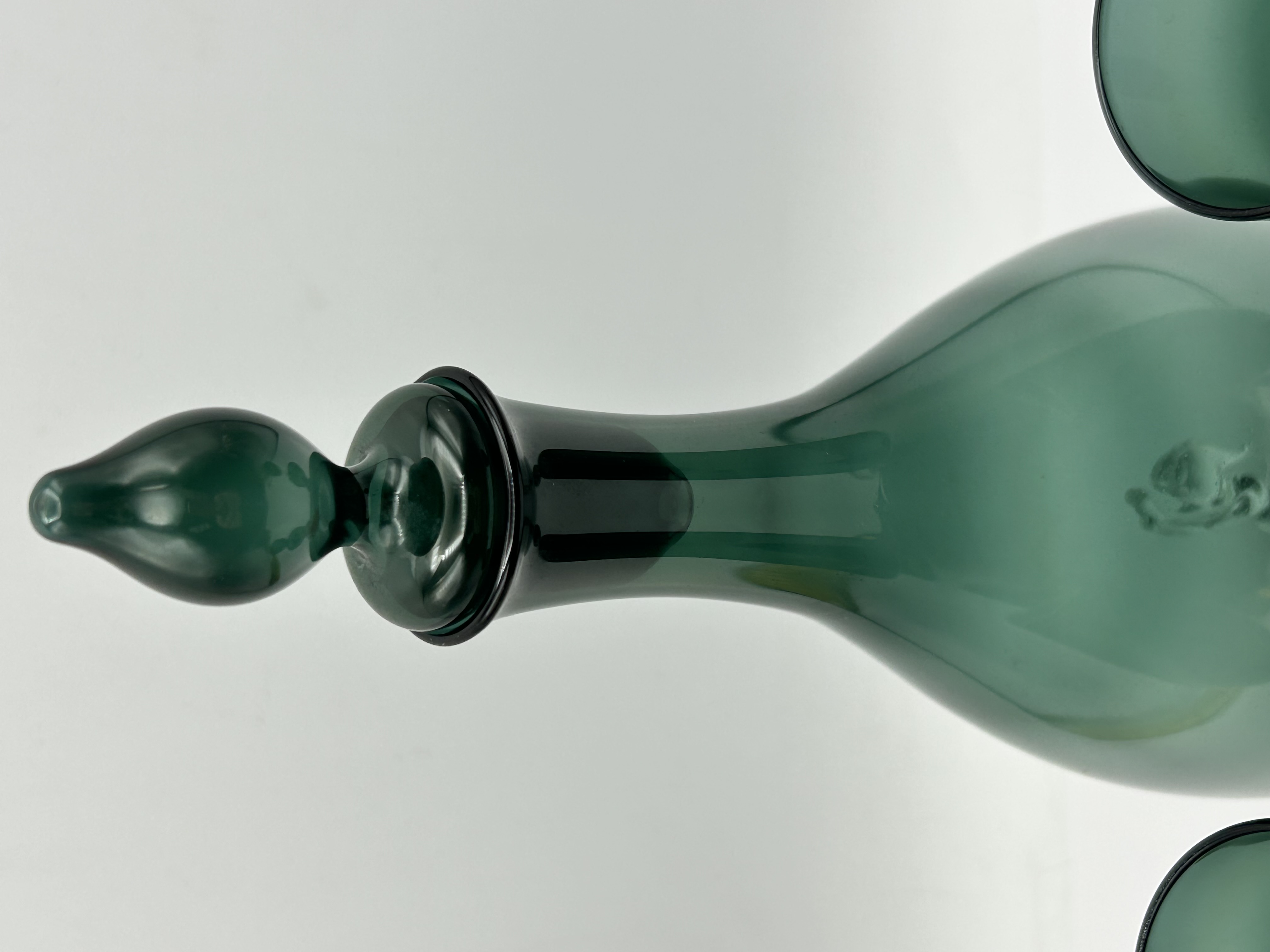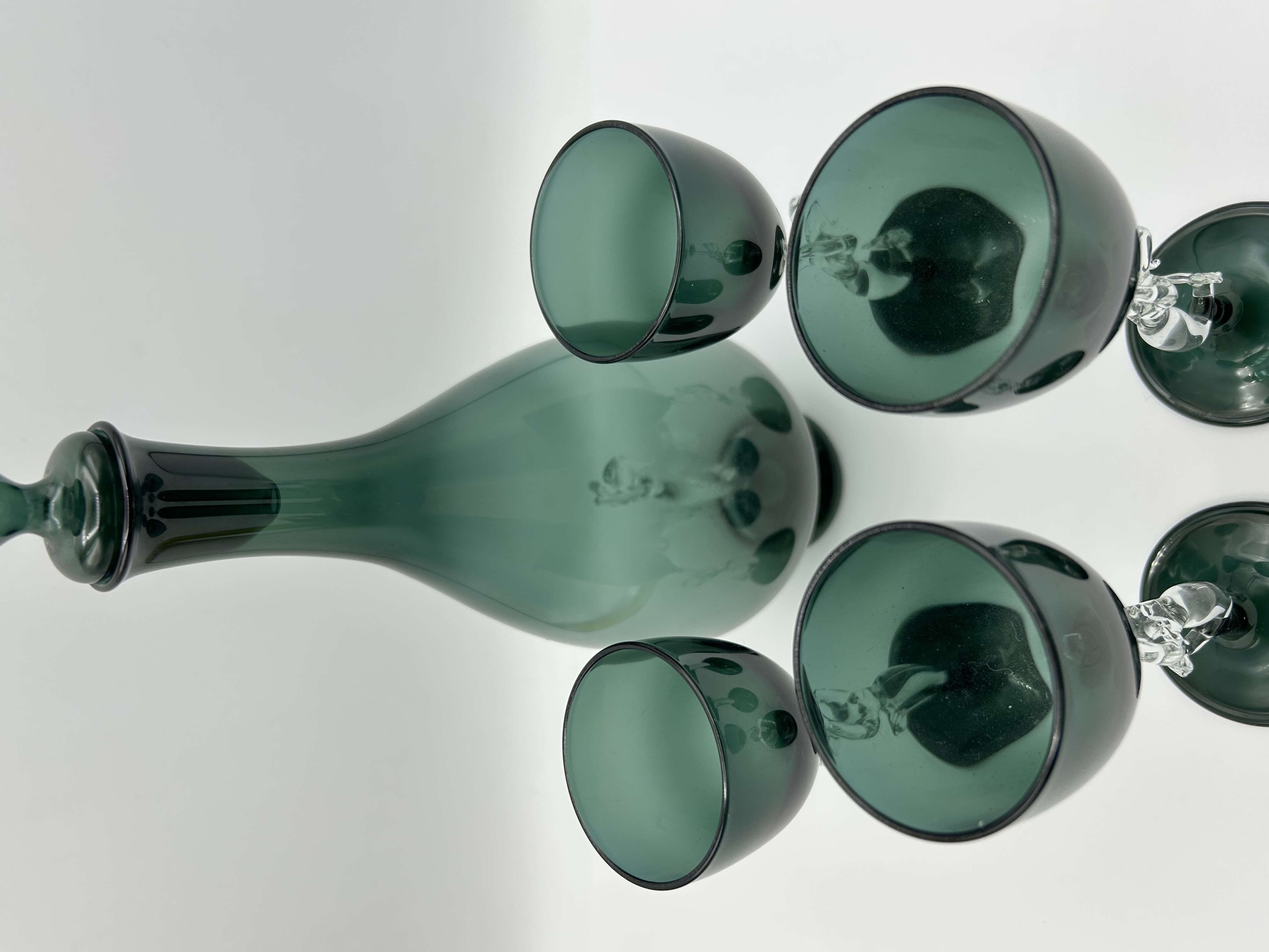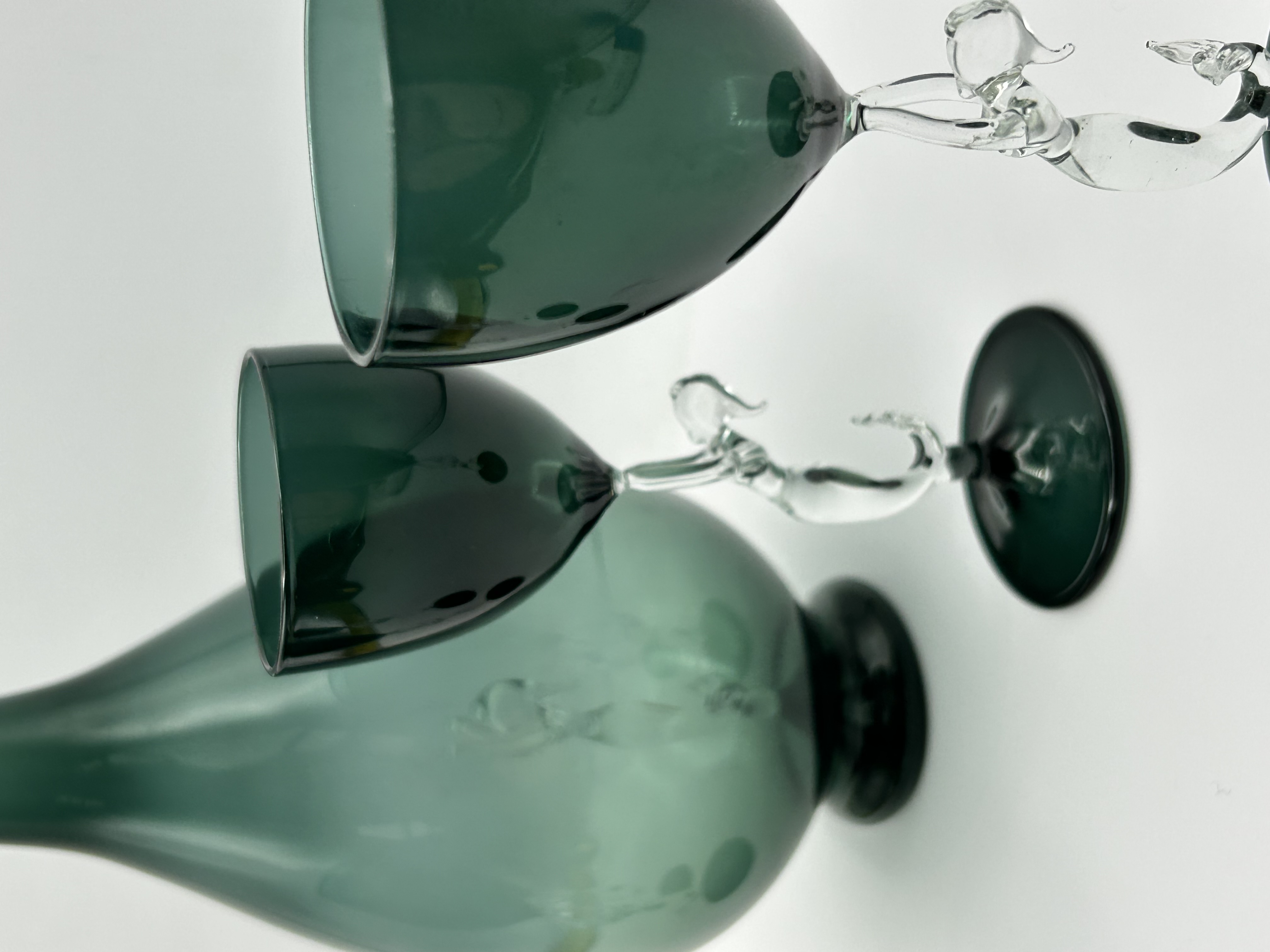 A set of Art Deco Bimini glass barware, attributed to the Bimini Werkstatte founded by Fritz Lampl in Vienna. The collection is crafted from hand-blown emerald green and clear glass. The pieces feature clear glass figural elements in the form of mermaids, which serve as the stems for the glasses and as an internal decorative element within the body of the decanter. The set comprises a decanter with a matching green glass stopper and several stemmed glasses with translucent green bowls and circular bases. This Bimini Mermaid design is characteristic of Austrian lampworked glass production from the 1920s and 1930s. No maker marks or signatures are visible on the items.