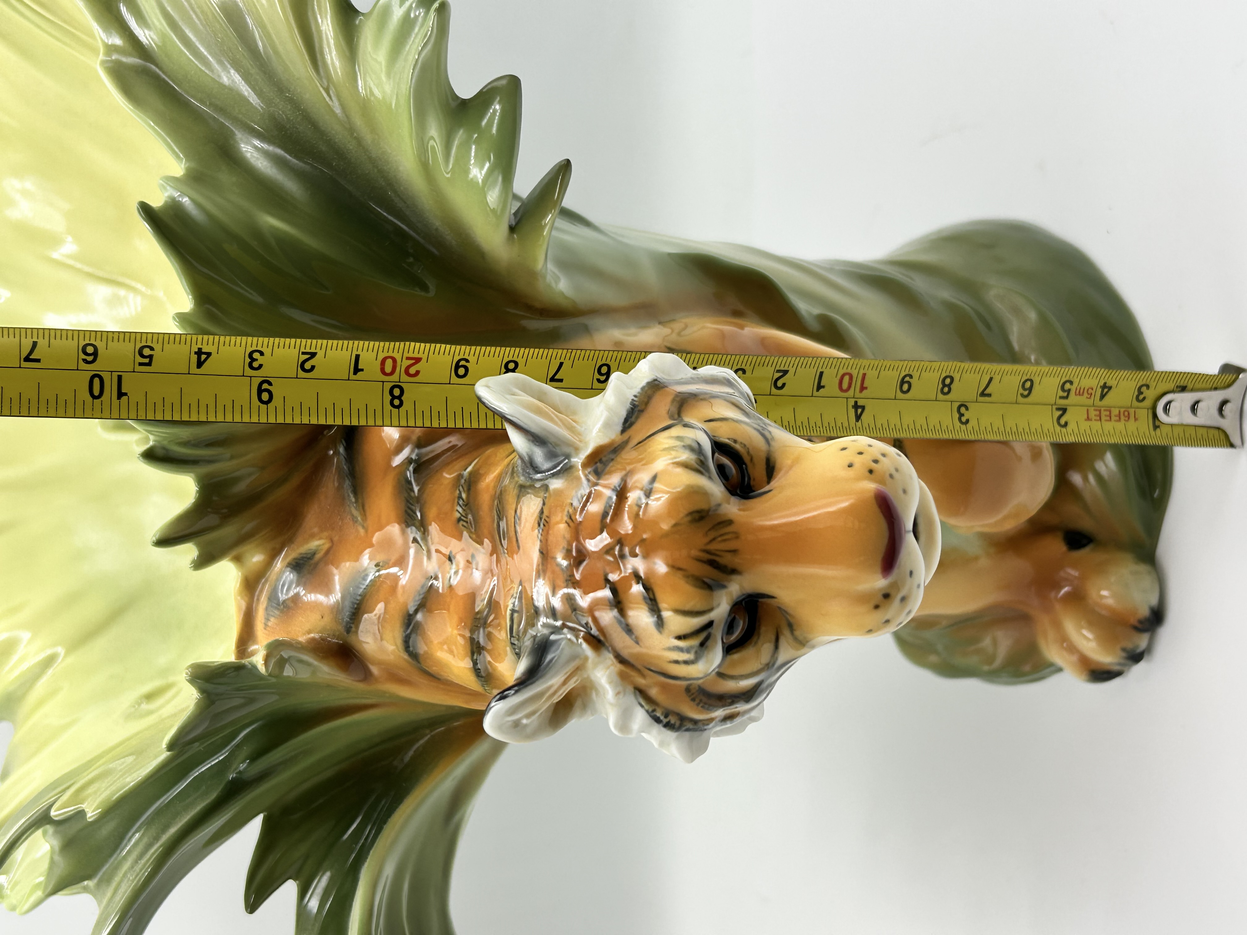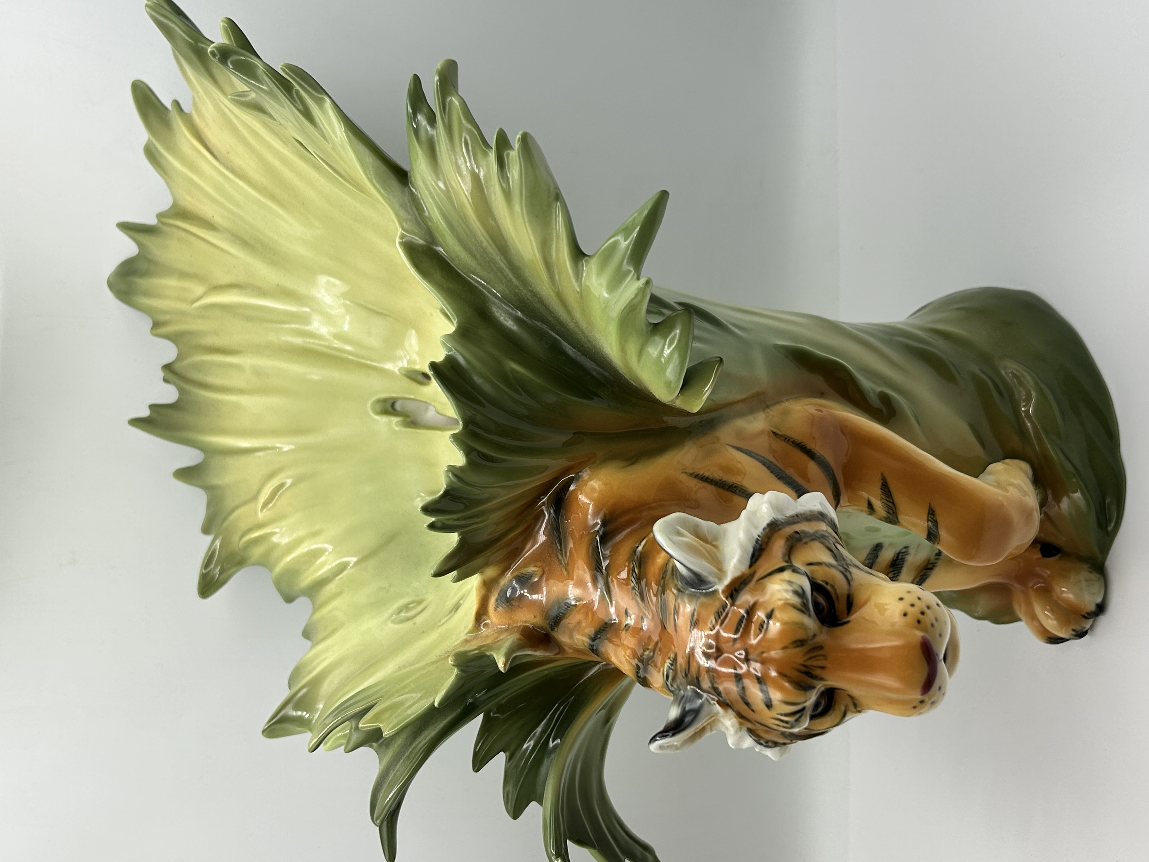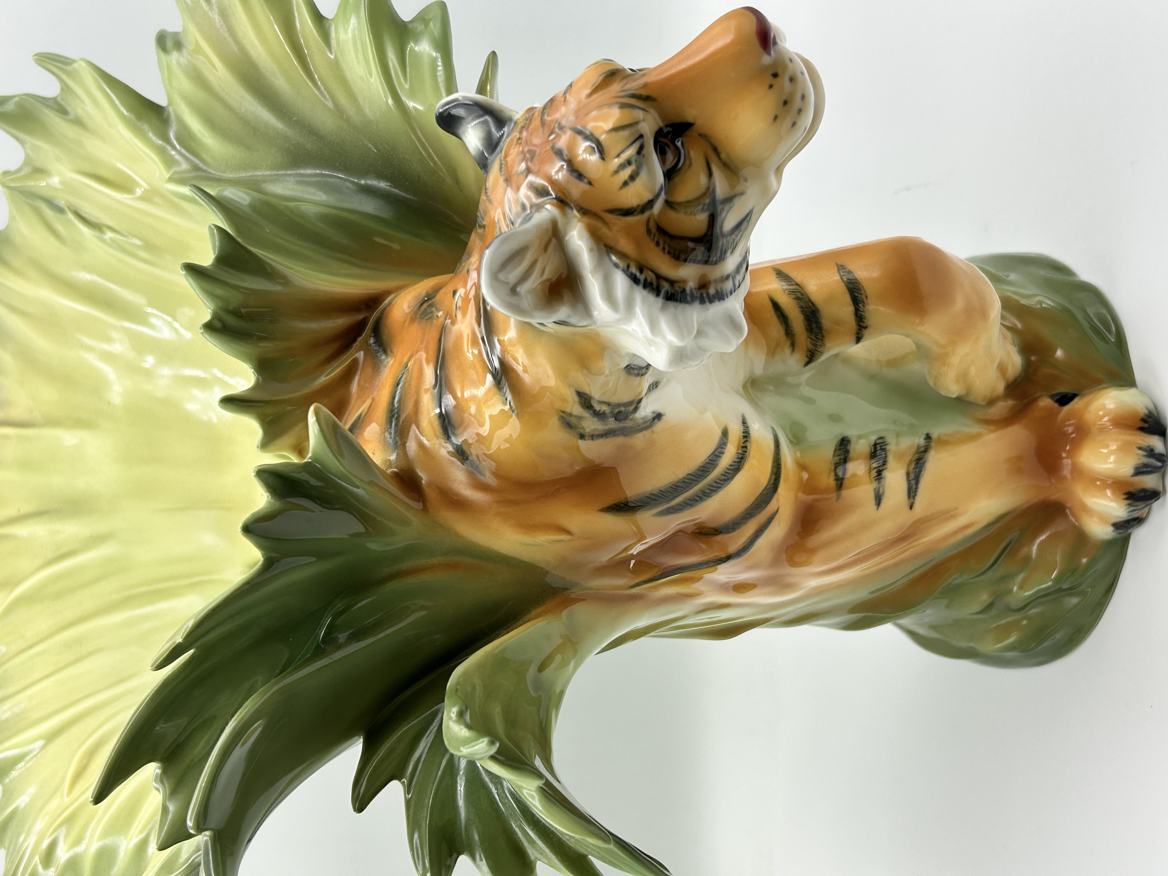 Franz Collection Jungle Beauties-Safari Tiger Vase, model number FZ00154. This porcelain sculptural vase features a three-dimensional tiger figure integrated into a composition of large, stylized green and yellow leaves. The item is finished with a high-gloss glaze. The underside of the base bears several markings, including the FRANZ name in blue underglaze, a red square seal chop mark, an additional blue underglaze signature, and an oval sticker with the model number FZ00154.