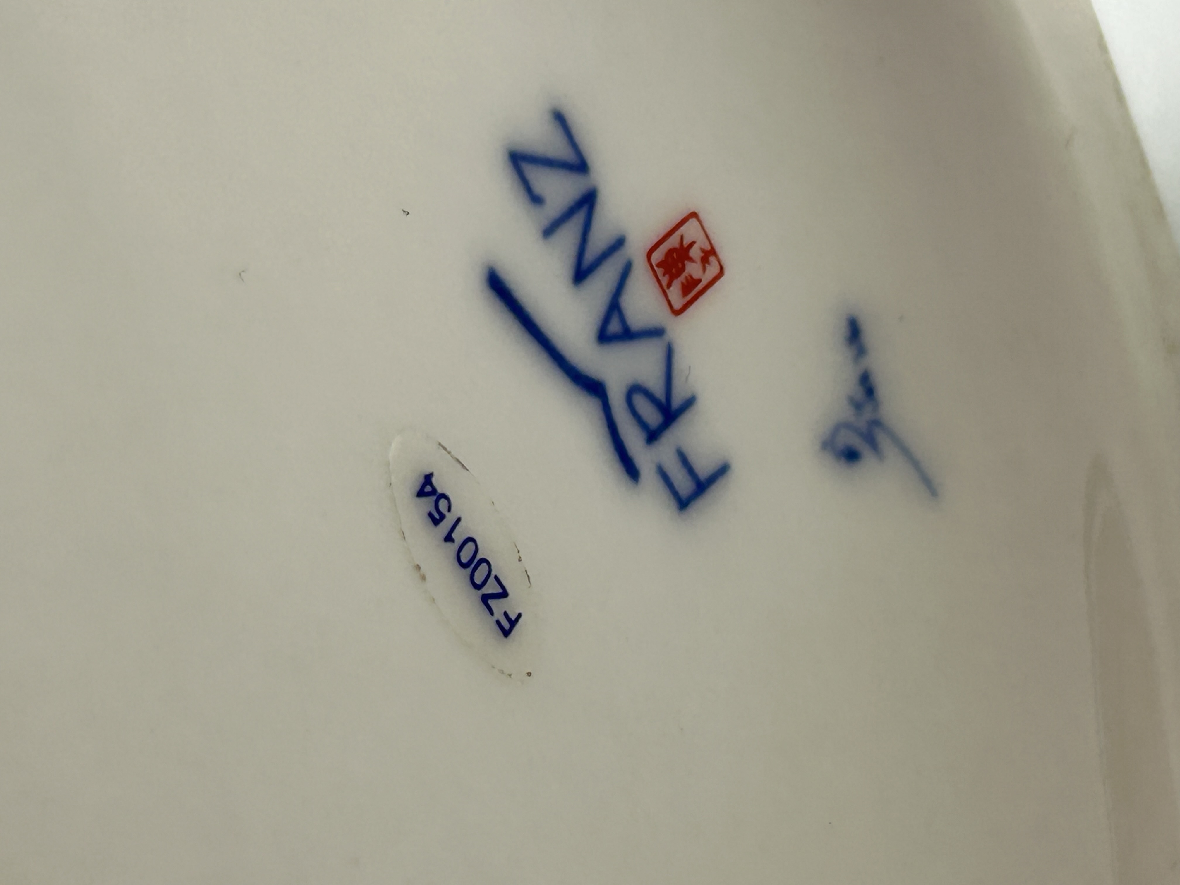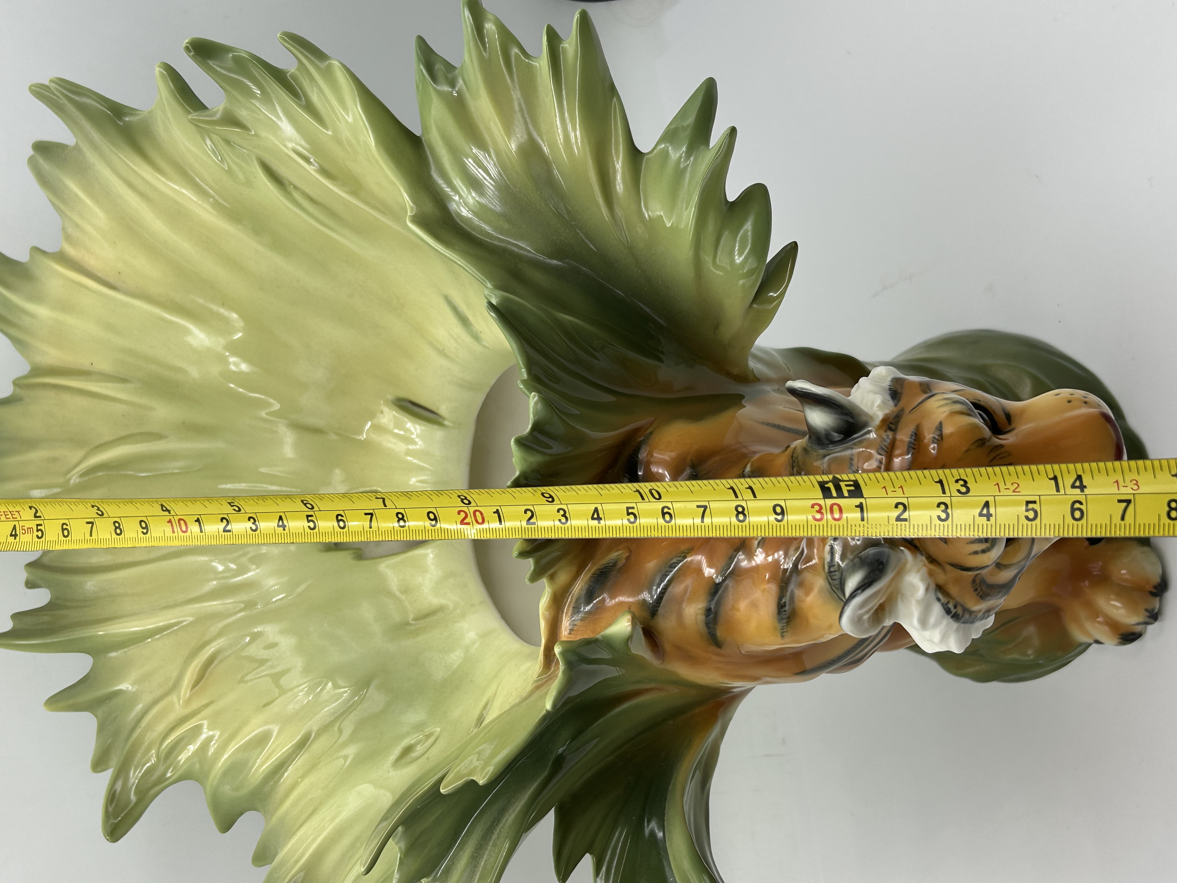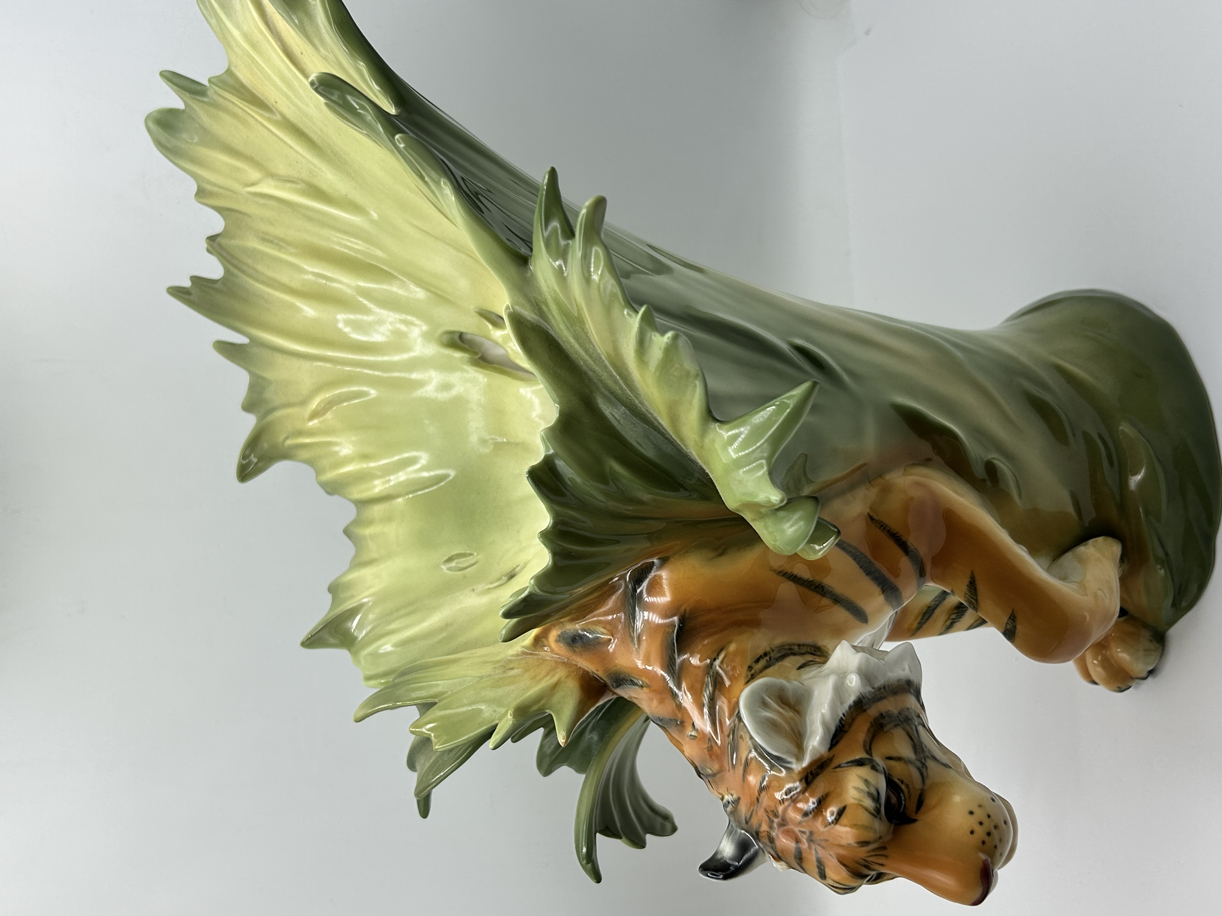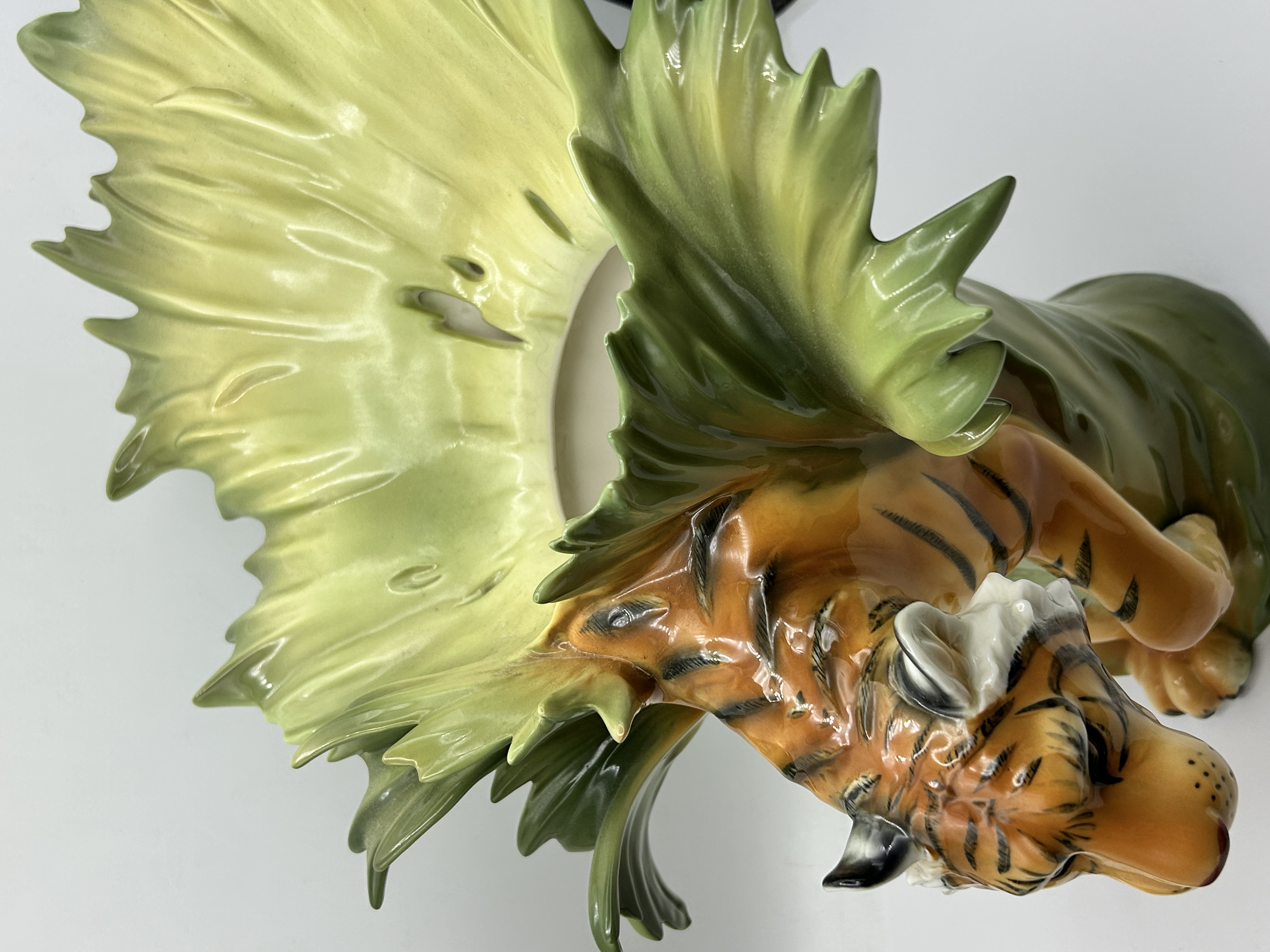 Franz Collection Jungle Beauties-Safari Tiger Vase, model number FZ00154. This porcelain sculptural vase features a three-dimensional tiger figure integrated into a composition of large, stylized green and yellow leaves. The item is finished with a high-gloss glaze. The underside of the base bears several markings, including the FRANZ name in blue underglaze, a red square seal chop mark, an additional blue underglaze signature, and an oval sticker with the model number FZ00154.