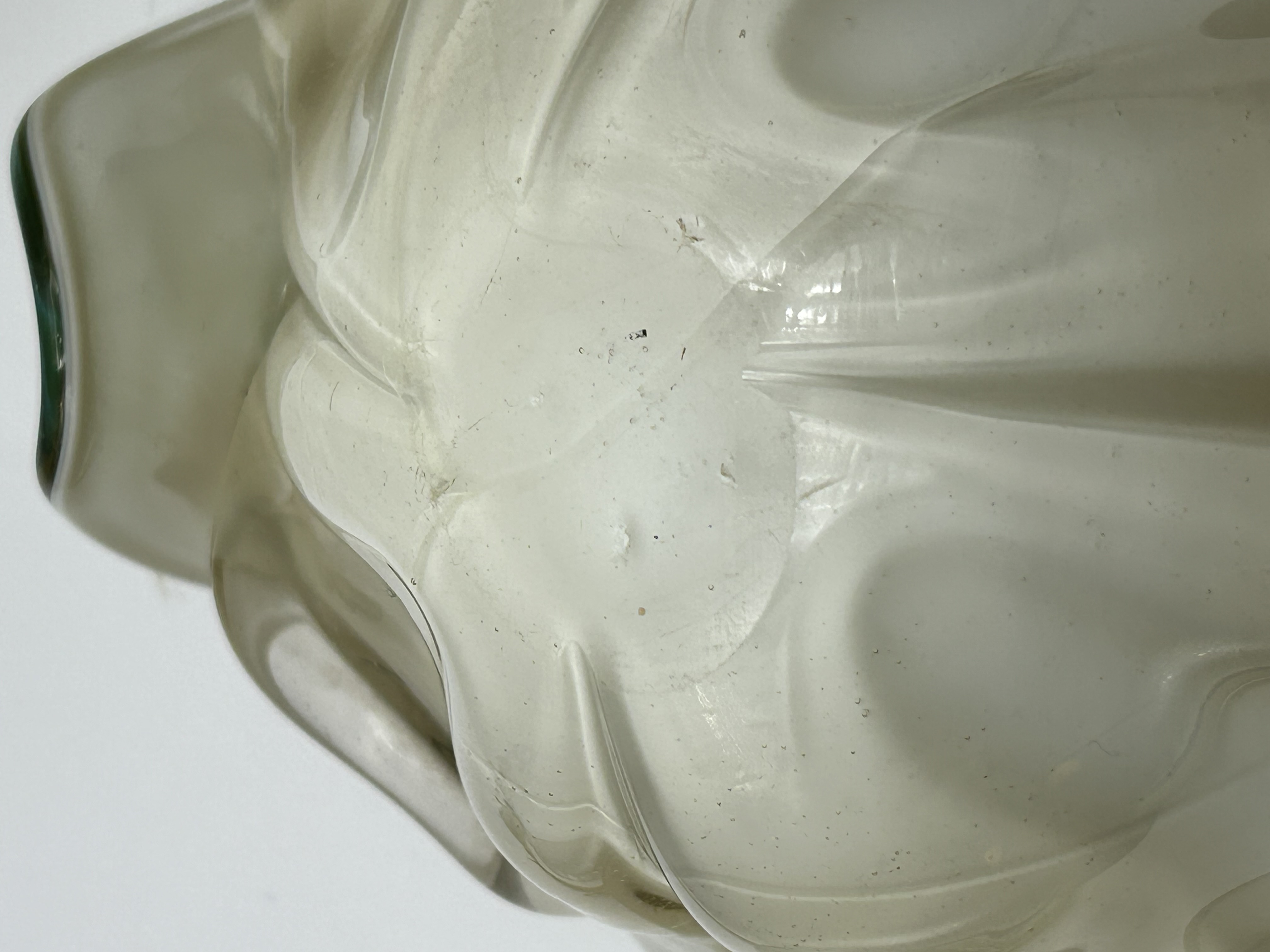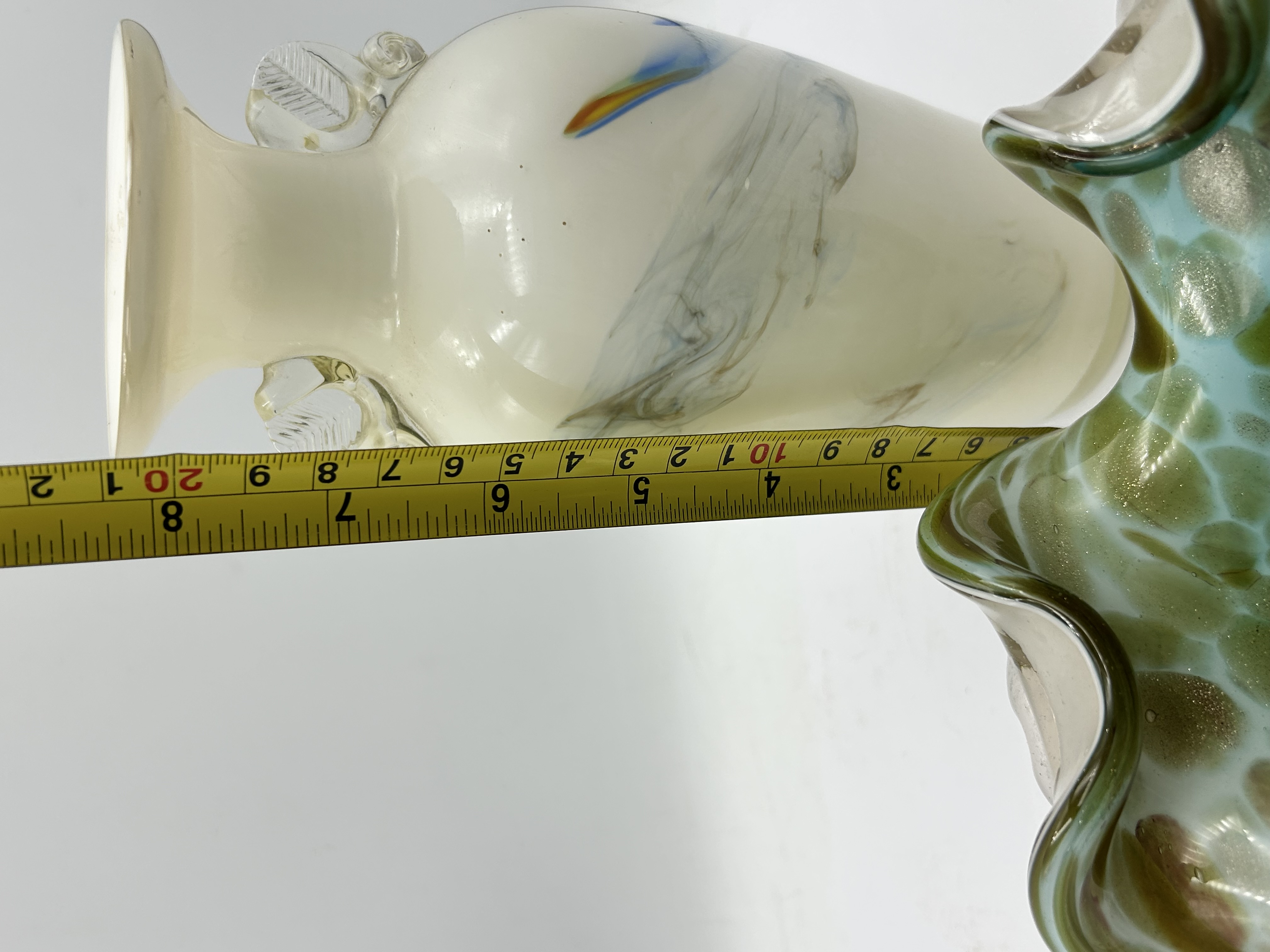 Two hand-blown art glass pieces attributed to Murano, Italy. The first item is a vase of ovoid form with a flared rim and twin applied clear glass handles. The body is composed of opaque cream-colored glass decorated with abstract swirls of blue and amber. The second item is a handkerchief-style bowl featuring a deeply ruffled rim. The bowl displays a mottled pattern of green, turquoise, and brown spots over a light-colored ground. The underside of the bowl exhibits a rough pontil mark, indicating hand-formed manufacture.