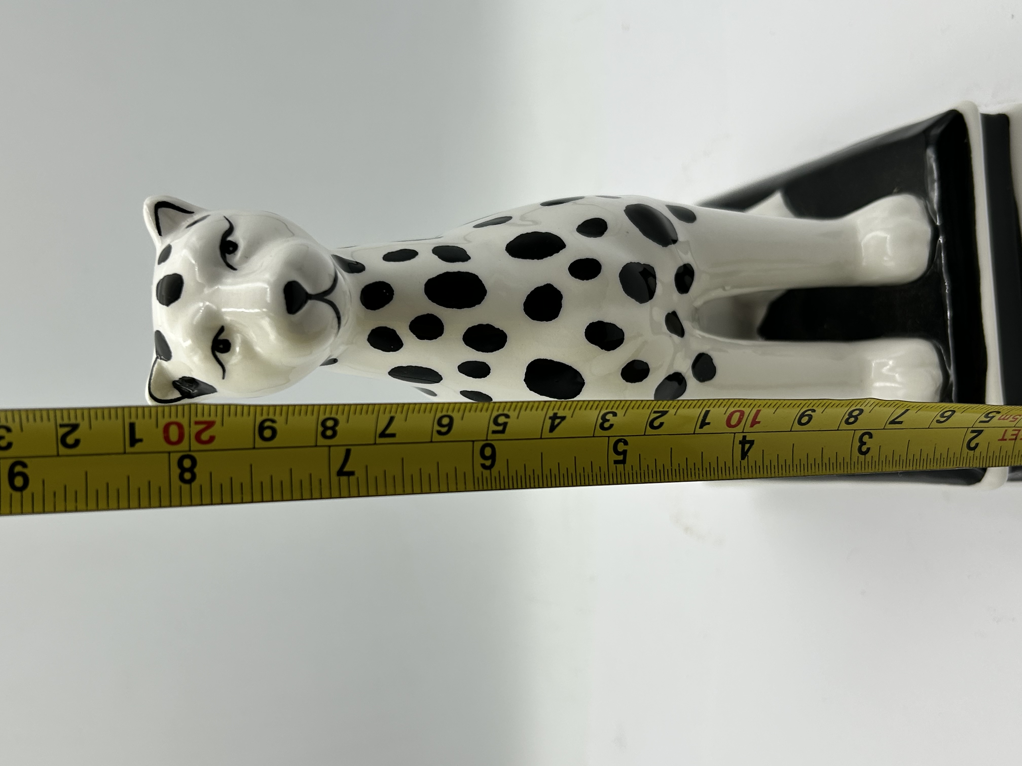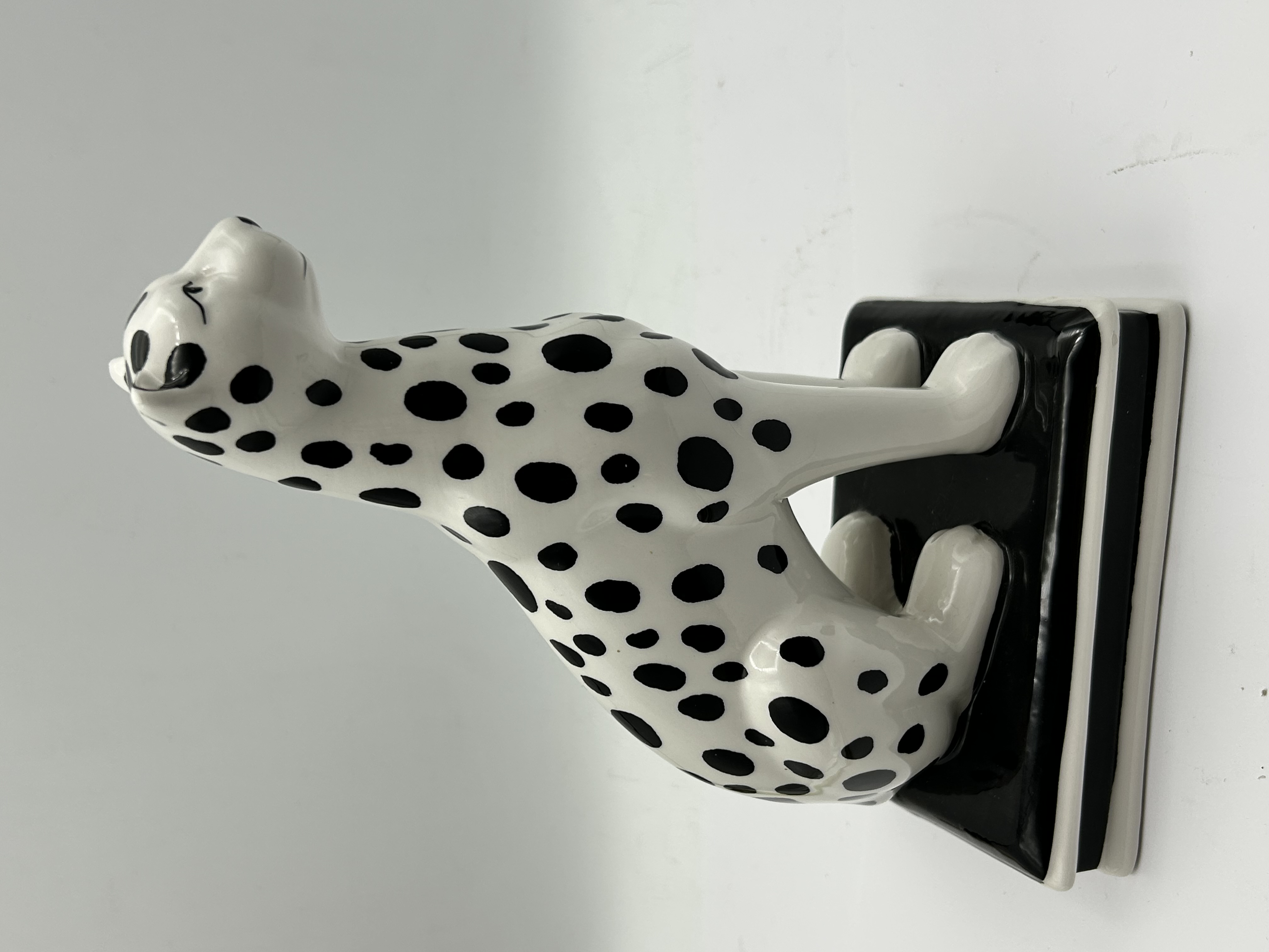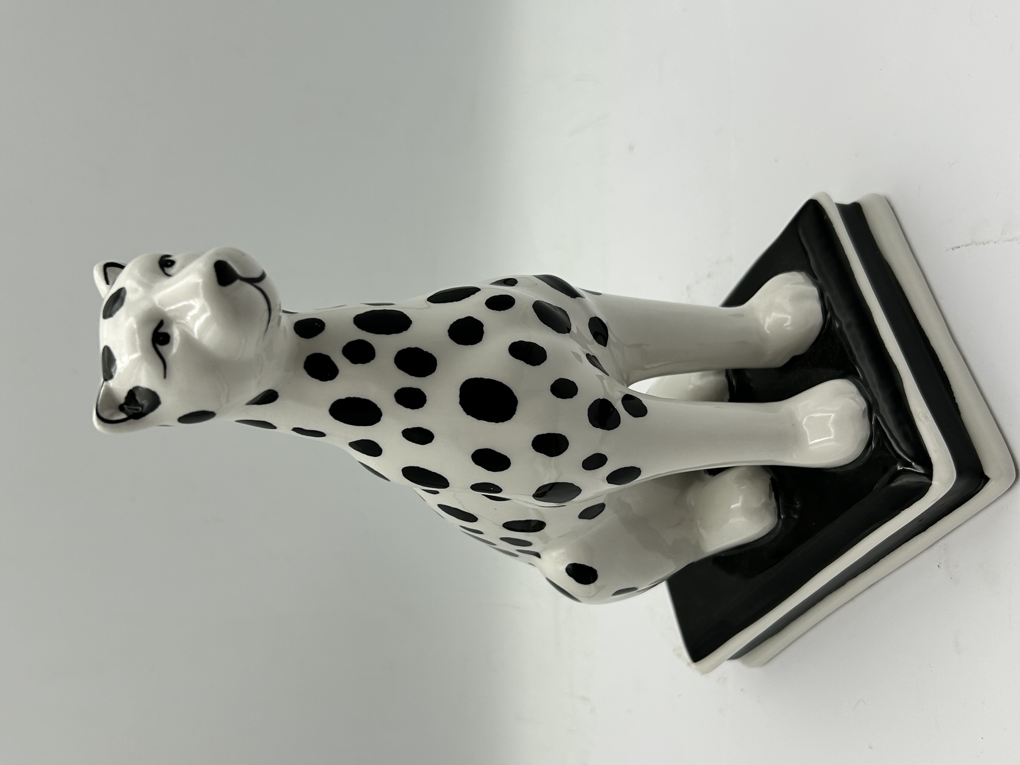 A stylized ceramic figurine depicting a seated big cat, such as a leopard or cheetah. The piece features a high-contrast black-and-white spotted glaze over a white ground. The animal is rendered in an upright, attentive pose with elongated anatomical features and minimalist facial details. It stands upon an integral stepped rectangular base finished in coordinating black and white glazes. The entire surface exhibits a uniform glossy finish.