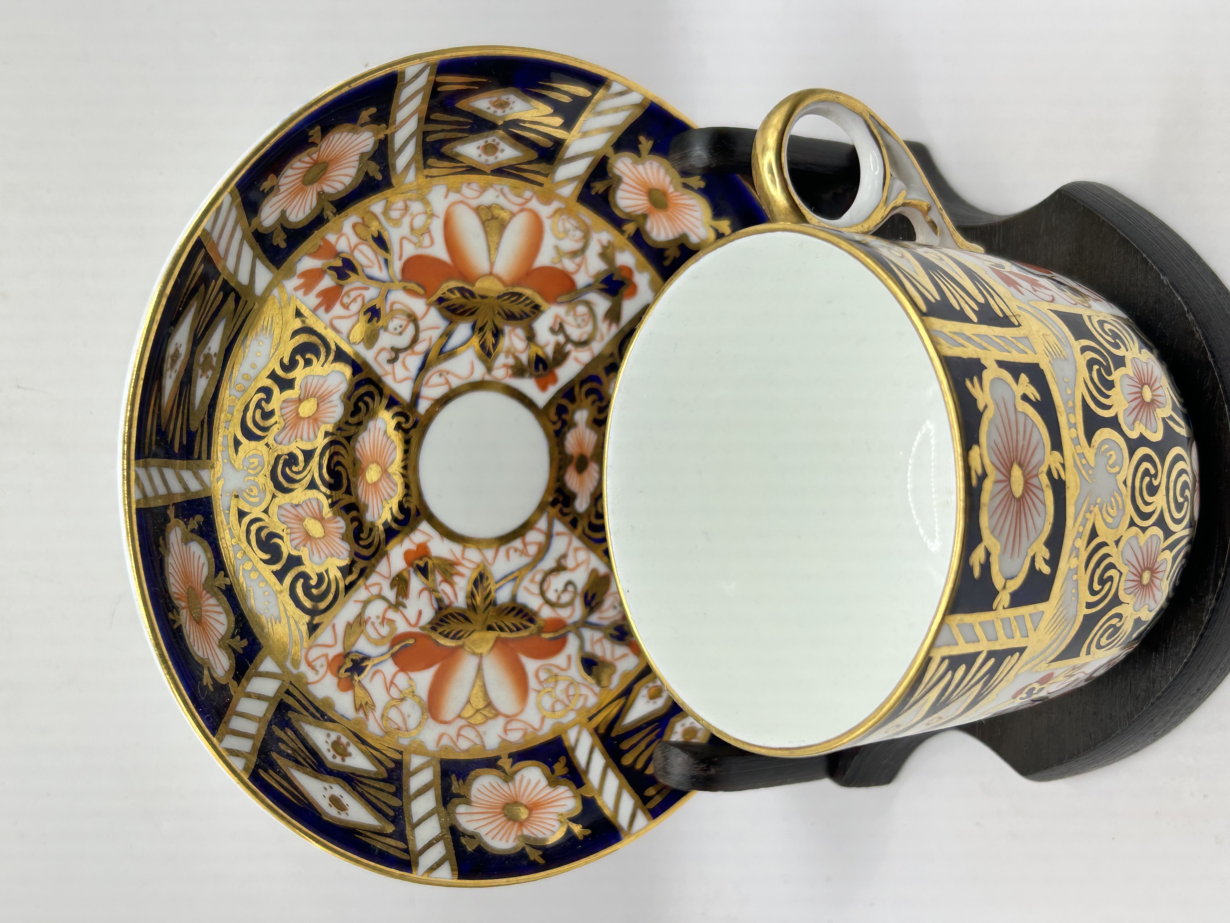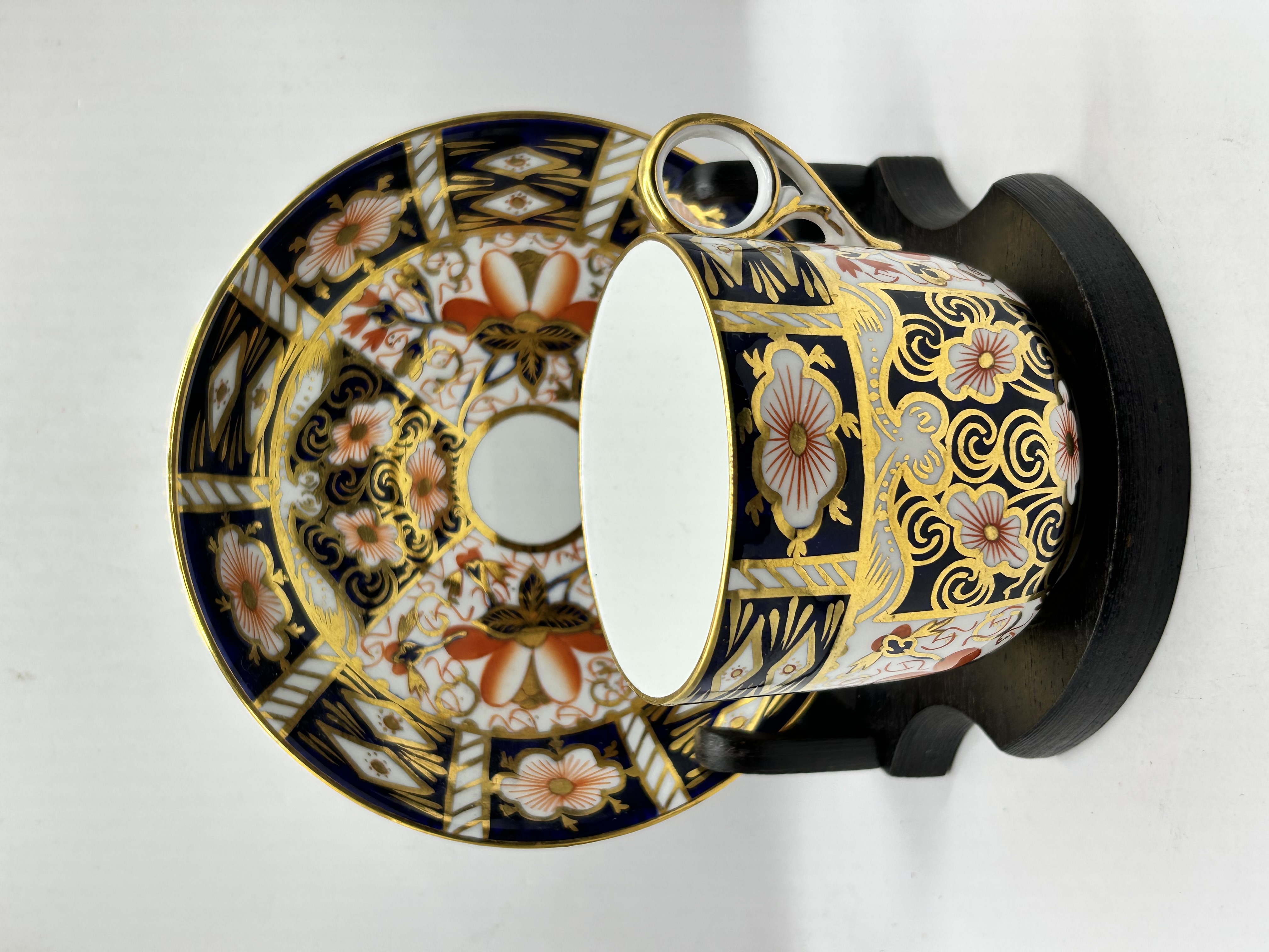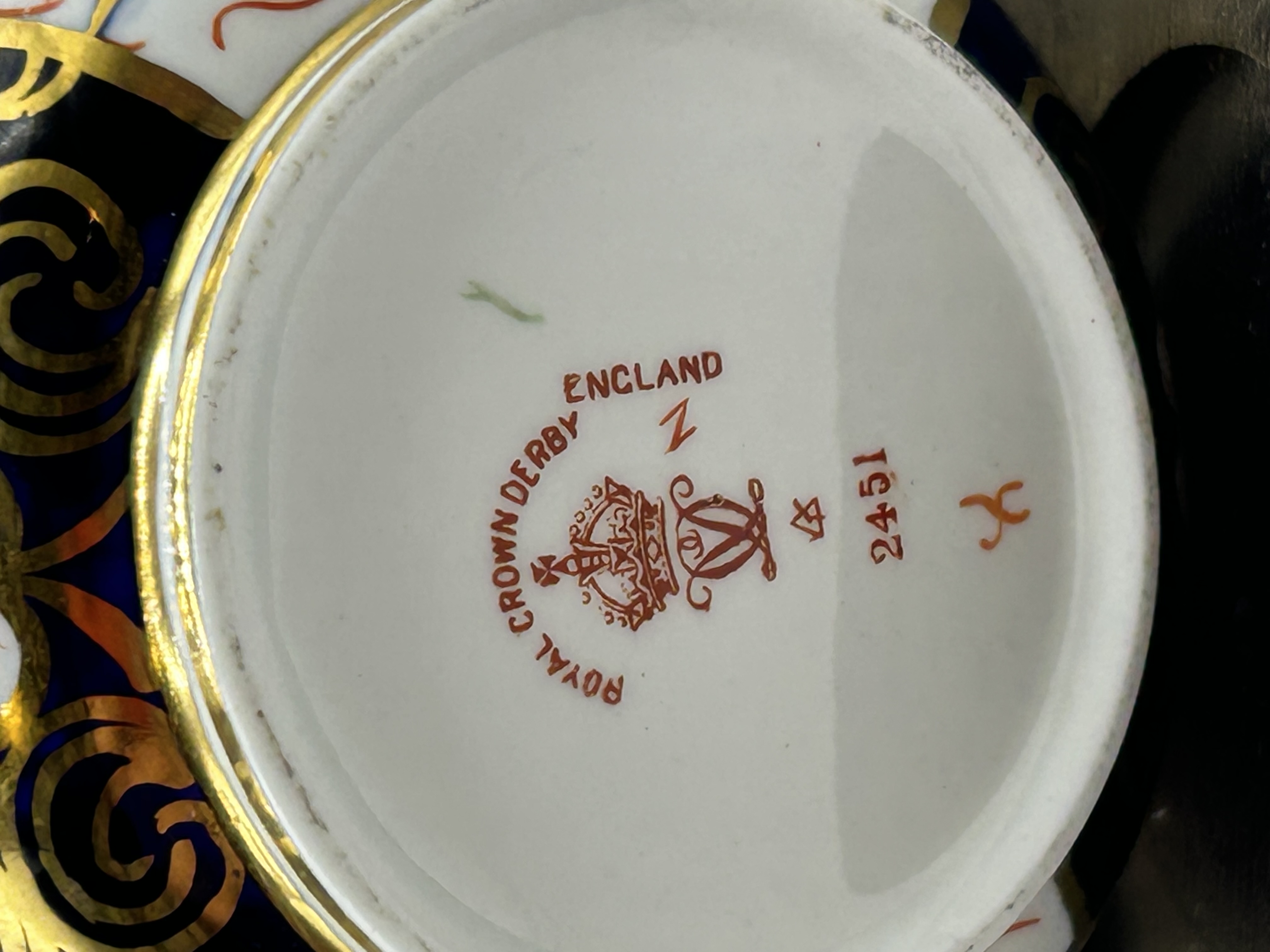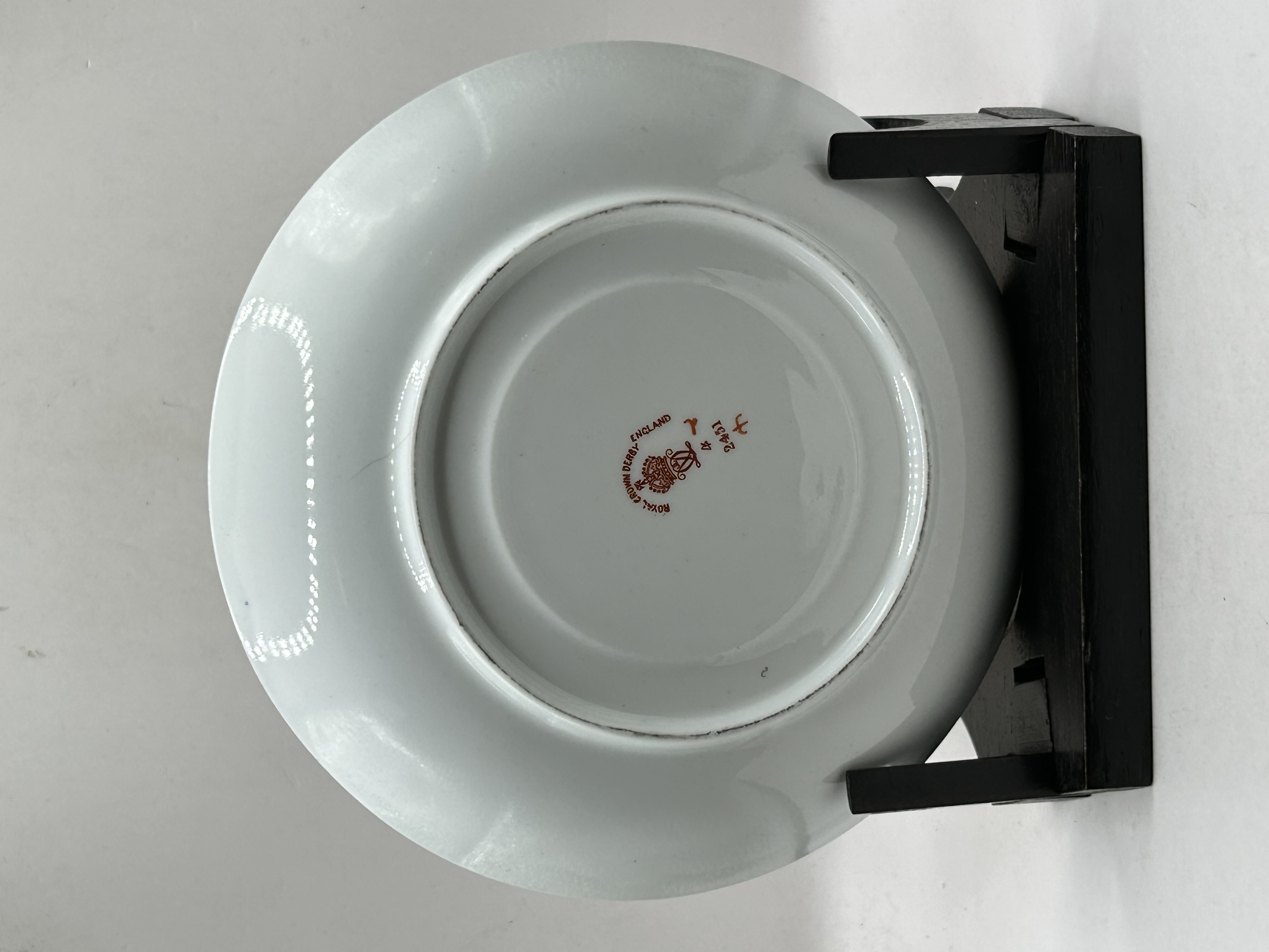 This porcelain demitasse flat cup and saucer are produced by Royal Crown Derby in the Traditional Imari pattern, number 2451. The decoration features a palette of cobalt blue, iron red, and gold gilding with floral and geometric panels. The undersides of both pieces bear the red Royal Crown Derby England backstamp with a crown over a double-D cypher, the pattern number 2451, and various year and painter marks. The items are displayed on a dark wooden stand.