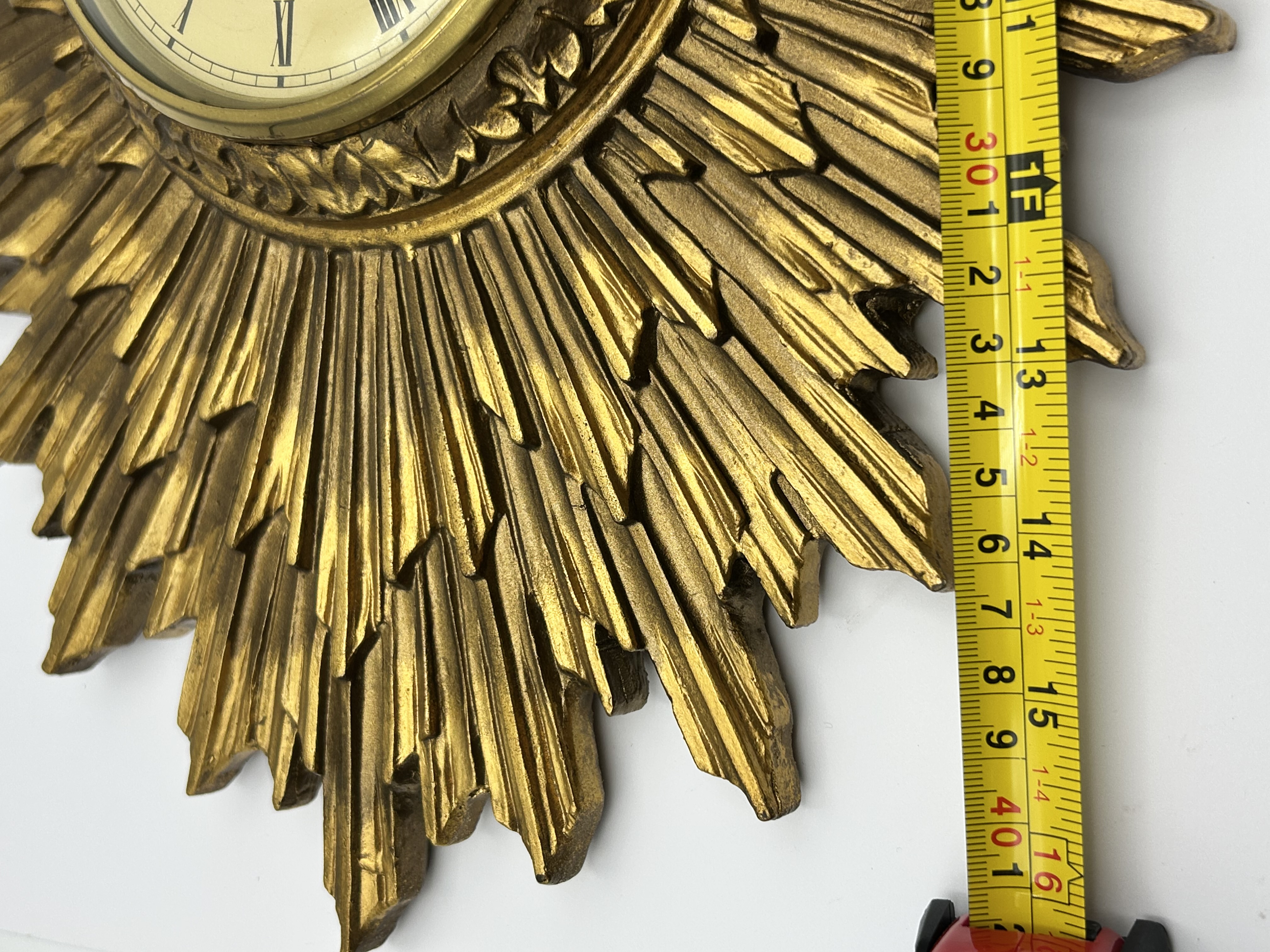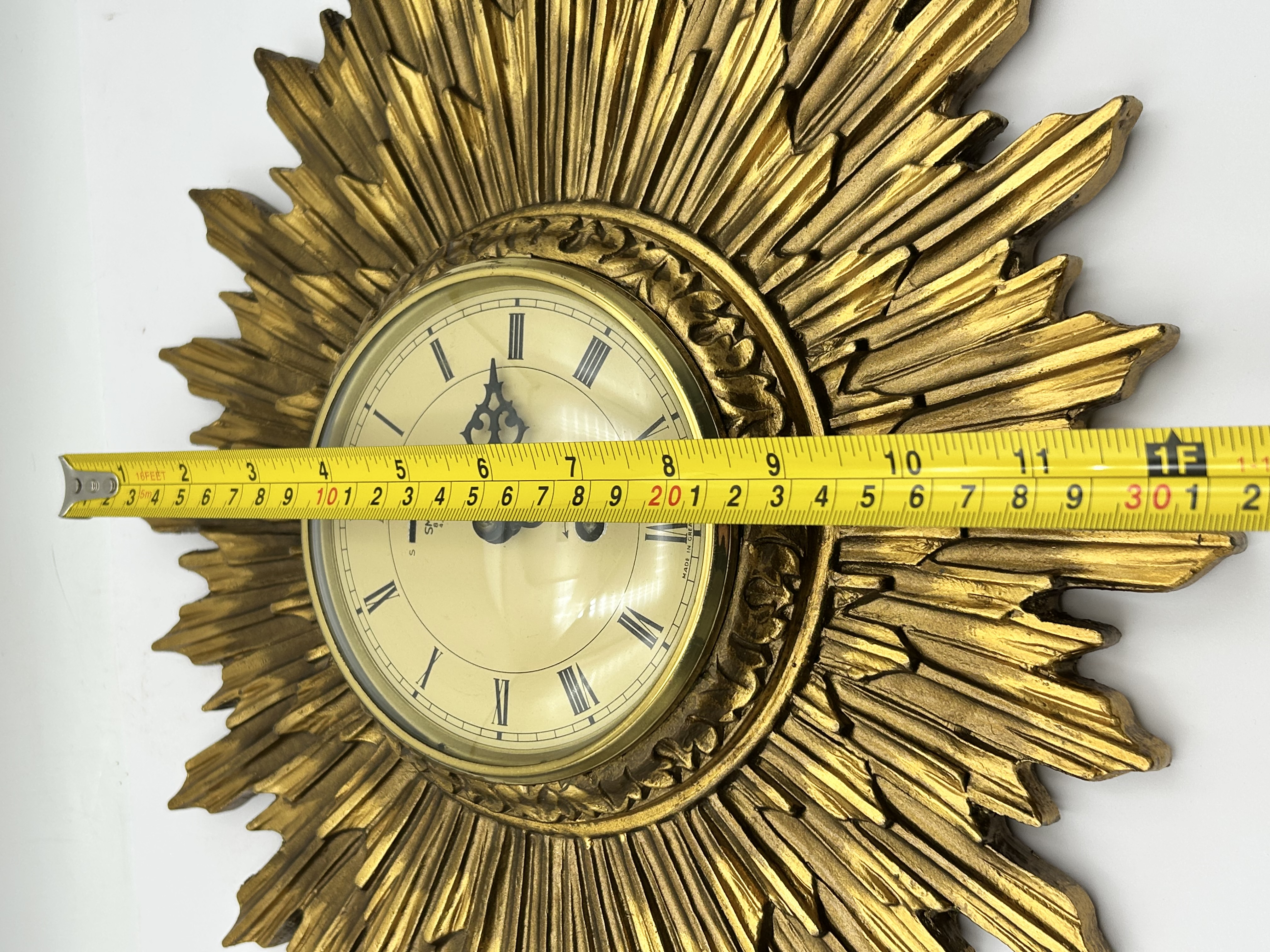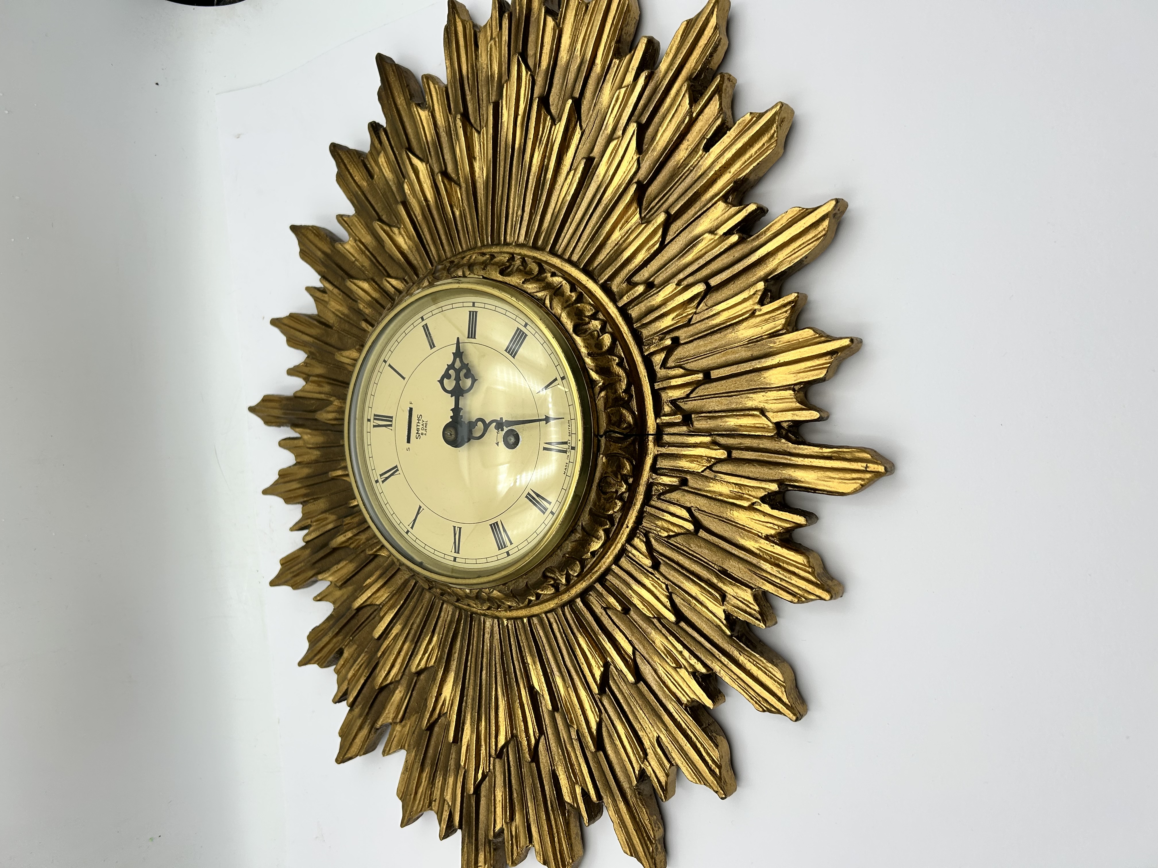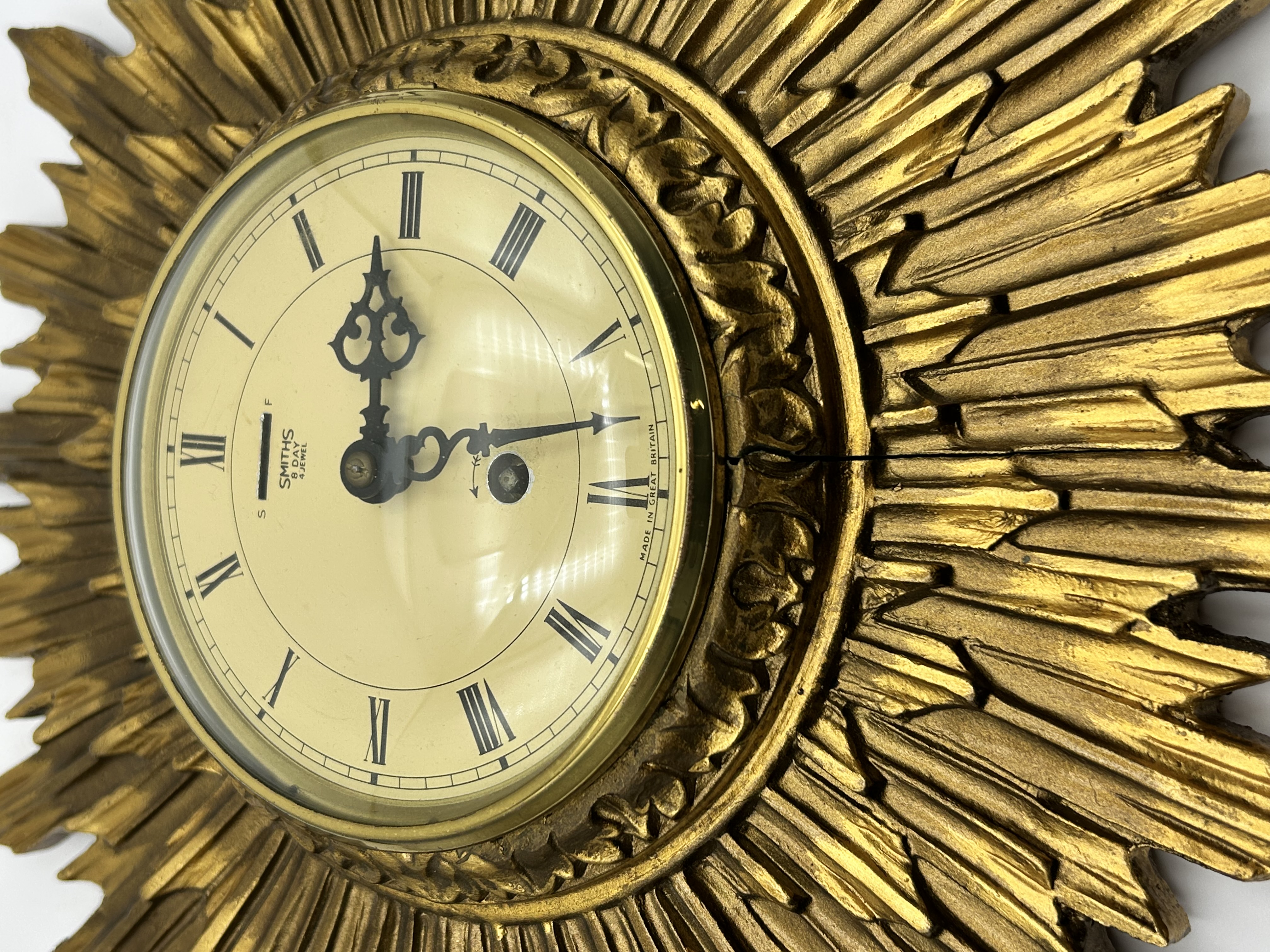 A mid-century modern sunburst wall clock featuring a gilded, multi-rayed frame. The central clock face is set behind glass, featuring black Roman numerals on a cream-colored dial with ornate black hands. The dial is marked SMITHS 8 DAY 4 JEWELS and MADE IN GREAT BRITAIN, and includes a FAST/SLOW adjustment indicator. The frame is finished in a gold-tone gilt with a decorative foliate inner border. The construction consists of a molded frame with radiating rays of staggered lengths, creating a starburst effect characteristic of the period. This style of clock is frequently associated with mid-century manufacturers such as Welby.