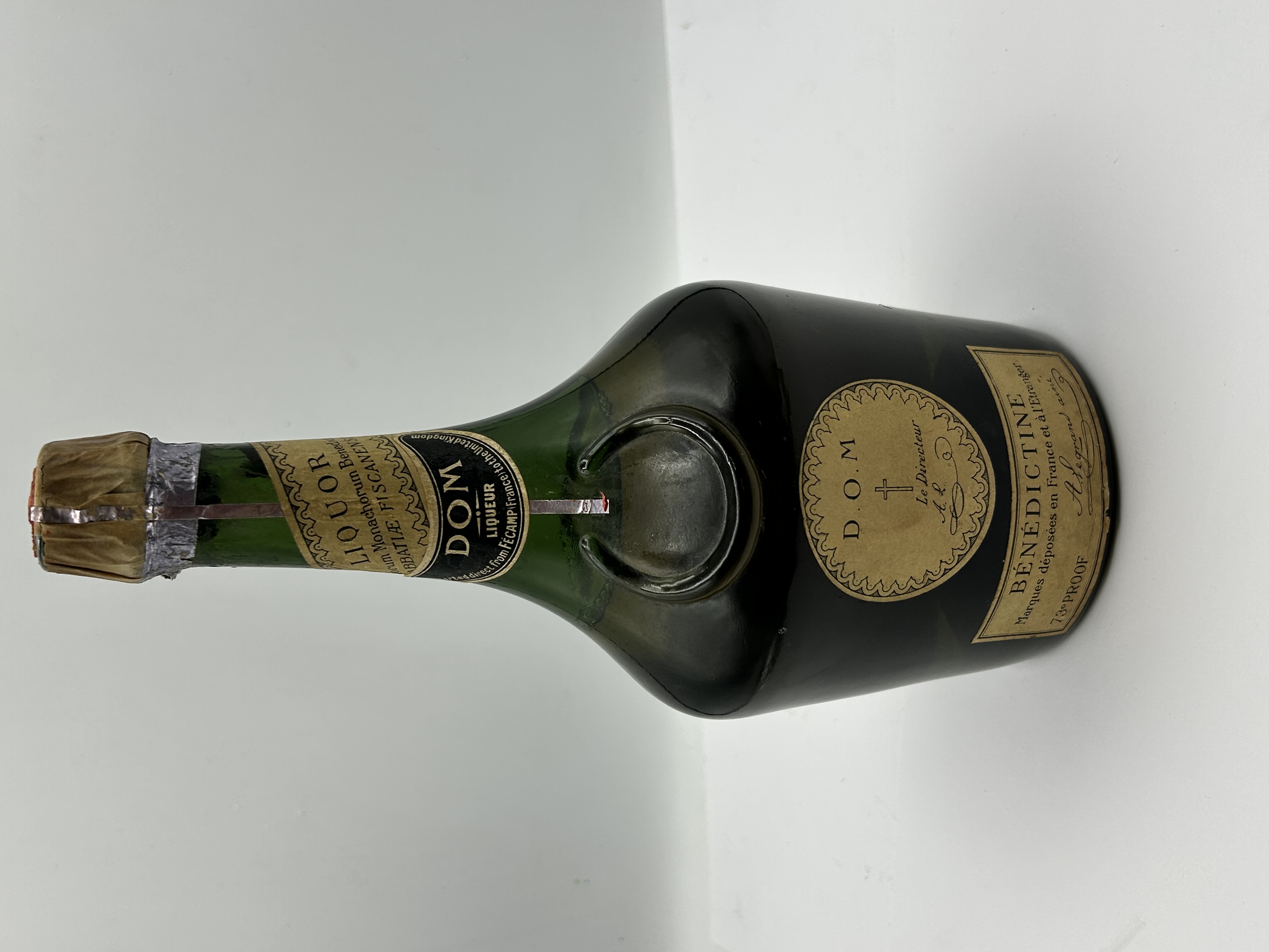 A single vintage bottle of Bénédictine D.O.M. herbal liqueur, produced in Fécamp, France. The bottle is composed of dark green glass and retains its original cream and gold-toned paper labels. The primary label displays the brand name, the D.O.M. abbreviation, and the signature of A. Legrand aîné. The strength is indicated as 73° Proof. A small black circular label specifies the bottle was imported from Fécamp for the United Kingdom market. The neck features a historical label and remains sealed with a cork under the original paper and foil capsule.