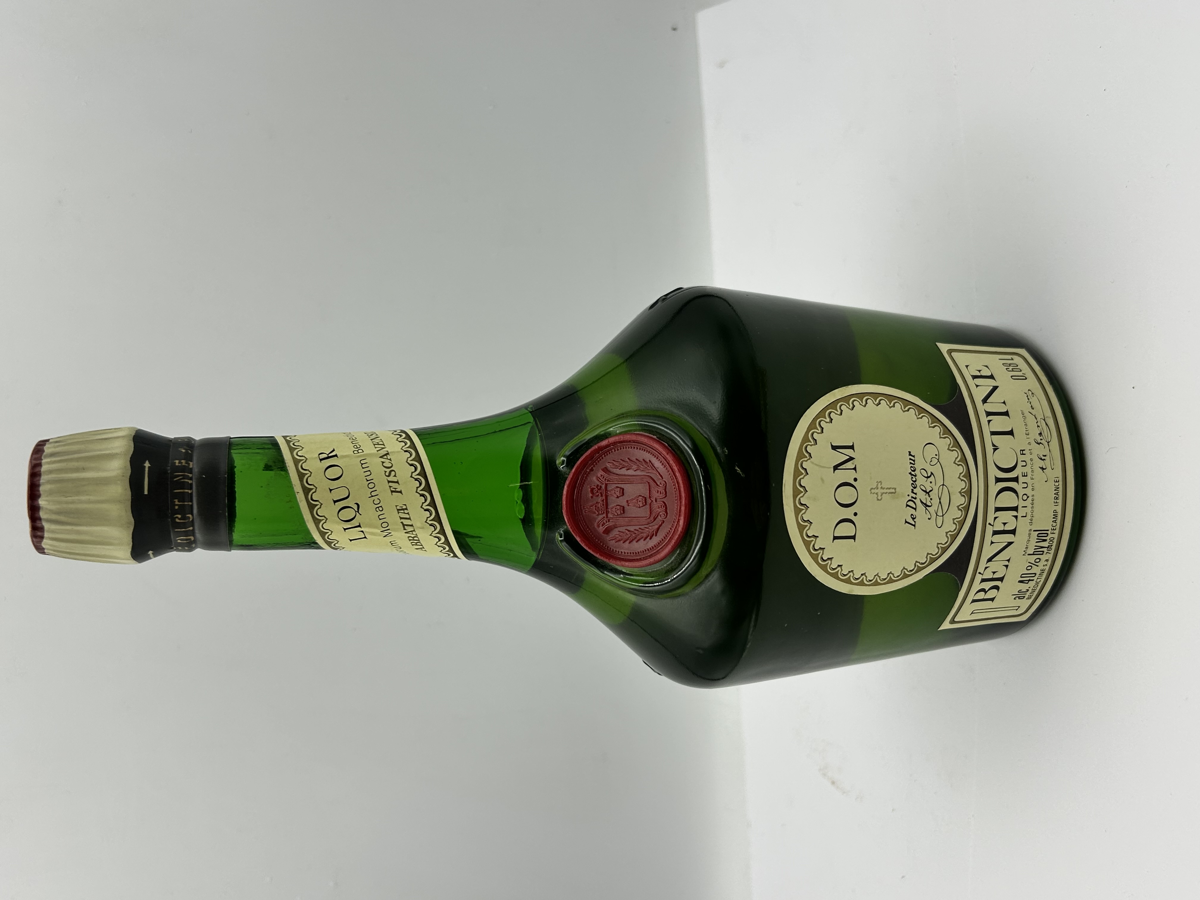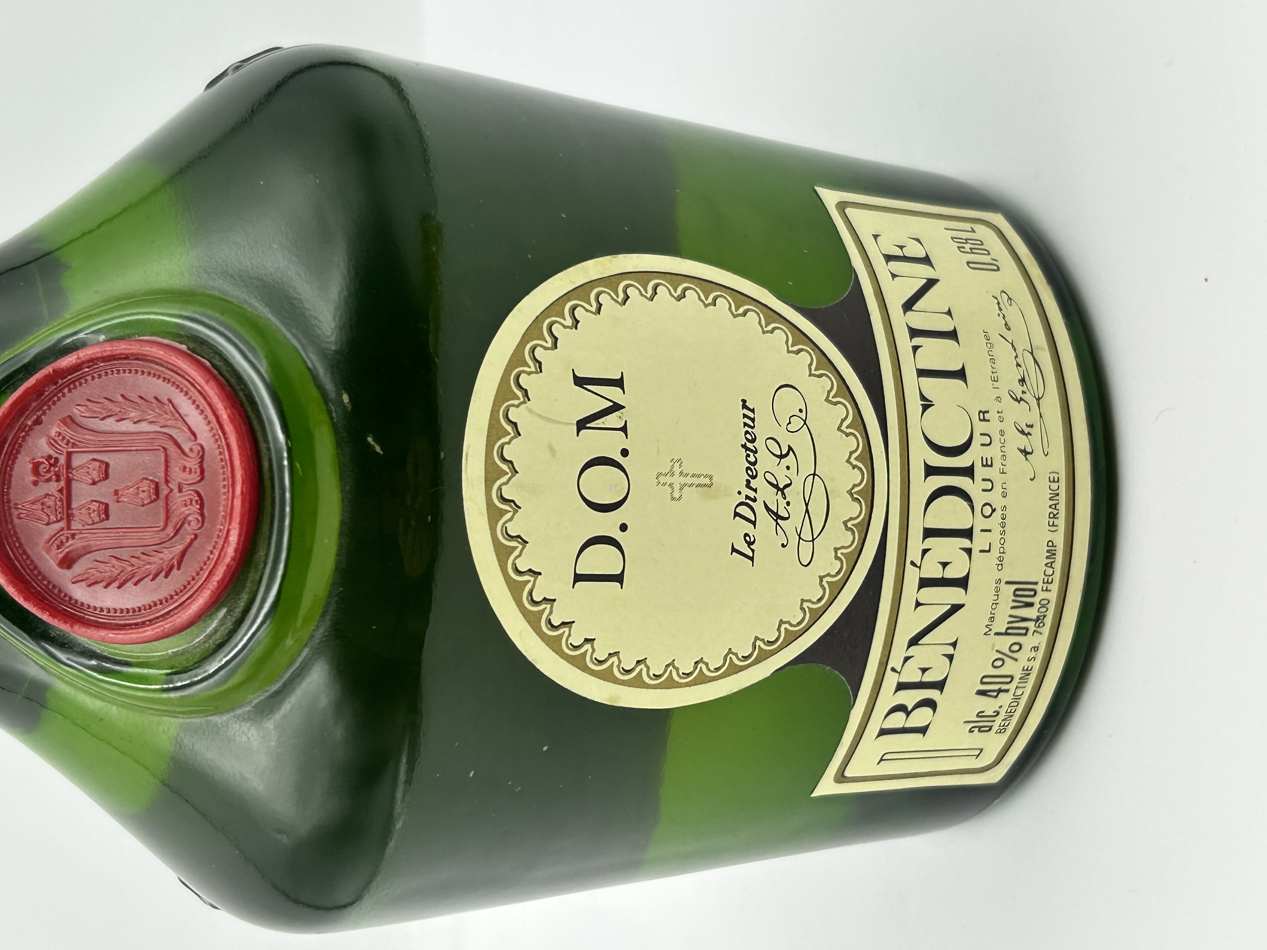 A single bottle of Bénédictine D.O.M. herbal liqueur produced by Bénédictine S.A. in Fécamp, France. The liqueur is housed in a dark green glass bottle. The primary cream-colored label displays black and gold-tone text including the D.O.M. acronym, the brand name, and the Le Directeur signature. A secondary label on the neck contains Latin text referencing the Abbey of Fécamp. A red faux-wax seal is embossed with a coat of arms on the shoulder of the bottle. The vessel is sealed with an original white-colored cap.
