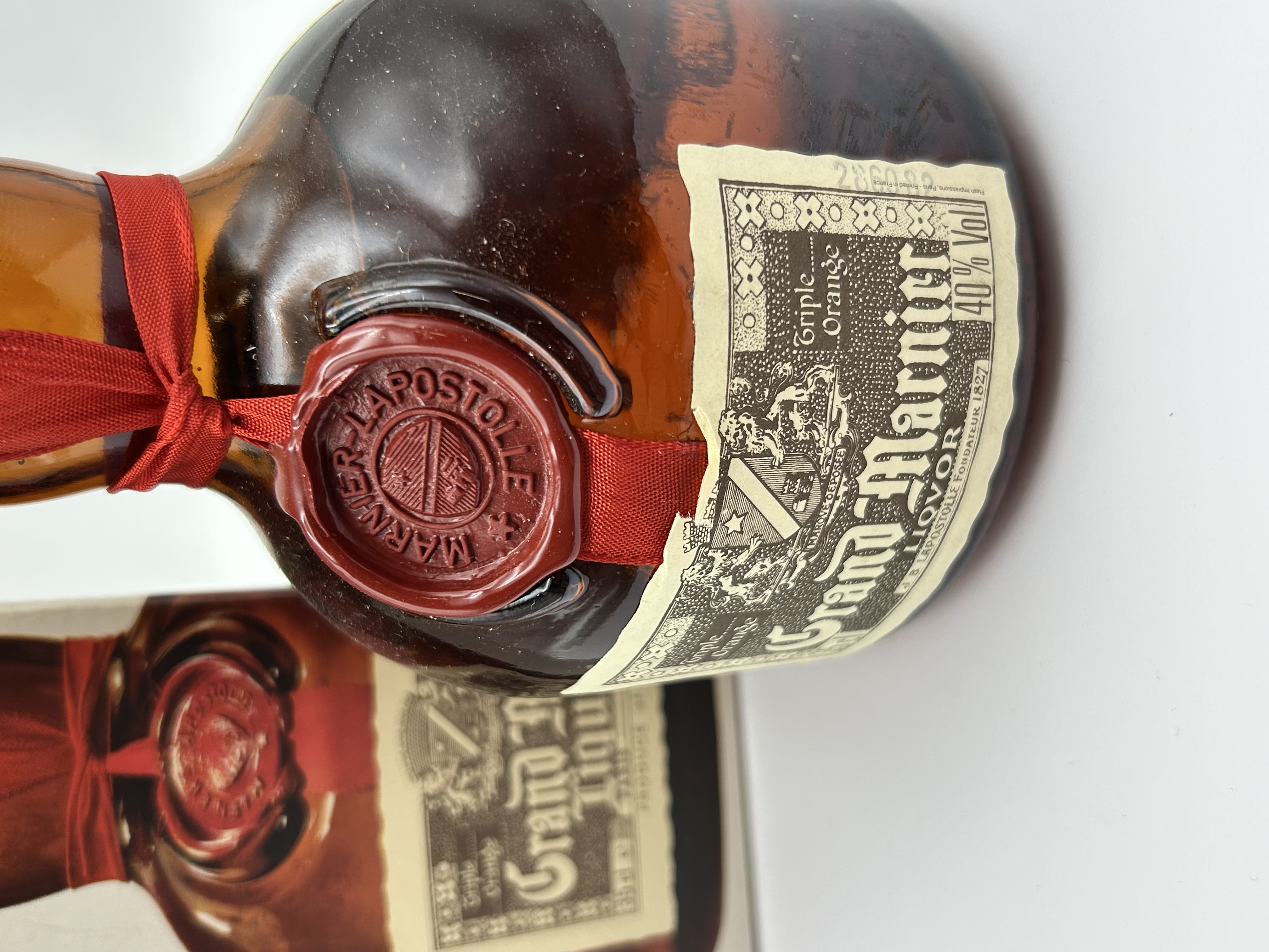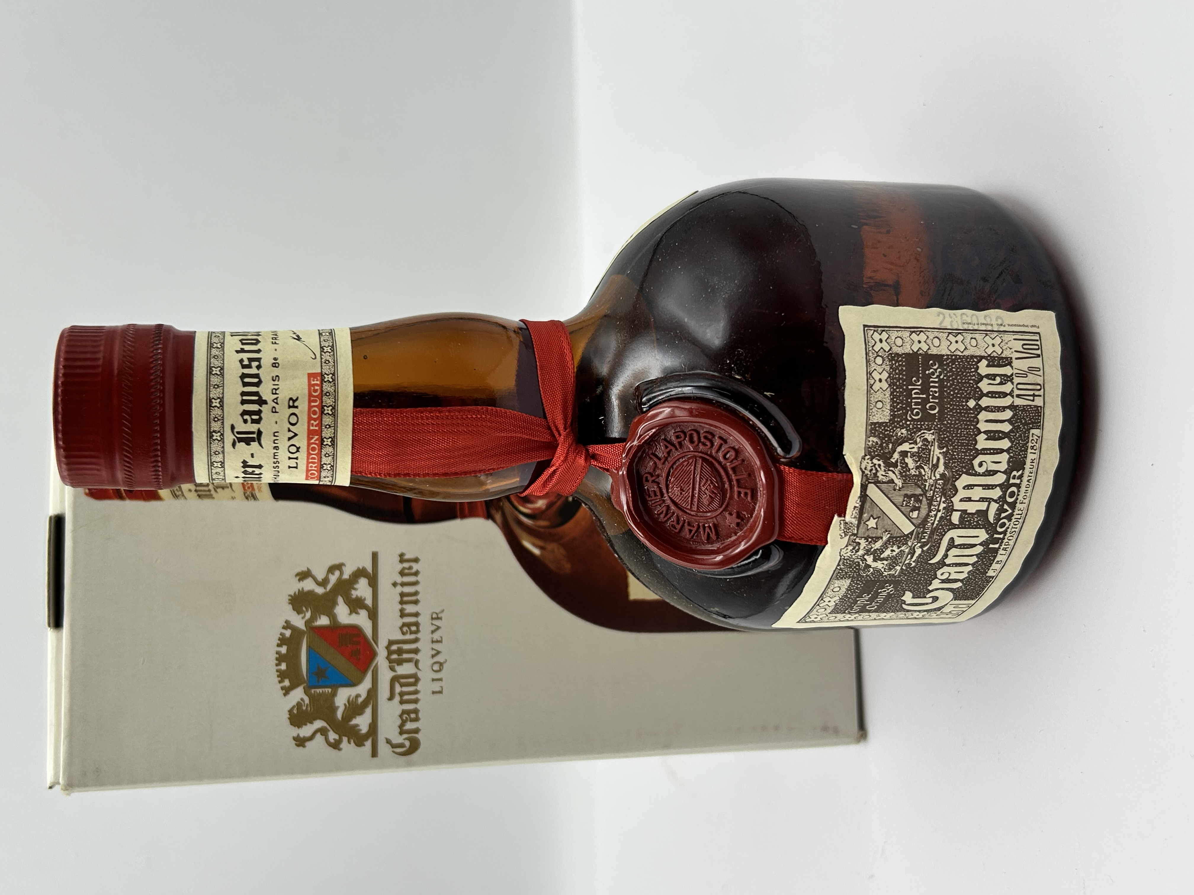 A bottle of Grand Marnier Cordon Rouge Triple Orange liqueur produced by Marnier-Lapostolle, presented in its original cardboard packaging. The amber glass bottle features the brand signature red ribbon and a red wax seal embossed with the Marnier-Lapostolle crest. The main paper label displays the Grand Marnier LIQVOR name in stylized script and specifies a 40 percent alcohol volume. The neck label identifies the producer as Marnier-Lapostolle, Paris 8e, France, and references the founding year of 1827. The bottle is sealed with a red screw cap.