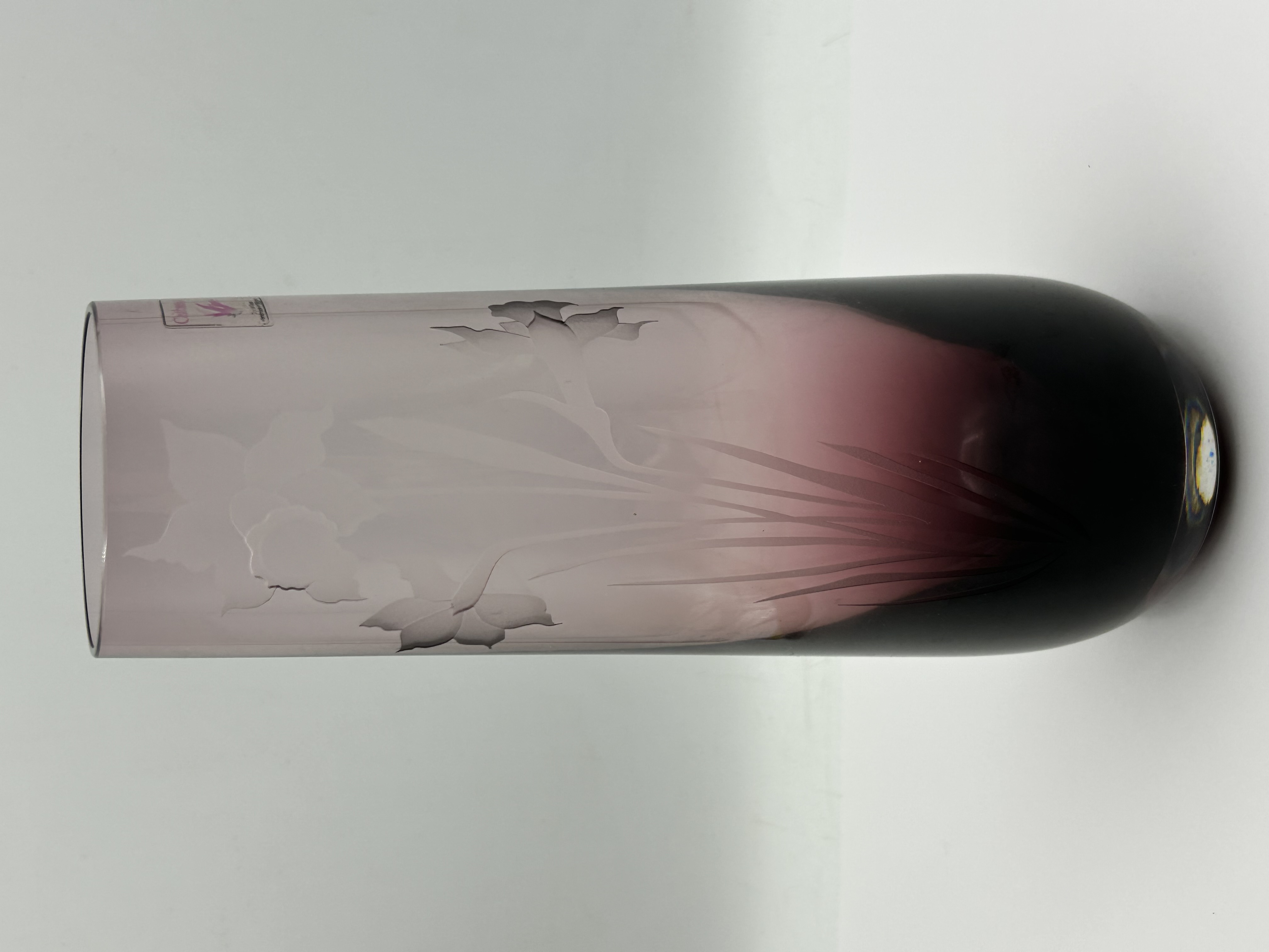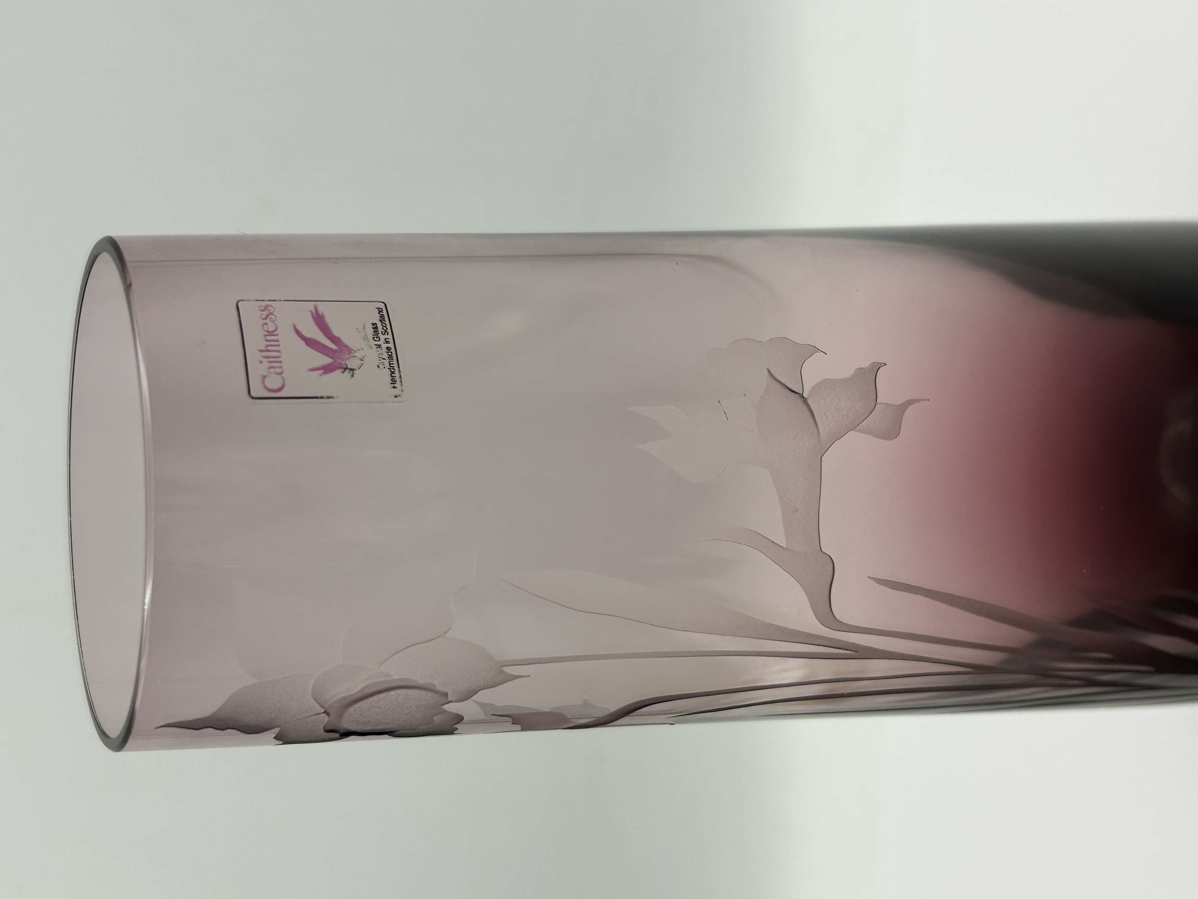 A Caithness crystal glass vase of cylindrical form with a weighted base. The vessel features a gradient color transition from a translucent smoky mauve at the rim to a deep, opaque dark purple at the base. The exterior is decorated with an intaglio-etched floral motif depicting long-petaled lilies and slender foliage. An original adhesive label is affixed near the rim, reading Caithness and Crystal Glass Handmade in Scotland.