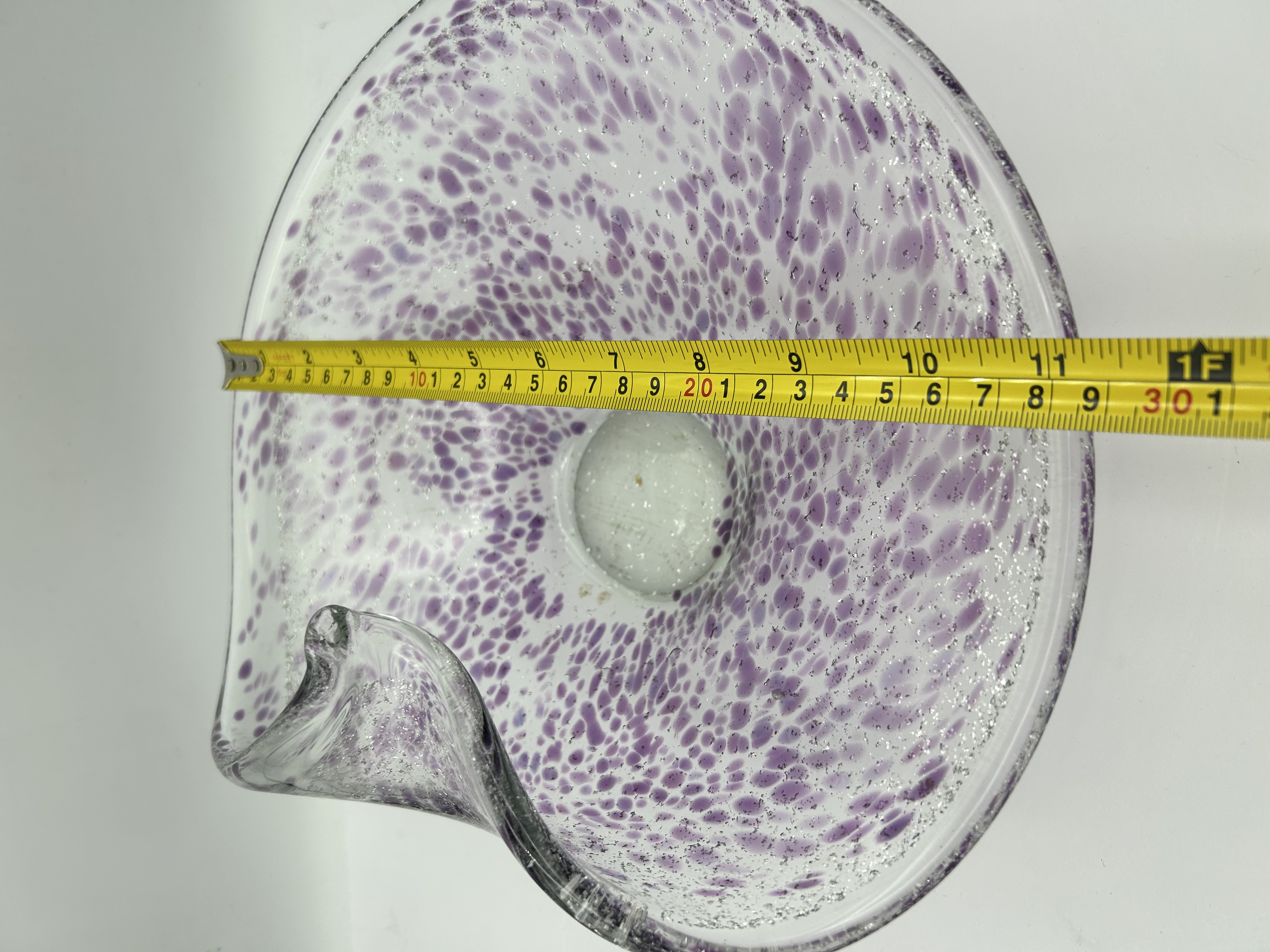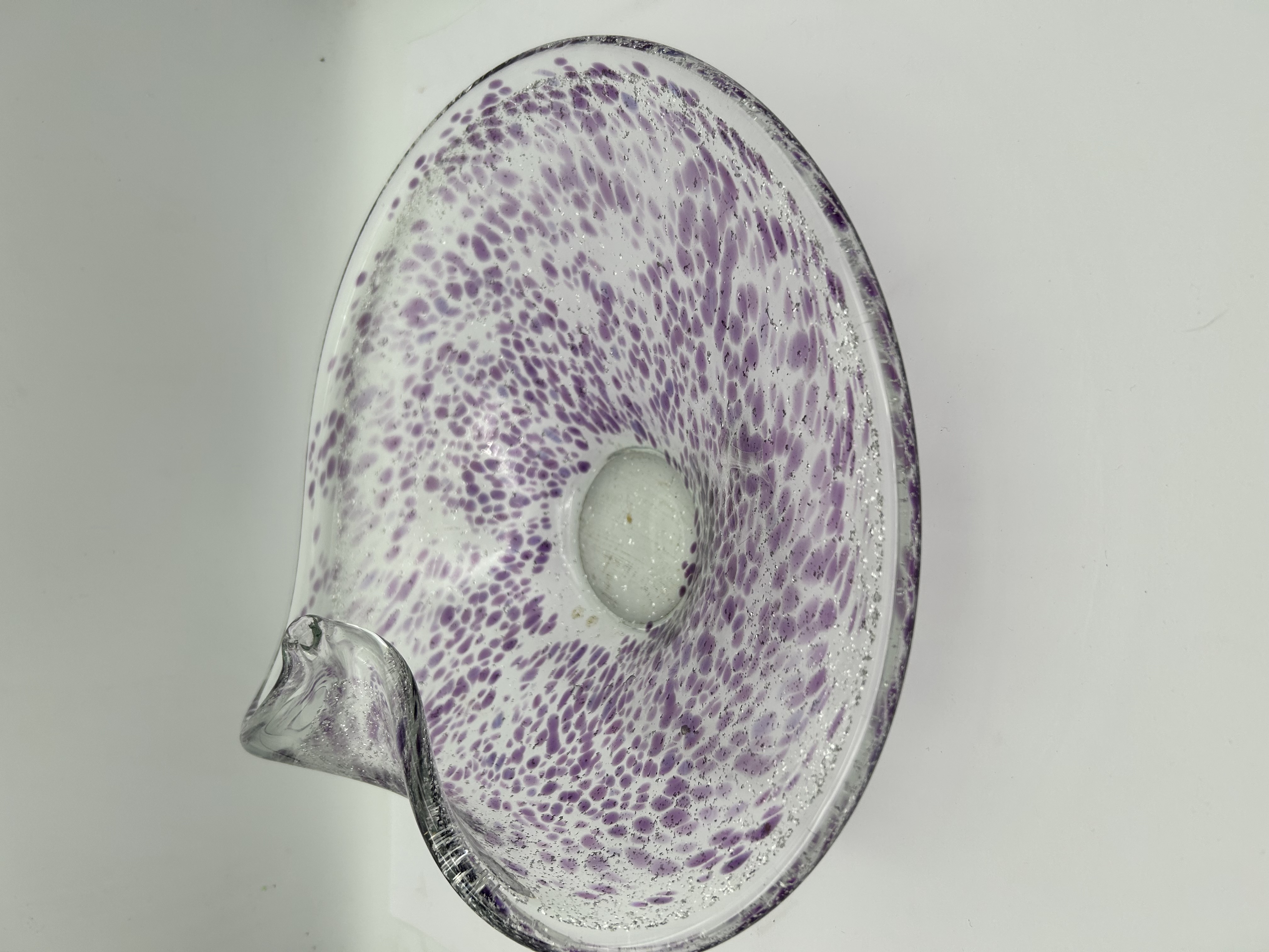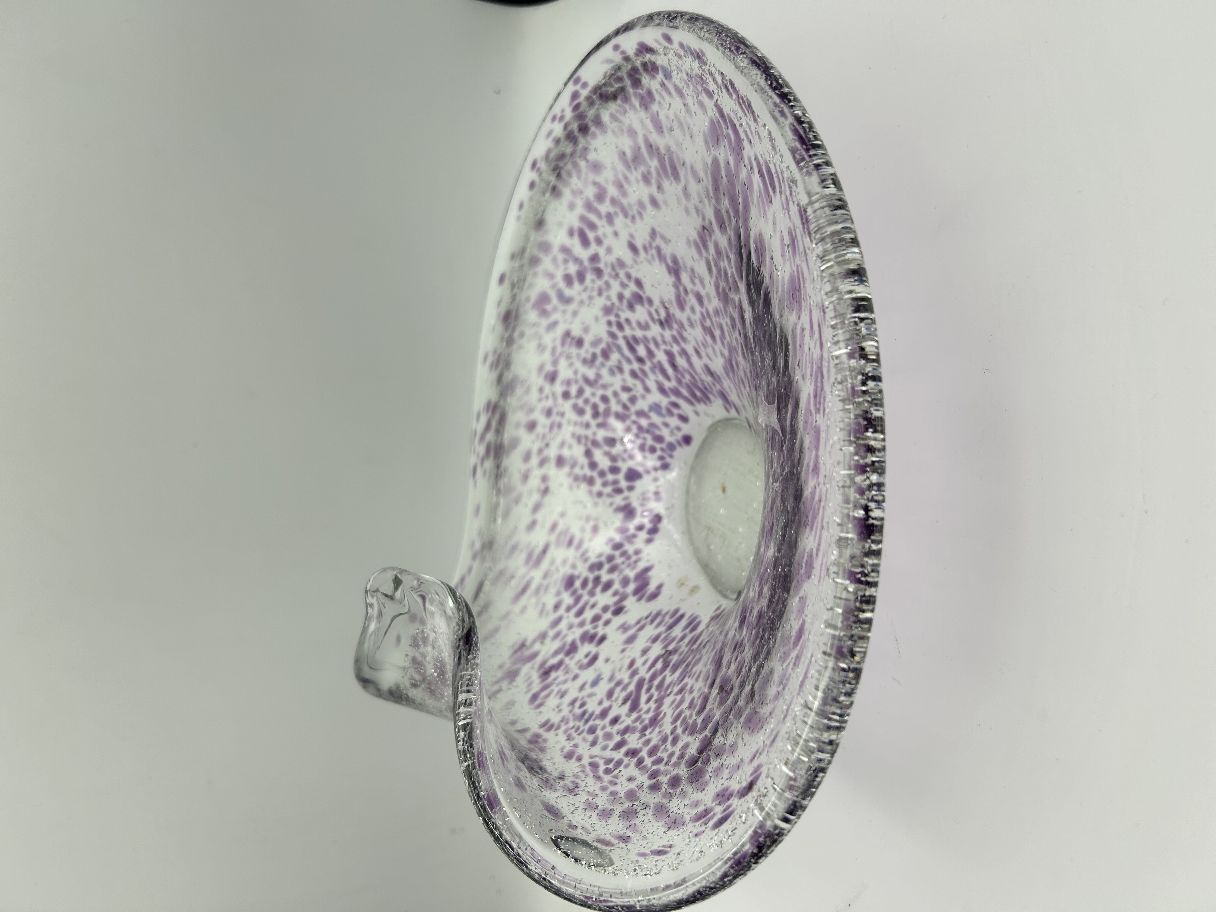 A large hand-blown studio art glass bowl of organic, free-form design featuring a single curled rim. The clear glass body contains internal purple spatter frit inclusions and a dense field of controlled seed bubbles throughout. The bowl is supported by a solid, clear glass circular base. No maker’s marks or signatures are visible.