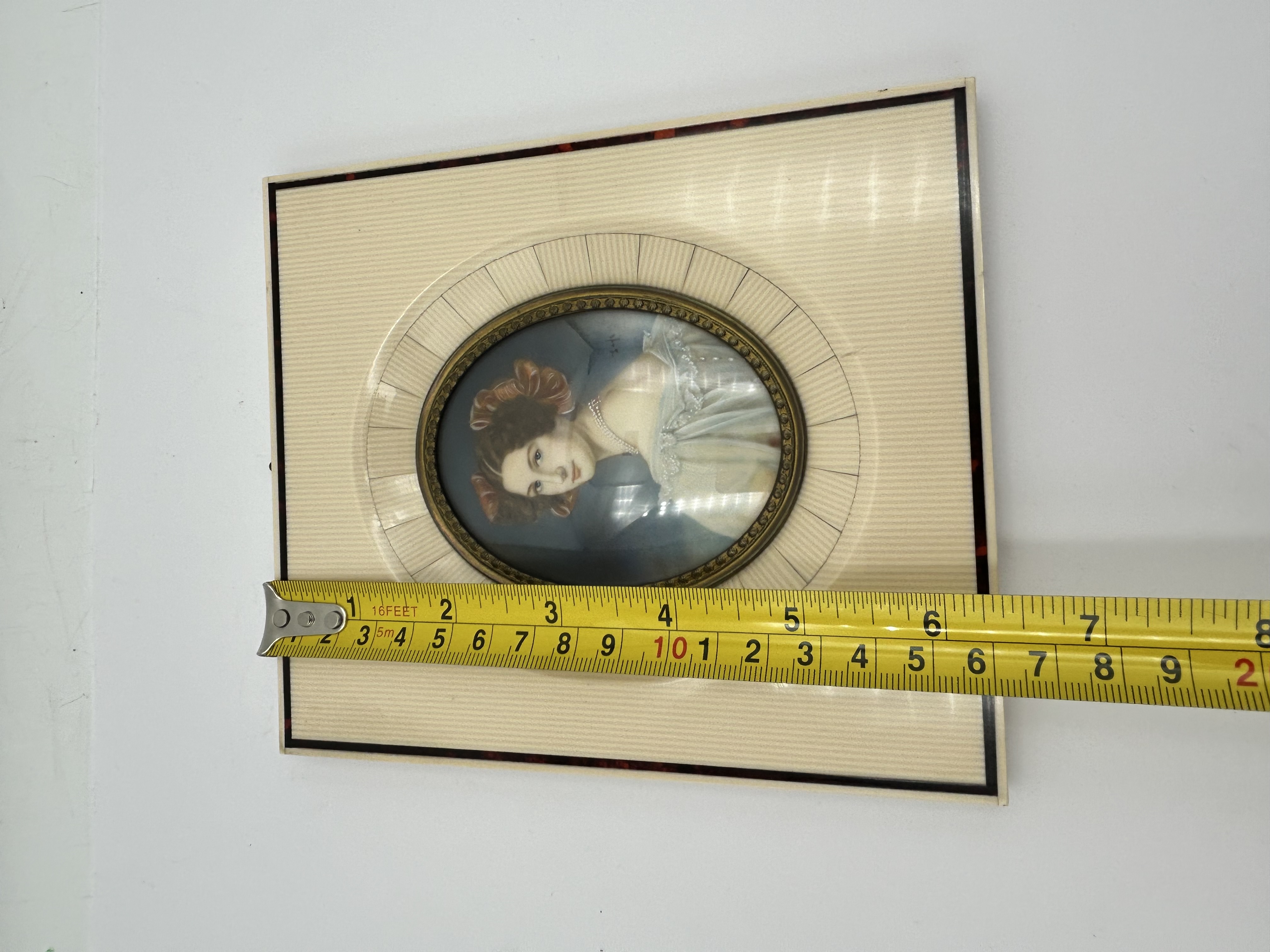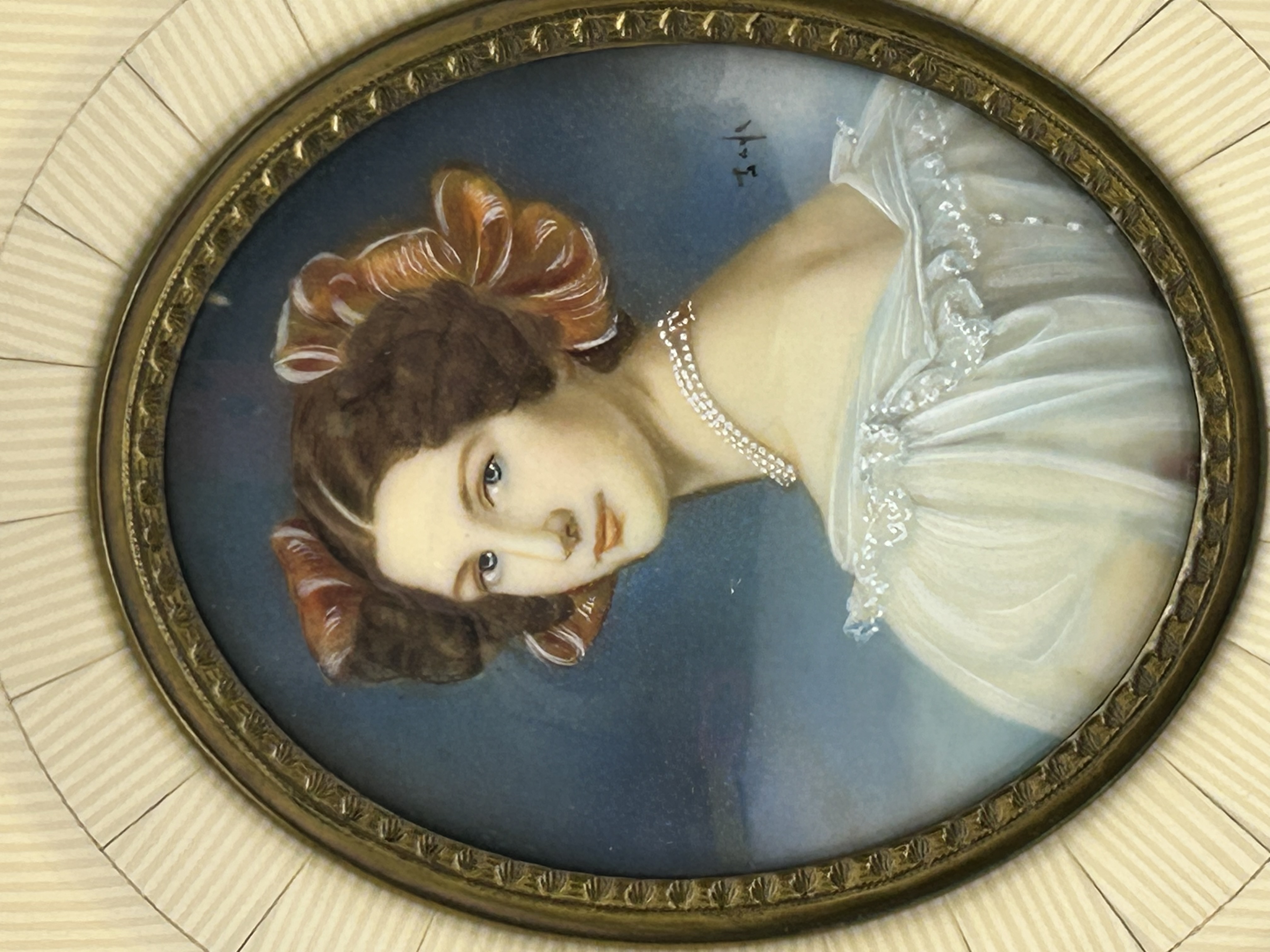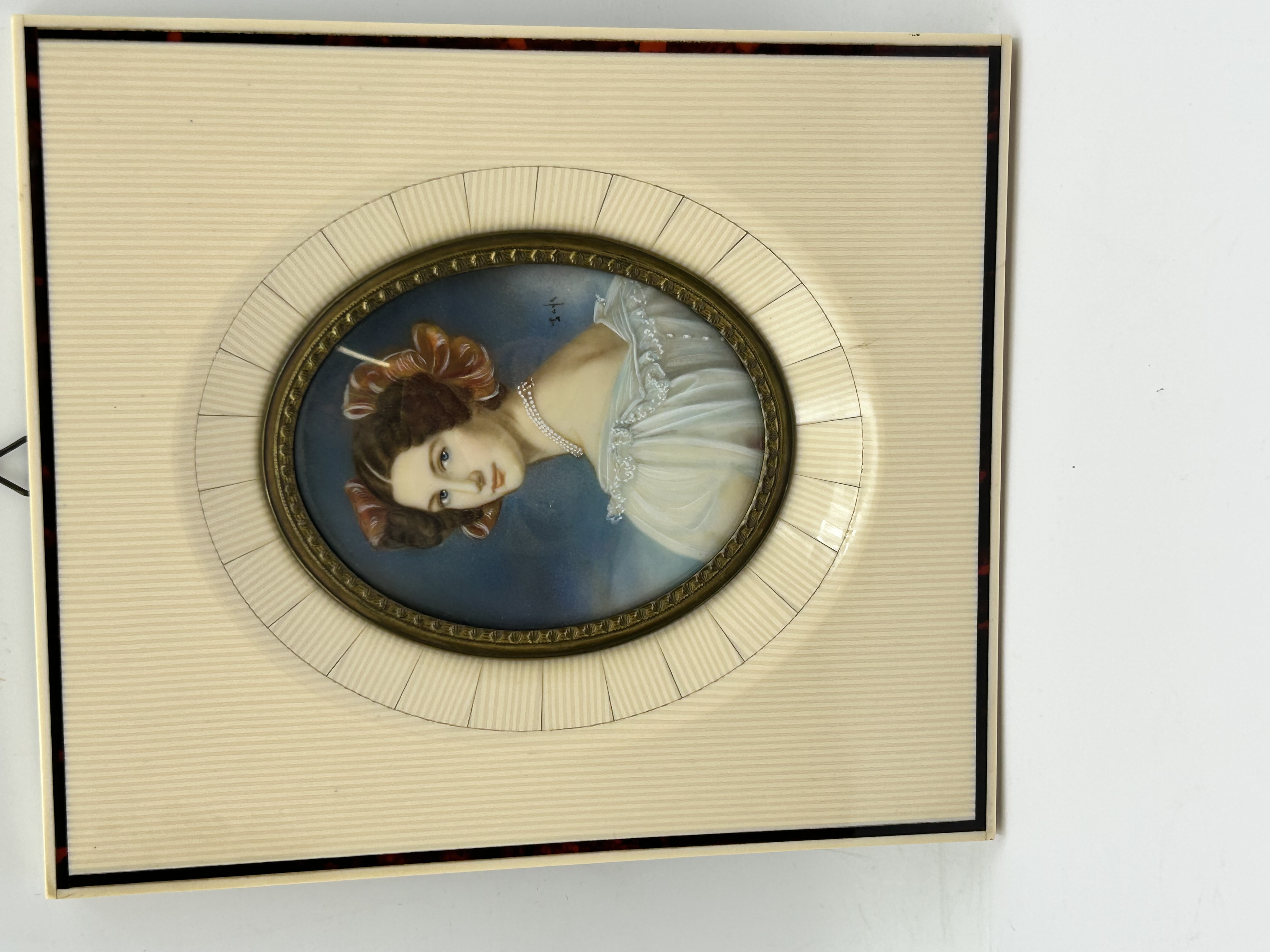 This oval portrait miniature depicts a young woman in 19th-century attire with dark hair adorned with reddish ribbons and wearing a white ruffled gown with a pearl necklace. The painting is executed on a substrate and features a signature, appearing to read Millet, in the upper right background. The piece is housed in a rectangular frame featuring a sunburst design of inlaid melamine? panels accented by a decorative metal inner bezel and a tortoiseshell-effect outer border.