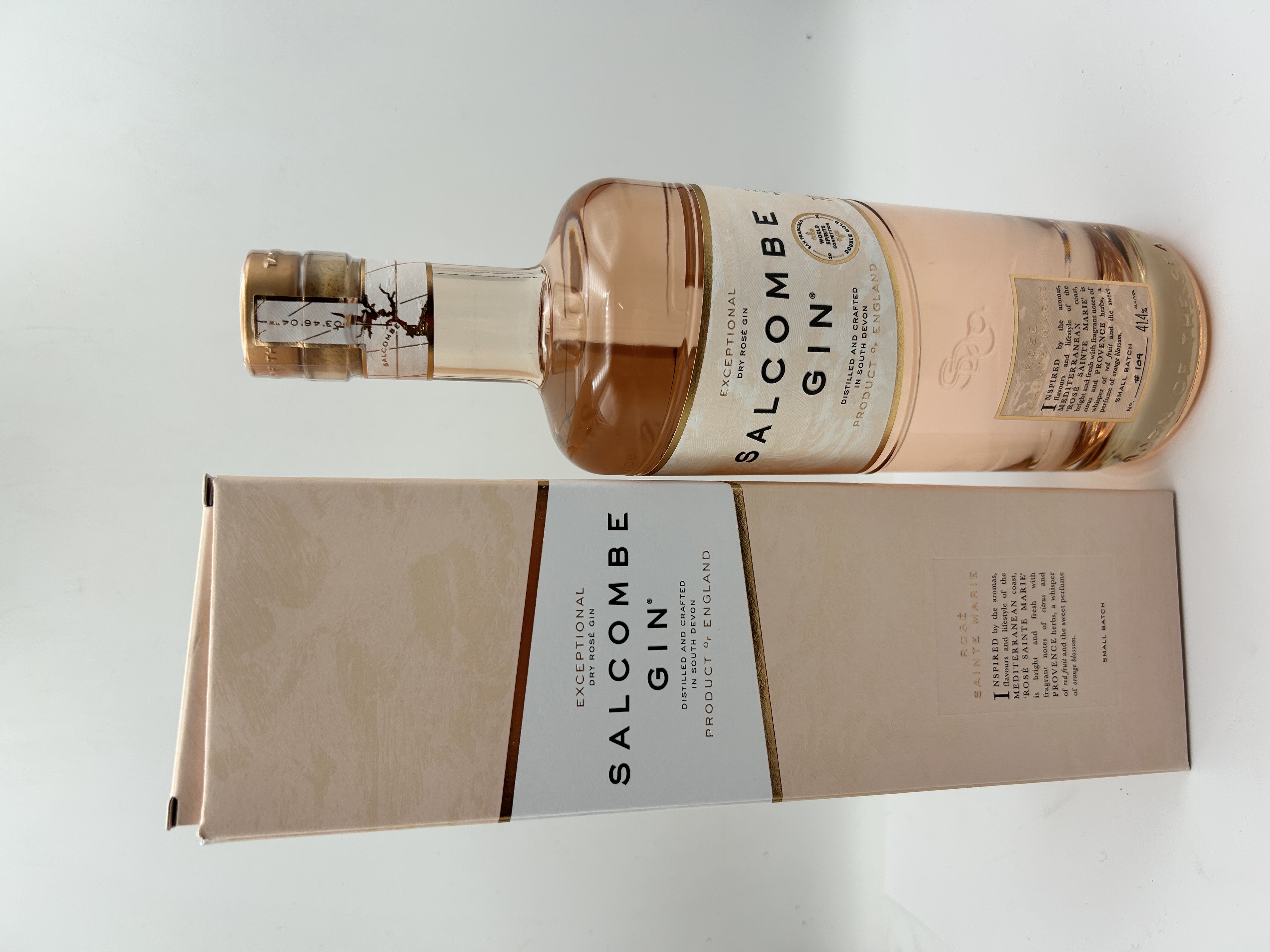 A bottle of Salcombe Gin Rosé Sainte Marie Exceptional Dry Rosé Gin, distilled and crafted in South Devon, England. The pale pink gin is contained within a clear glass bottle featuring gold foil accents and an embossed logo. The labeling includes a Double Gold award seal from the 2020 San Francisco World Spirits Competition. The bottle is marked as a Small Batch production with a handwritten-style bottle number of #109 and an alcohol content of 41.4% ABV. The item is accompanied by its original cardboard presentation box.