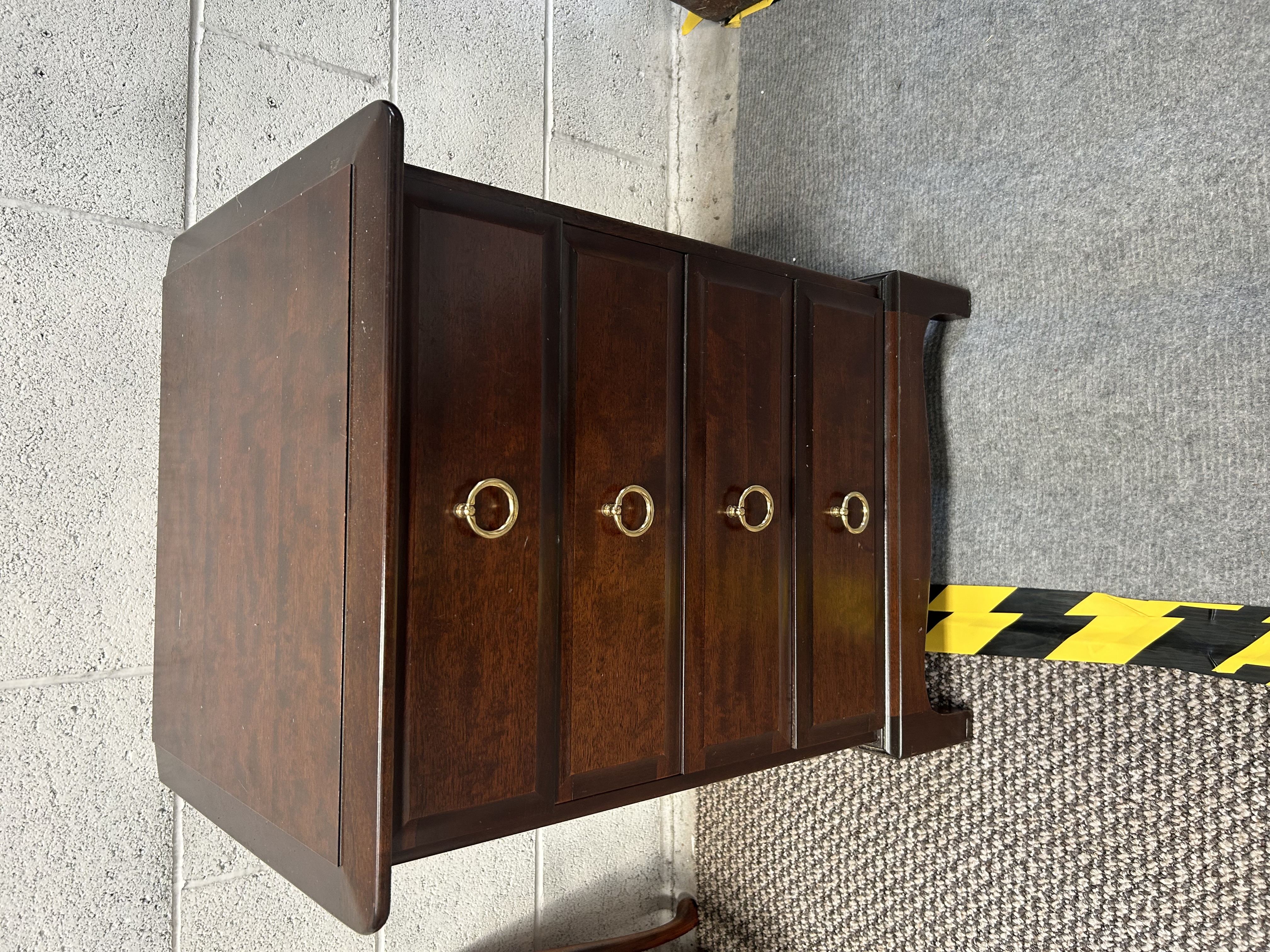A Stag Minstrel chest of drawers finished in a dark reddish-brown wood stain. This contemporary traditional-style piece features four stacked drawers, each accented with a central brass-toned ring pull. The construction includes a rectangular top with bevelled edges, supported by bracket feet integrated into decorative, curved side panels.