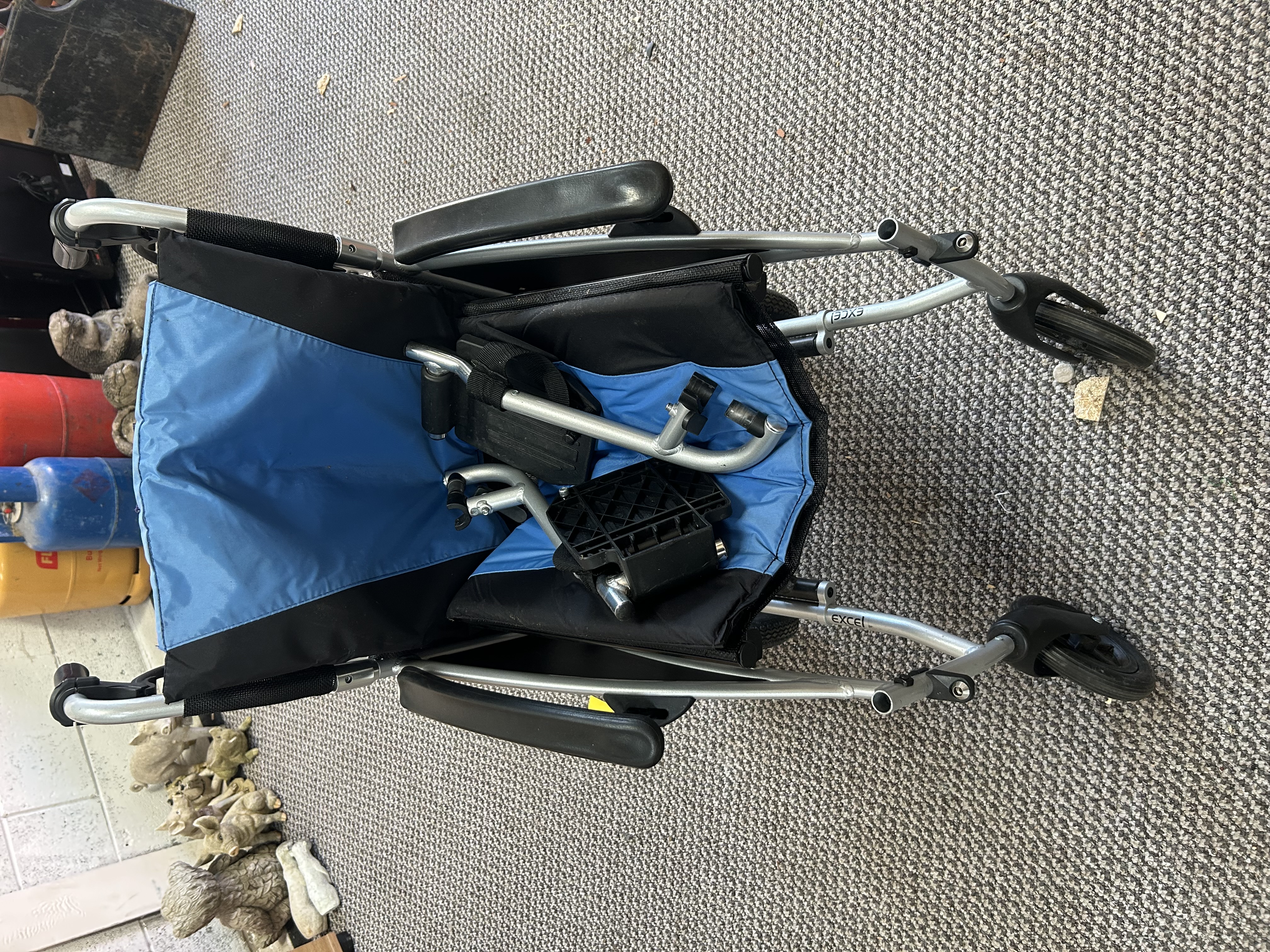 An Excel G-Logic lightweight transit wheelchair featuring a silver-tone metallic folding frame. The seat and backrest are constructed from blue and black synthetic upholstery. The chair is equipped with black padded armrests and hand-operated brakes located on the push handles. The frame and side panels display the Excel and G-Logic branding. The lot includes a set of detached black plastic and metal footrests. The chair features four wheels, with the rear wheels being larger than the front casters.