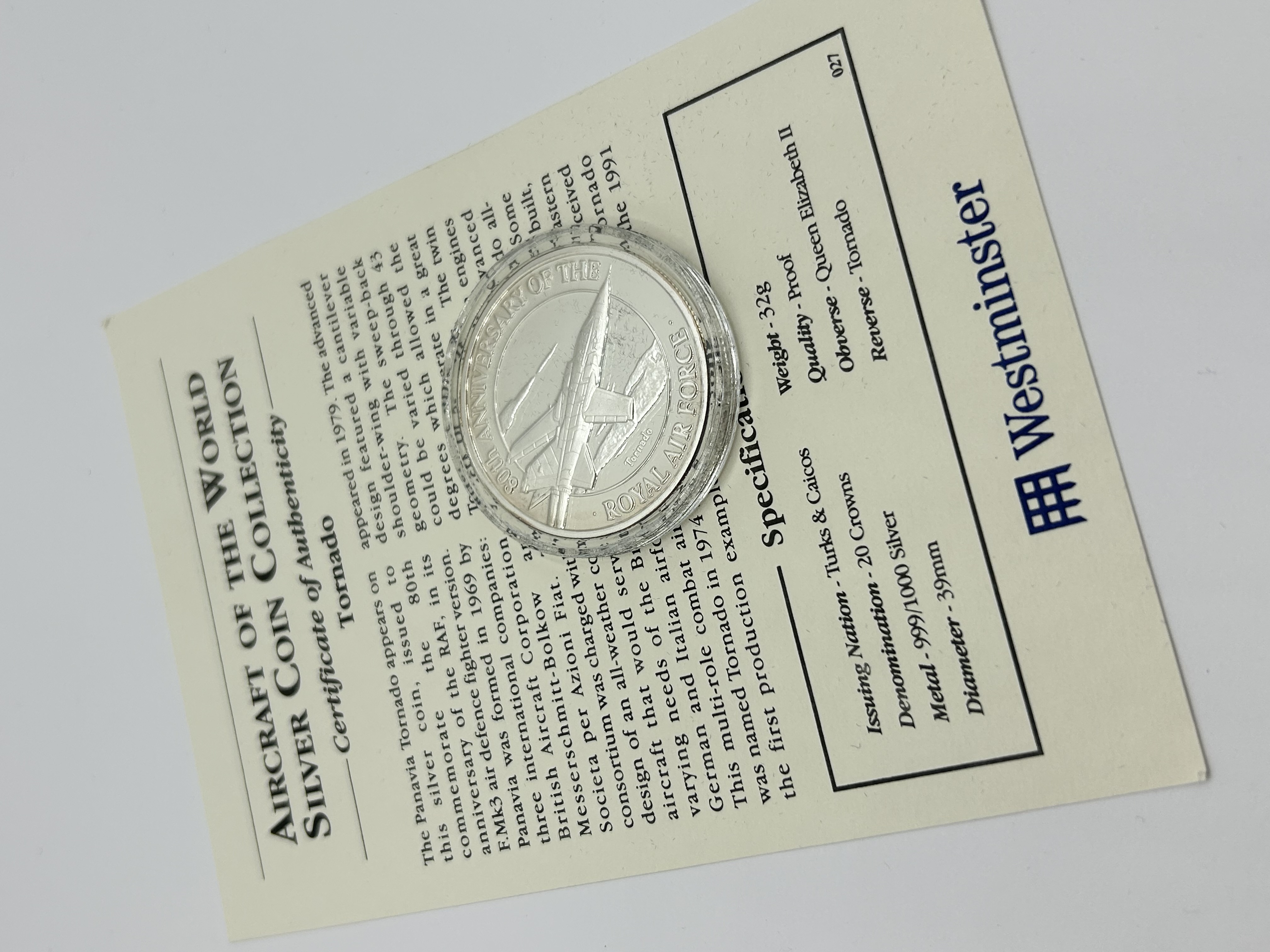 A commemorative silver proof coin issued by the Turks and Caicos Islands as part of the Aircraft of the World Silver Coin Collection marketed by Westminster. The coin has a face value of 20 Crowns and is struck in .999 fine silver. The reverse depicts a Panavia Tornado aircraft to commemorate the 80th anniversary of the Royal Air Force. The obverse features the portrait of Queen Elizabeth II. The coin is presented in a protective acrylic capsule and is accompanied by a printed certificate of authenticity providing historical information and technical specifications.