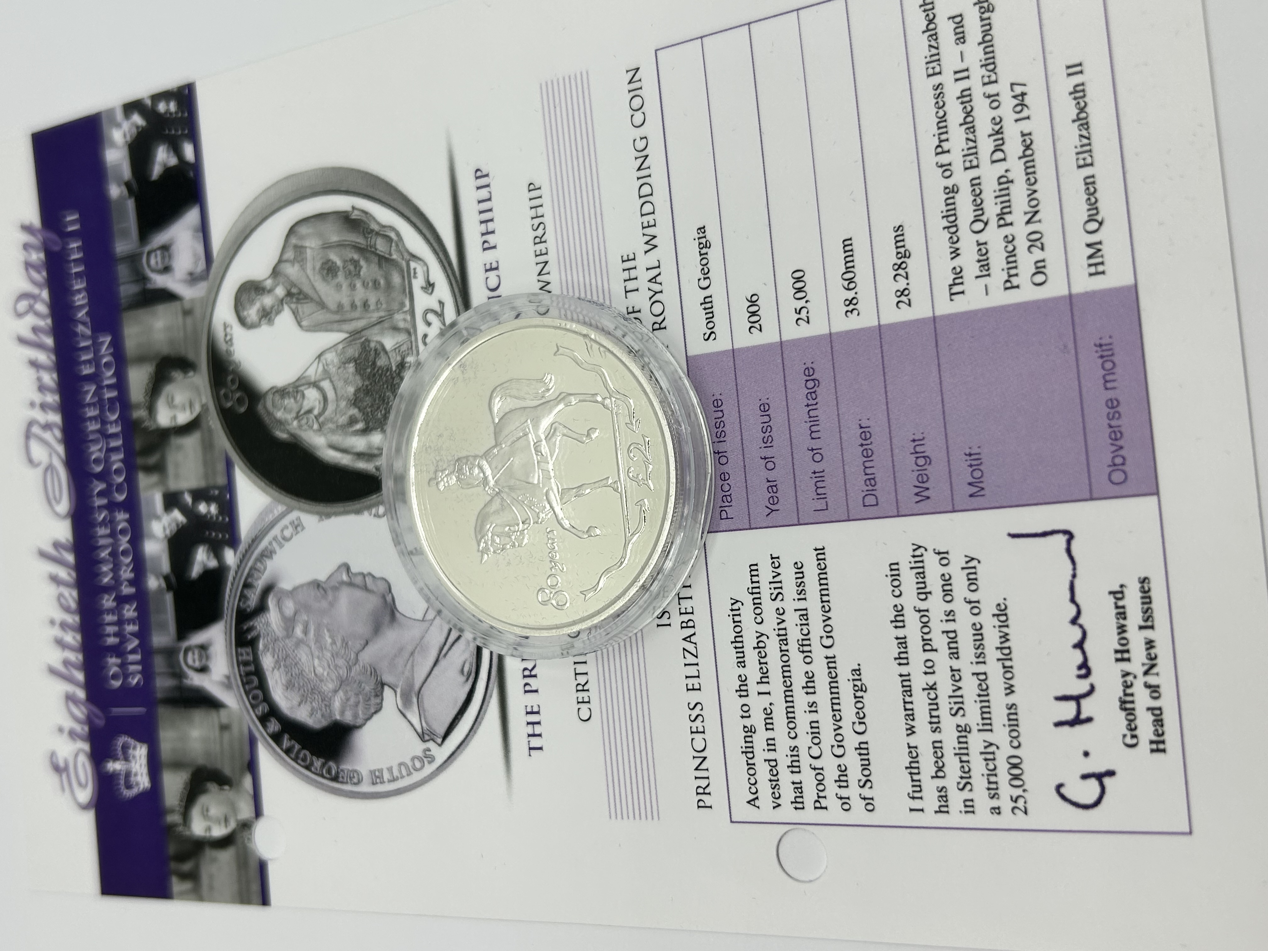 A 2006 sterling silver proof two pound coin issued by the Government of South Georgia as part of the Eightieth Birthday of Her Majesty Queen Elizabeth II Silver Proof Collection. The reverse of the coin features an equestrian motif of the Queen alongside the inscriptions 80 years and £2. The obverse displays the portrait of Queen Elizabeth II. The item is presented in a clear protective plastic capsule and includes the original Certificate of Authenticity confirming the technical specifications and a limited mintage of 25,000.