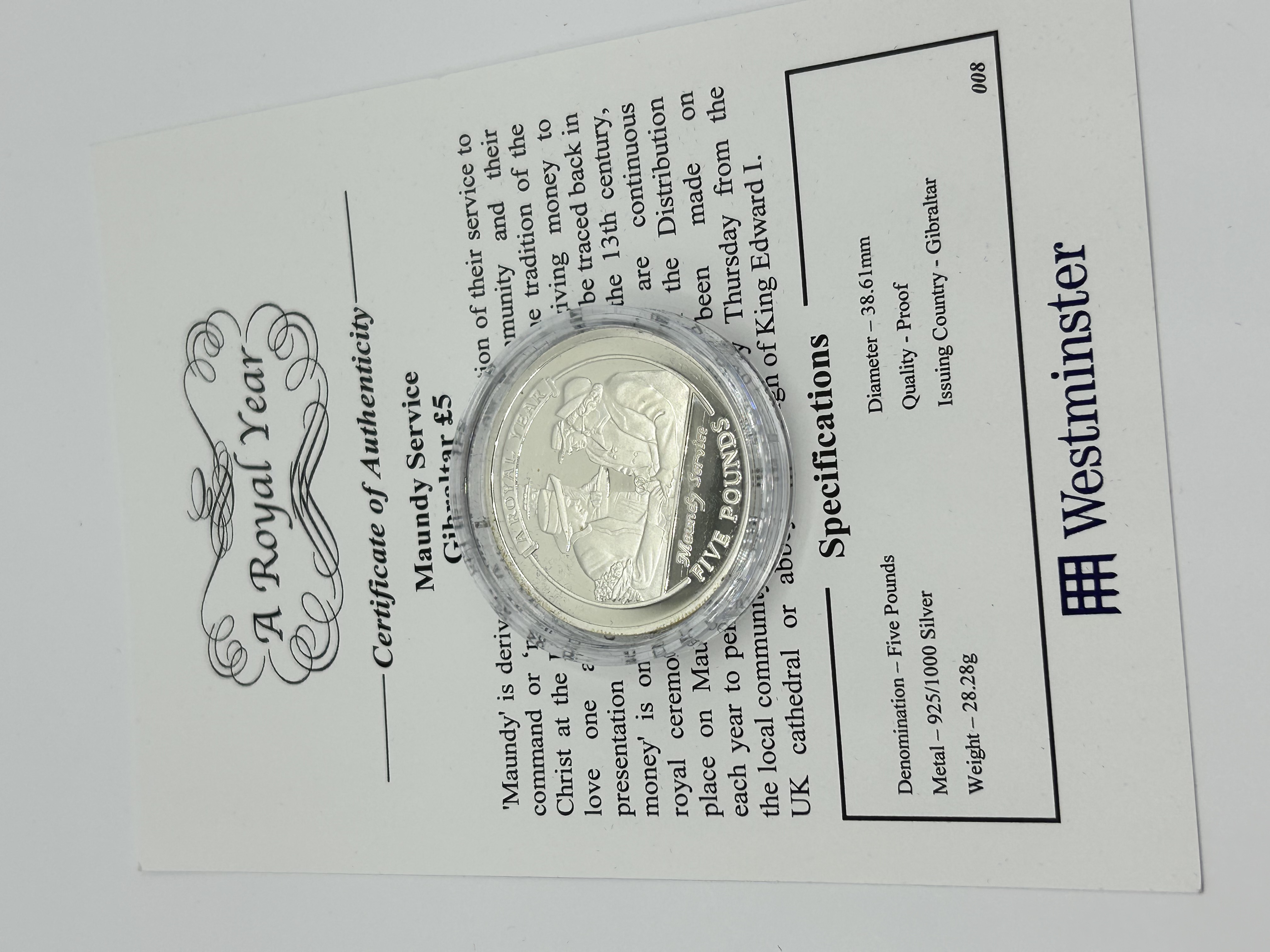 A Gibraltar five-pound silver proof commemorative coin from the A Royal Year series, issued by Westminster. The coin is titled Maundy Service and is struck in .925 sterling silver. The reverse design depicts figures involved in the traditional Maundy Thursday ceremony. The coin is accompanied by a matching Certificate of Authenticity and is housed in a clear protective plastic capsule.