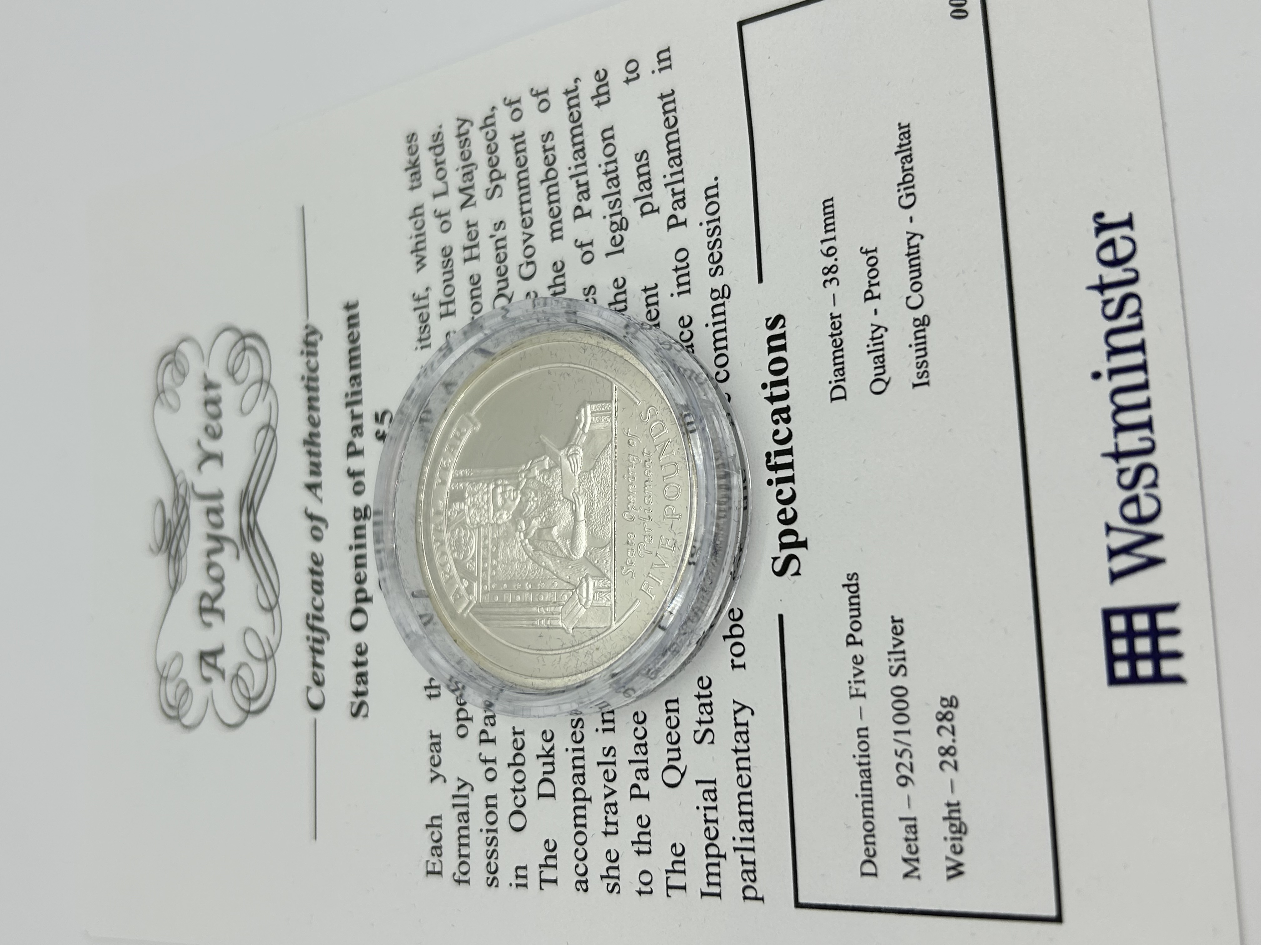 A Gibraltar silver proof five-pound coin issued as part of the A Royal Year collection, commemorating the State Opening of Parliament. The coin features a depiction of the monarch seated on the throne within the House of Lords. Inscriptions include A ROYAL YEAR, State Opening of Parliament, and FIVE POUNDS. The item is struck in .925 sterling silver and is housed in a clear protective plastic capsule. It is accompanied by a Westminster Certificate of Authenticity.