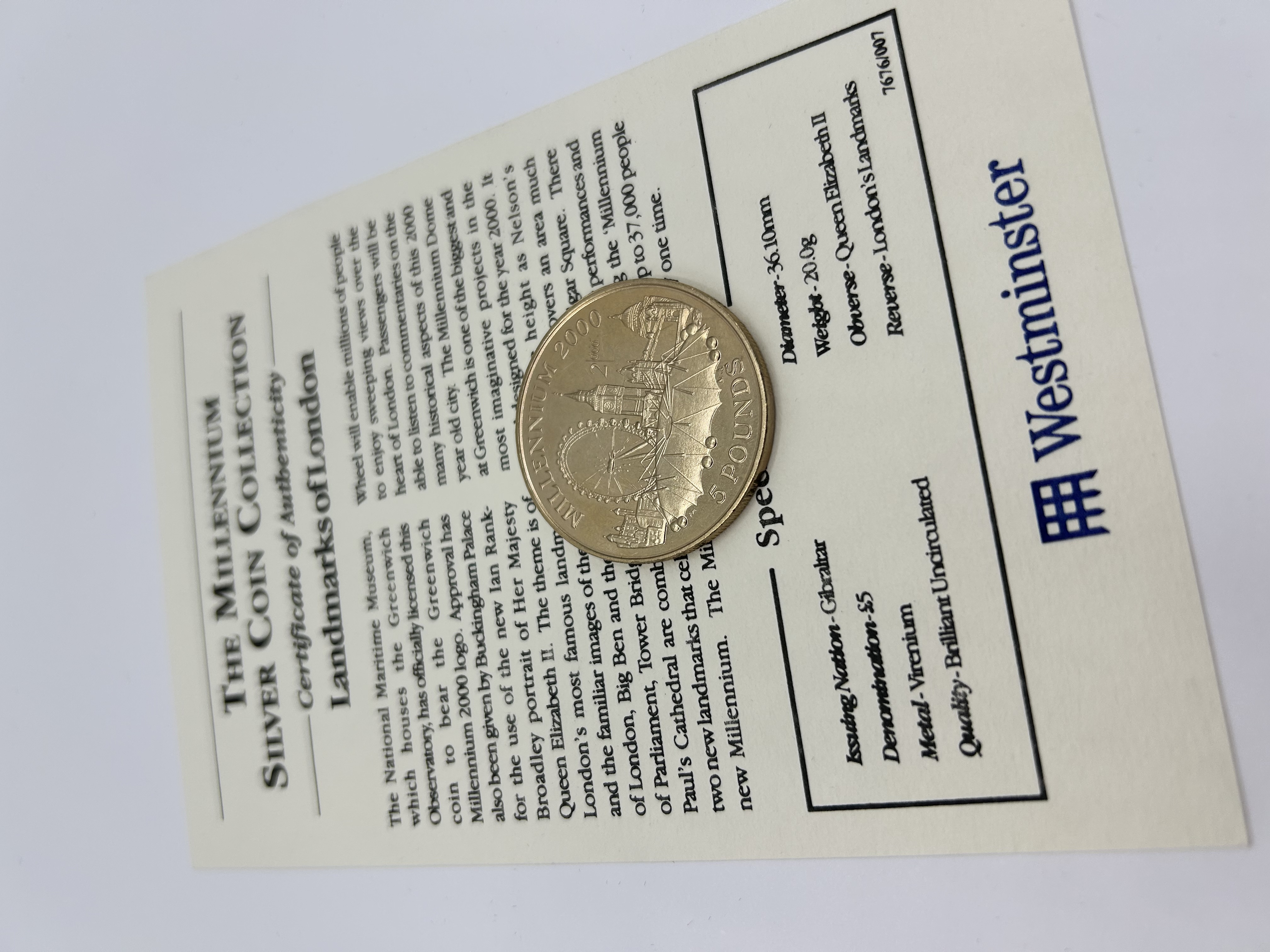 A Gibraltar five-pound commemorative coin issued in 2000 as part of the Landmarks of London collection. The coin is struck in Virenium, a gold-toned alloy, and is accompanied by a Westminster Certificate of Authenticity. The reverse design features a montage of London landmarks including the Millennium Dome, the London Eye, and the Elizabeth Tower, inscribed with MILLENNIUM 2000 and 5 POUNDS. The obverse features the effigy of Queen Elizabeth II by Ian Rank-Broadley. The coin is designated as brilliant uncirculated quality.