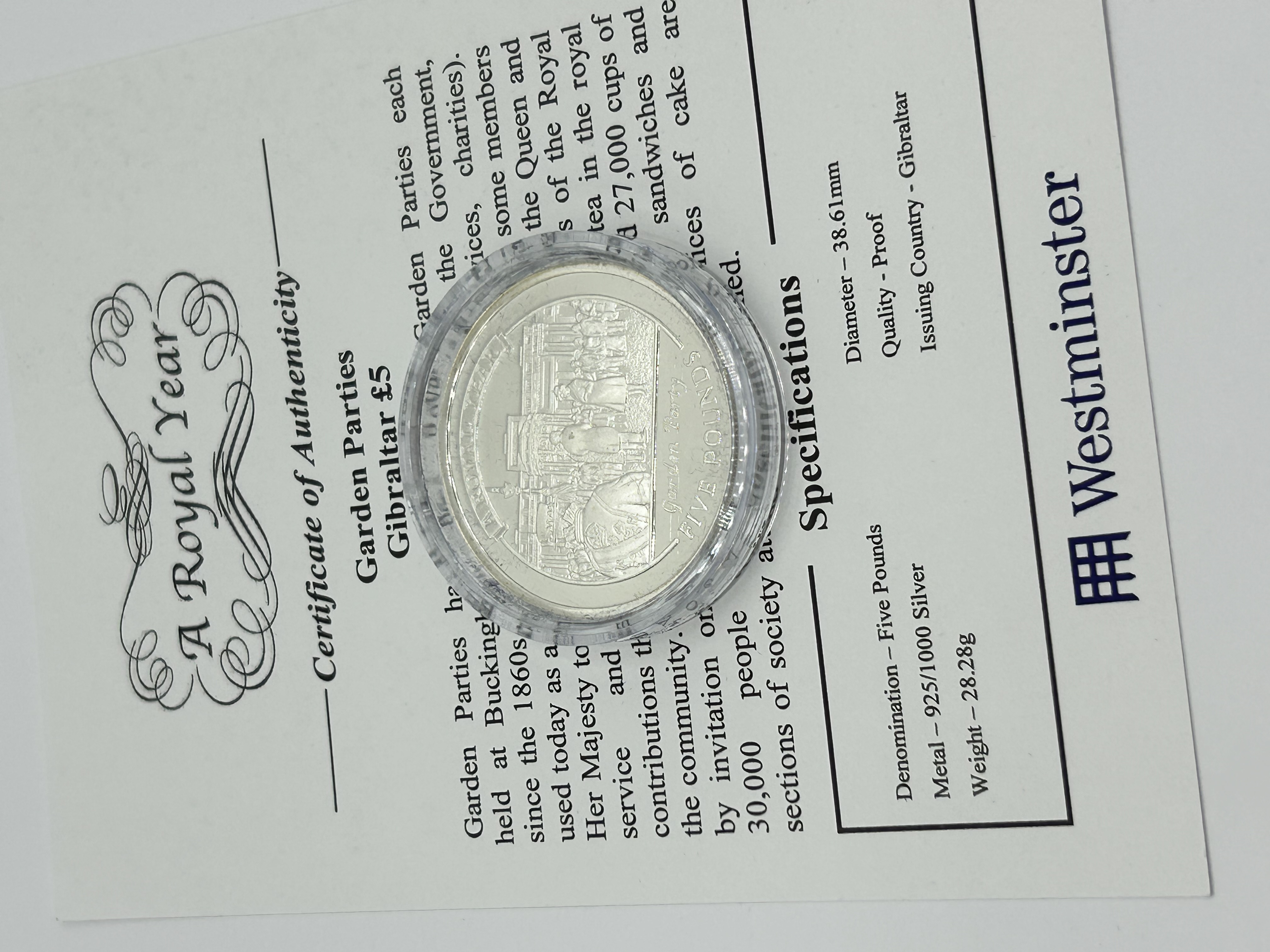 A Gibraltar five-pound silver proof coin from the A Royal Year series, commemorating the tradition of Garden Parties. The coin is struck in .925 sterling silver. The reverse design features a scene of guests at a royal garden party with the inscriptions Garden Party and FIVE POUNDS. The item is housed in a protective clear plastic capsule and is accompanied by a Westminster Certificate of Authenticity providing historical information and technical specifications.