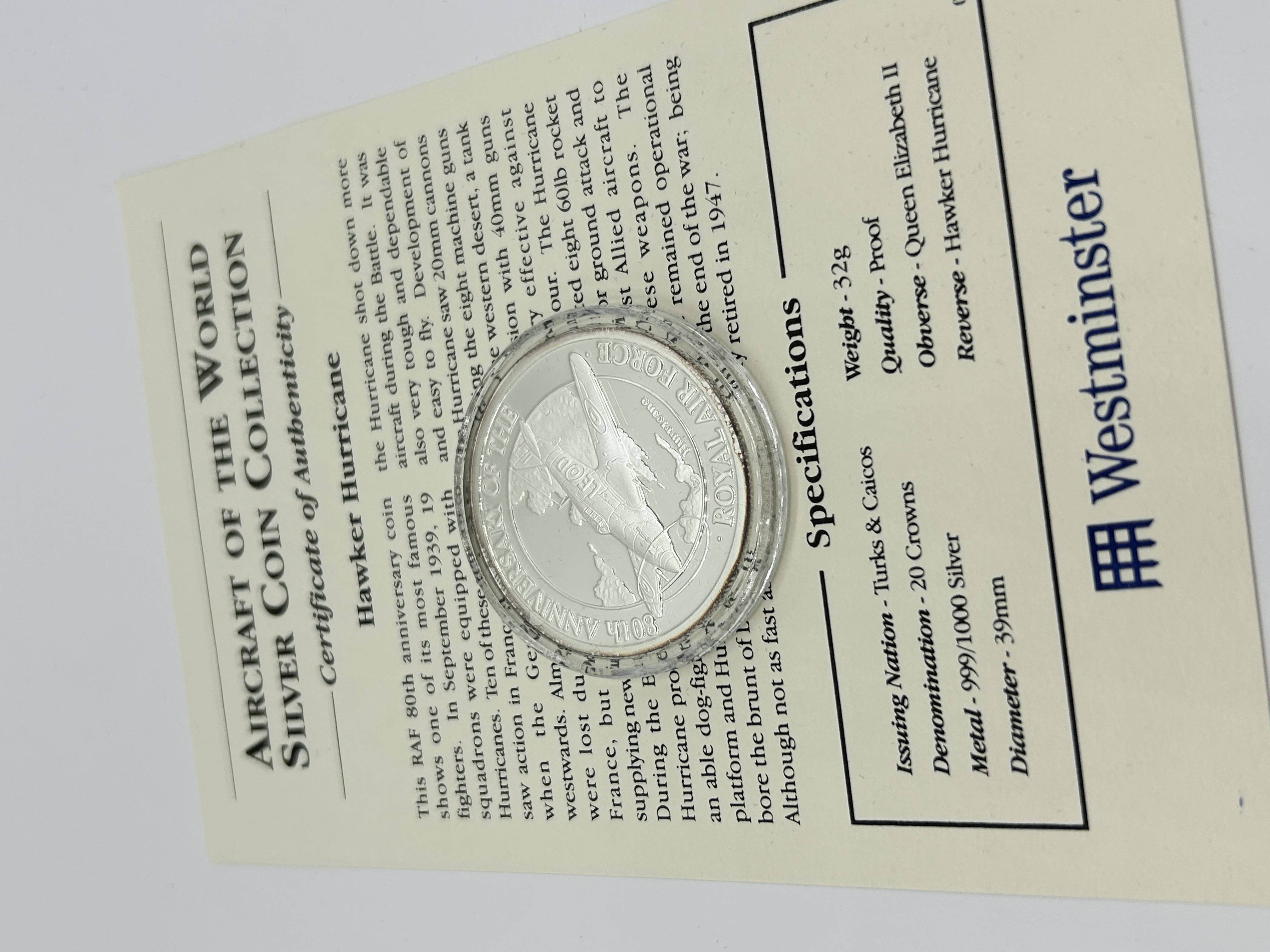 A commemorative silver coin from the Aircraft of the World Silver Coin Collection issued by Westminster. The coin is struck in .999 fine silver with a proof finish. The reverse features a depiction of a Hawker Hurricane aircraft with the inscription 80TH ANNIVERSARY OF THE ROYAL AIR FORCE. The obverse displays the effigy of Queen Elizabeth II. The item is issued by the Turks and Caicos Islands and is accompanied by its original certificate of authenticity.