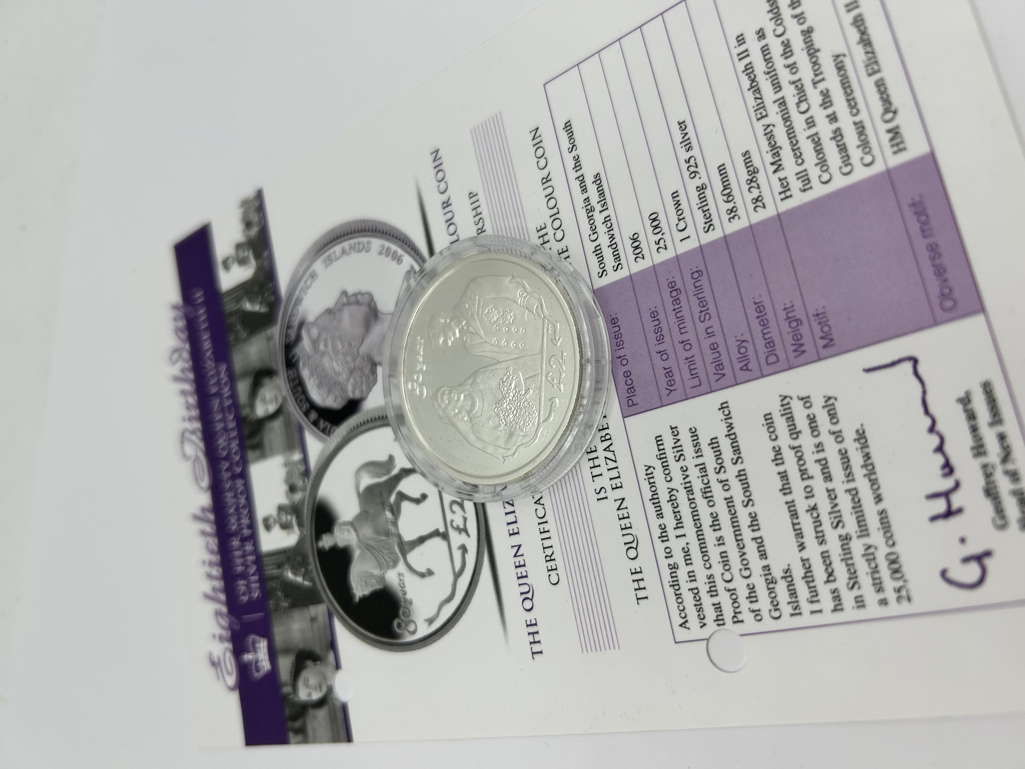 A 2006 sterling silver proof commemorative two pound coin issued for South Georgia and the South Sandwich Islands. This coin was issued as part of The Queen Elizabeth II Eightieth Birthday Silver Proof Collection. The reverse features a dual portrait of Her Majesty Queen Elizabeth II and the Duke of Edinburgh, inscribed with the text 80 years and the denomination £2. The obverse depicts the effigy of Queen Elizabeth II. The coin is presented in a clear protective capsule and is accompanied by a certificate of authenticity from the issuing authority.