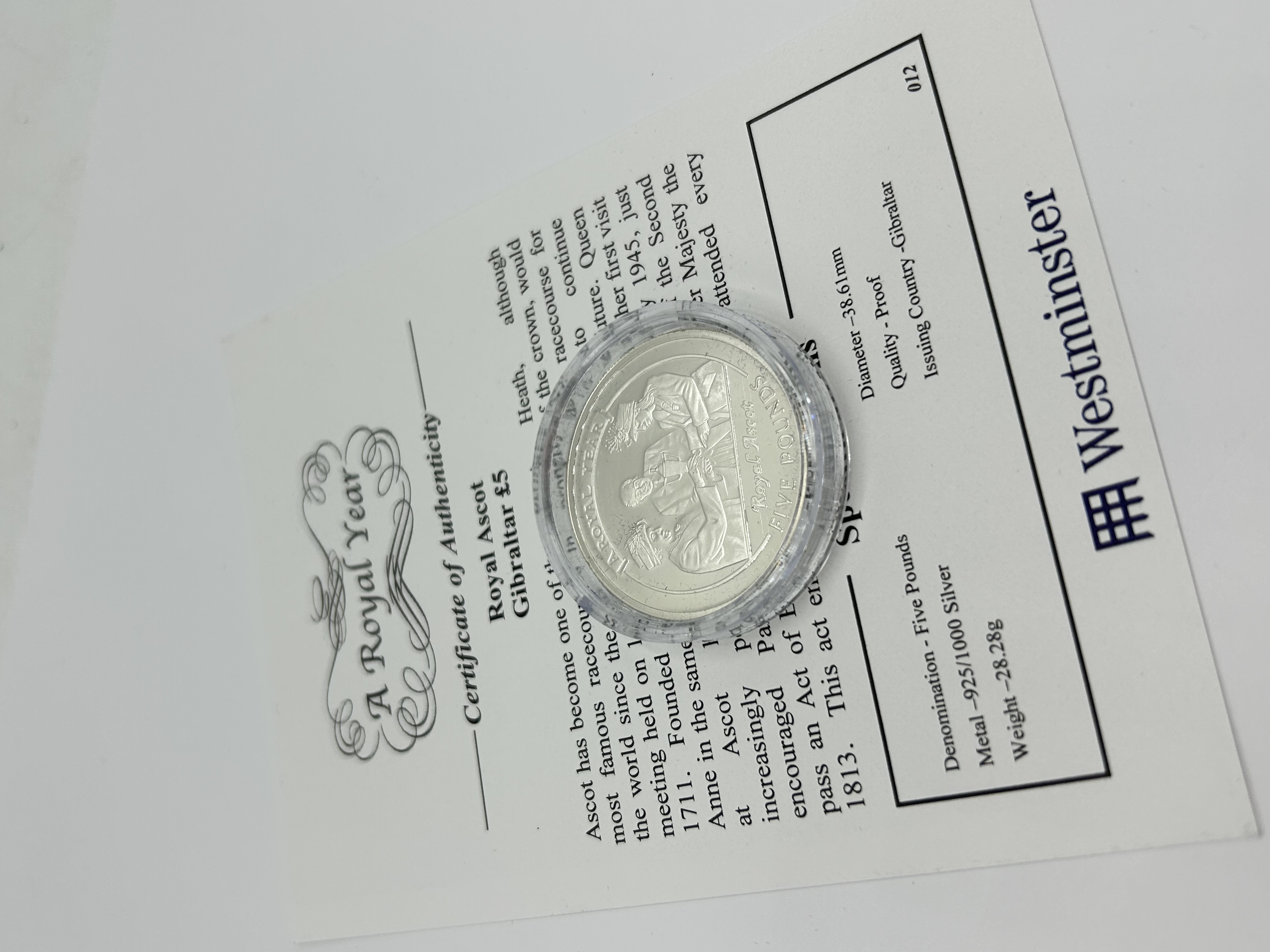 This commemorative Gibraltar five pound silver proof coin is part of the A Royal Year series. The reverse features a themed depiction of figures at Royal Ascot with the inscriptions A ROYAL YEAR, Royal Ascot, and FIVE POUNDS. The coin is struck in .925 sterling silver and is housed in a protective plastic capsule. It is accompanied by a Westminster Certificate of Authenticity.
