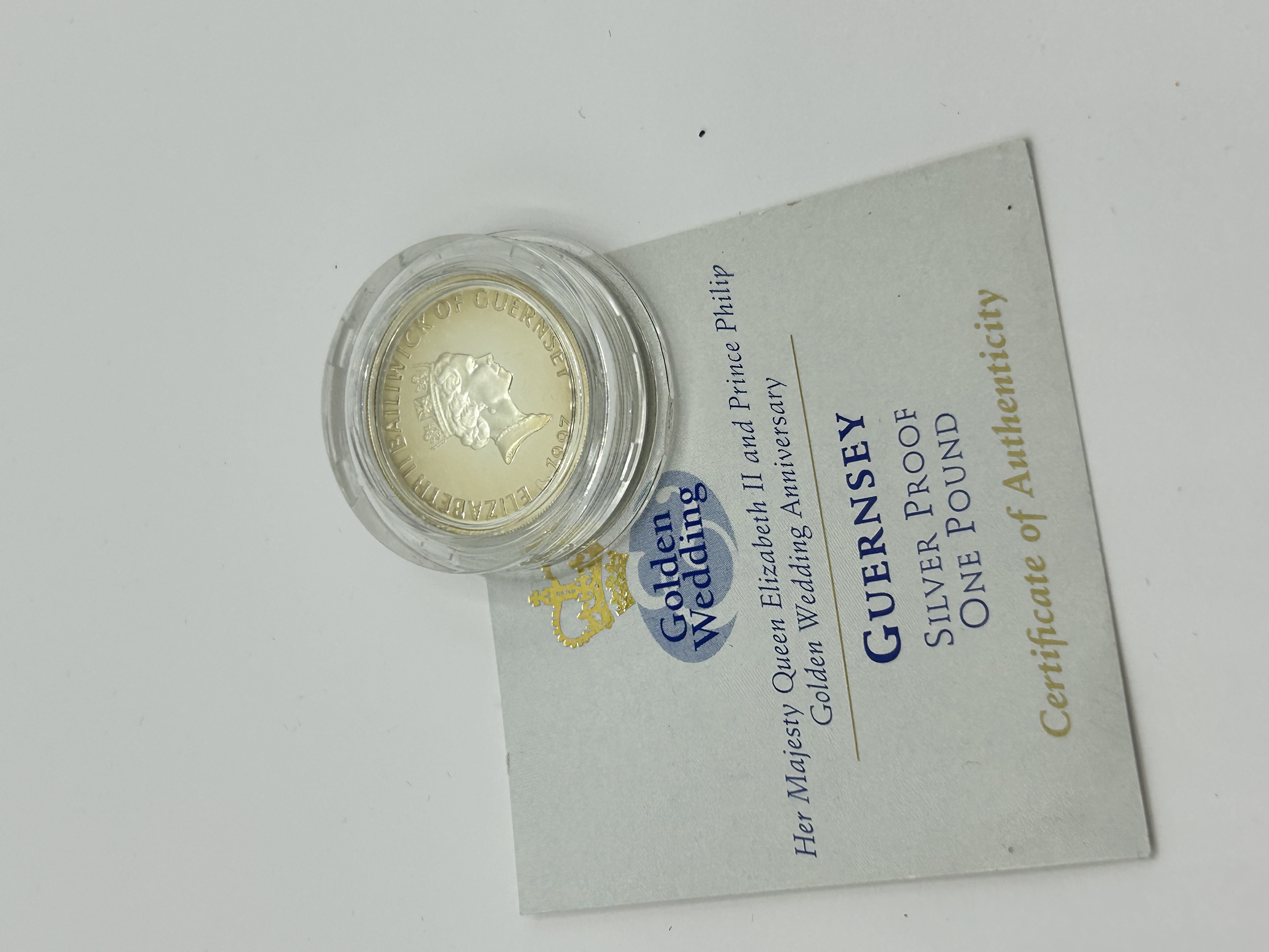 A 1997 Bailiwick of Guernsey silver proof one pound coin issued to commemorate the Golden Wedding anniversary of Queen Elizabeth II and Prince Philip. The obverse features the portrait of Queen Elizabeth II with the inscription ELIZABETH II BAILIWICK OF GUERNSEY 1997. The coin is struck with a proof finish and is housed in a clear protective plastic capsule. Accompanied by the original Certificate of Authenticity detailing the item as a SILVER PROOF ONE POUND.