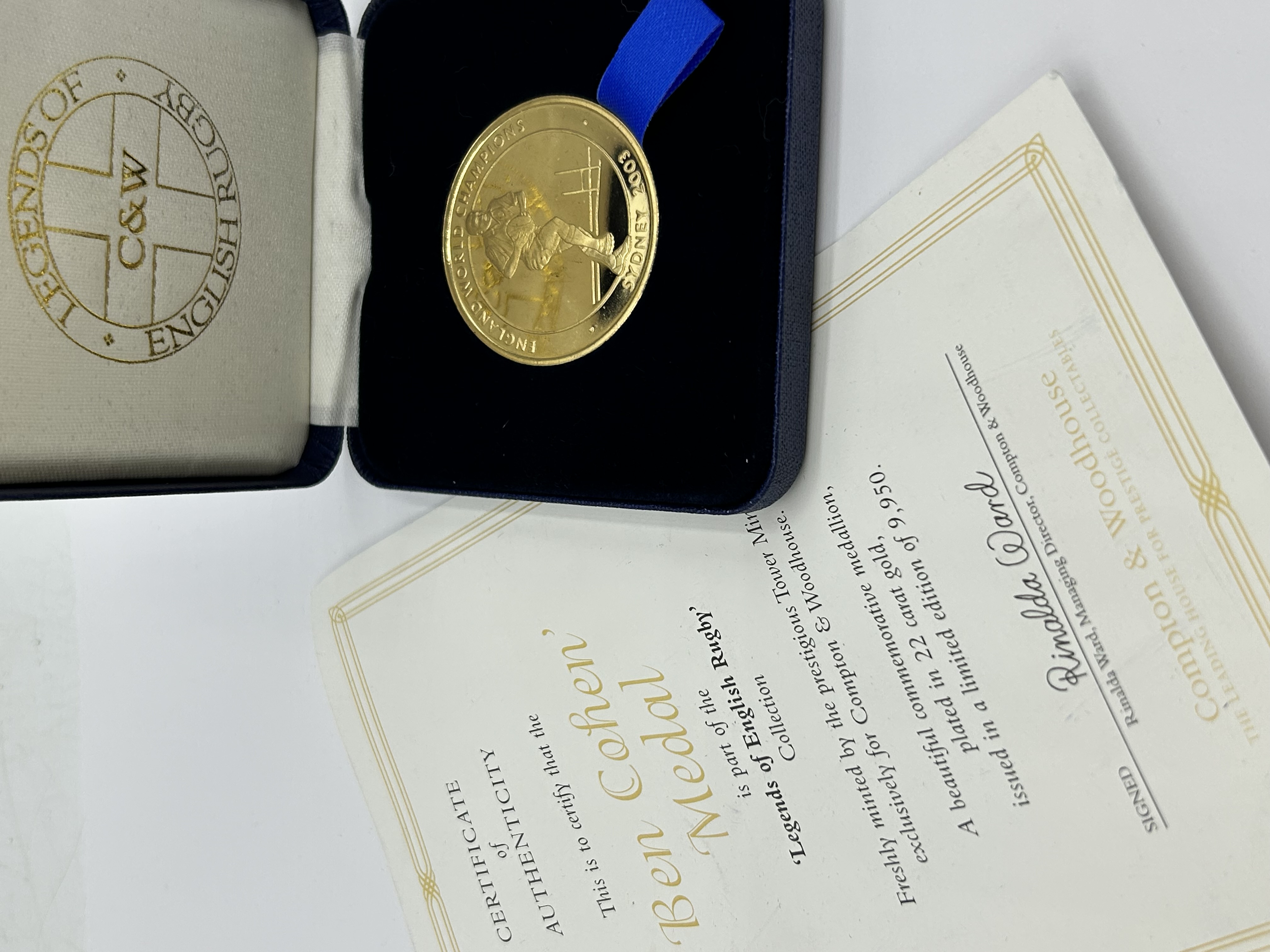 This commemorative medallion is part of the Legends of English Rugby collection by Compton & Woodhouse, celebrating the 2003 England World Cup victory. The piece was minted by Tower Mint and is plated in 22-karat gold. The obverse features a rugby player in motion and is inscribed with the text ENGLAND WORLD CHAMPIONS SYDNEY 2003. The medallion is presented in its original navy-blue velvet-lined case, which displays the C&W Legends of English Rugby logo on the interior lid. Included is a Certificate of Authenticity stating the item is from a limited edition of 9,950.