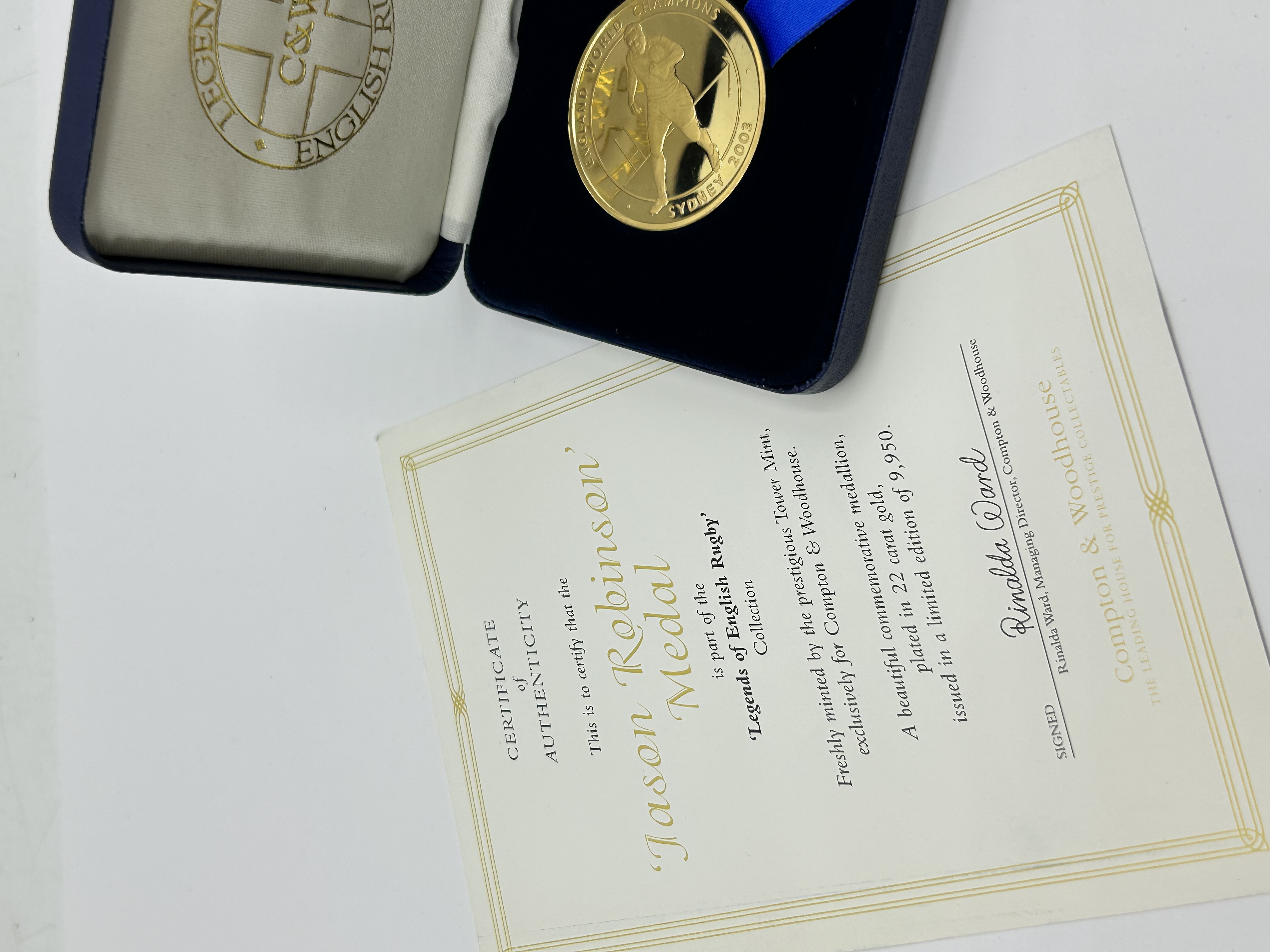 A commemorative medallion featuring a relief of rugby player Jason Robinson, part of the Legends of English Rugby collection. The piece was minted by Tower Mint for Compton and Woodhouse. The obverse displays the player in action with the inscriptions ENGLAND WORLD CHAMPIONS and SYDNEY 2003. The medallion is plated in 22-karat gold. It is housed in a blue velvet-lined presentation case featuring the collection insignia on the interior lid. Accompanied by a Certificate of Authenticity signed by Rinalda Ward, stating it is from a limited edition of 9,950.