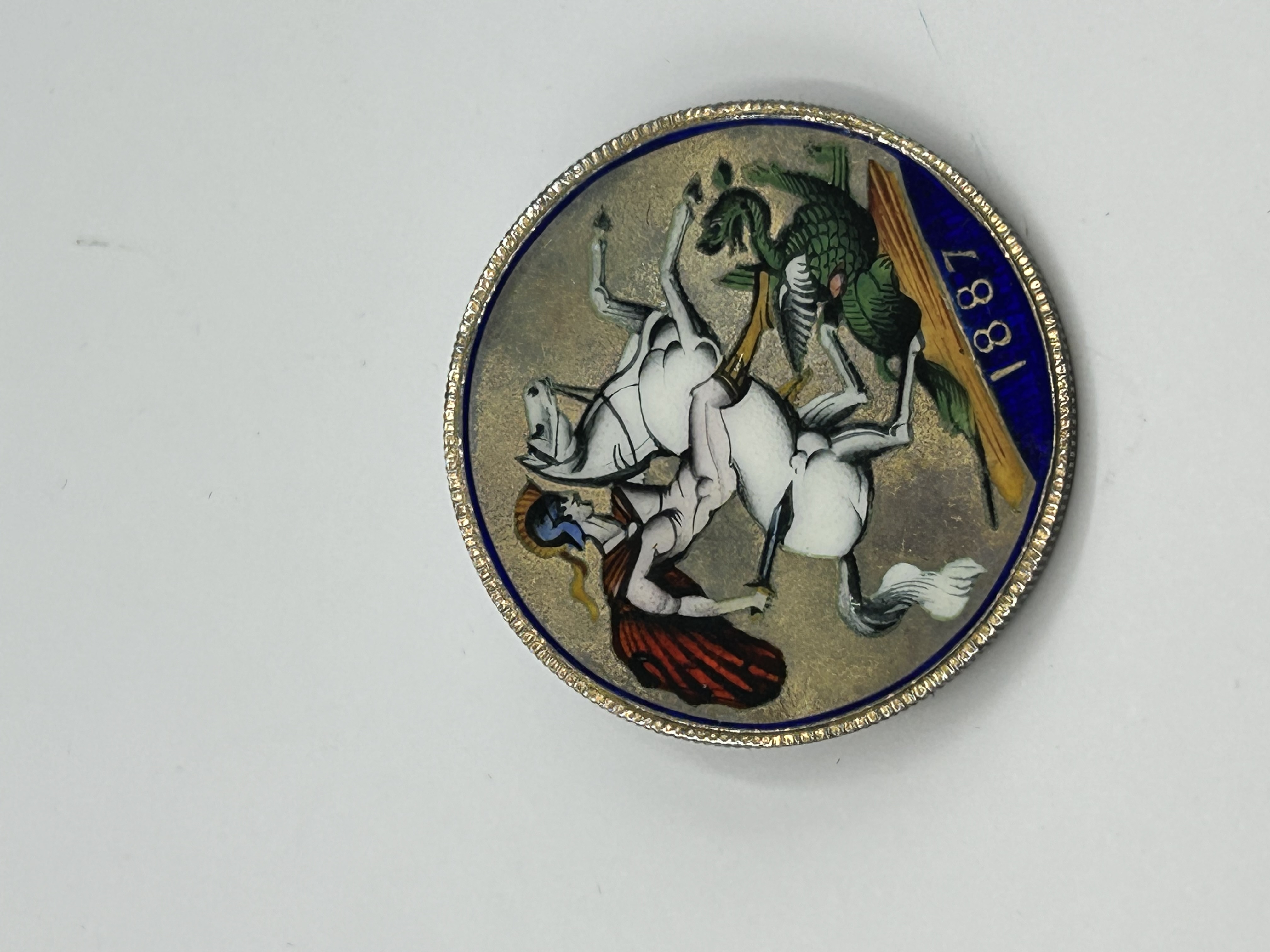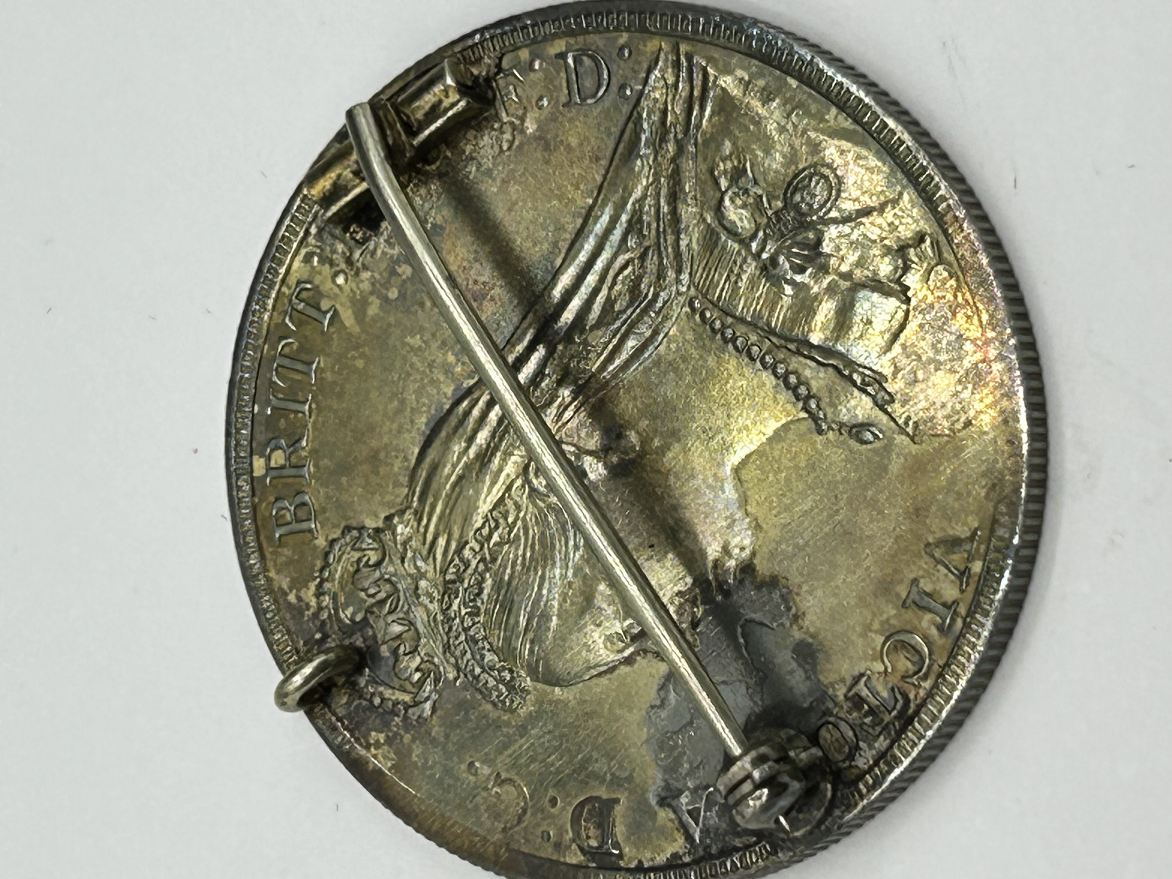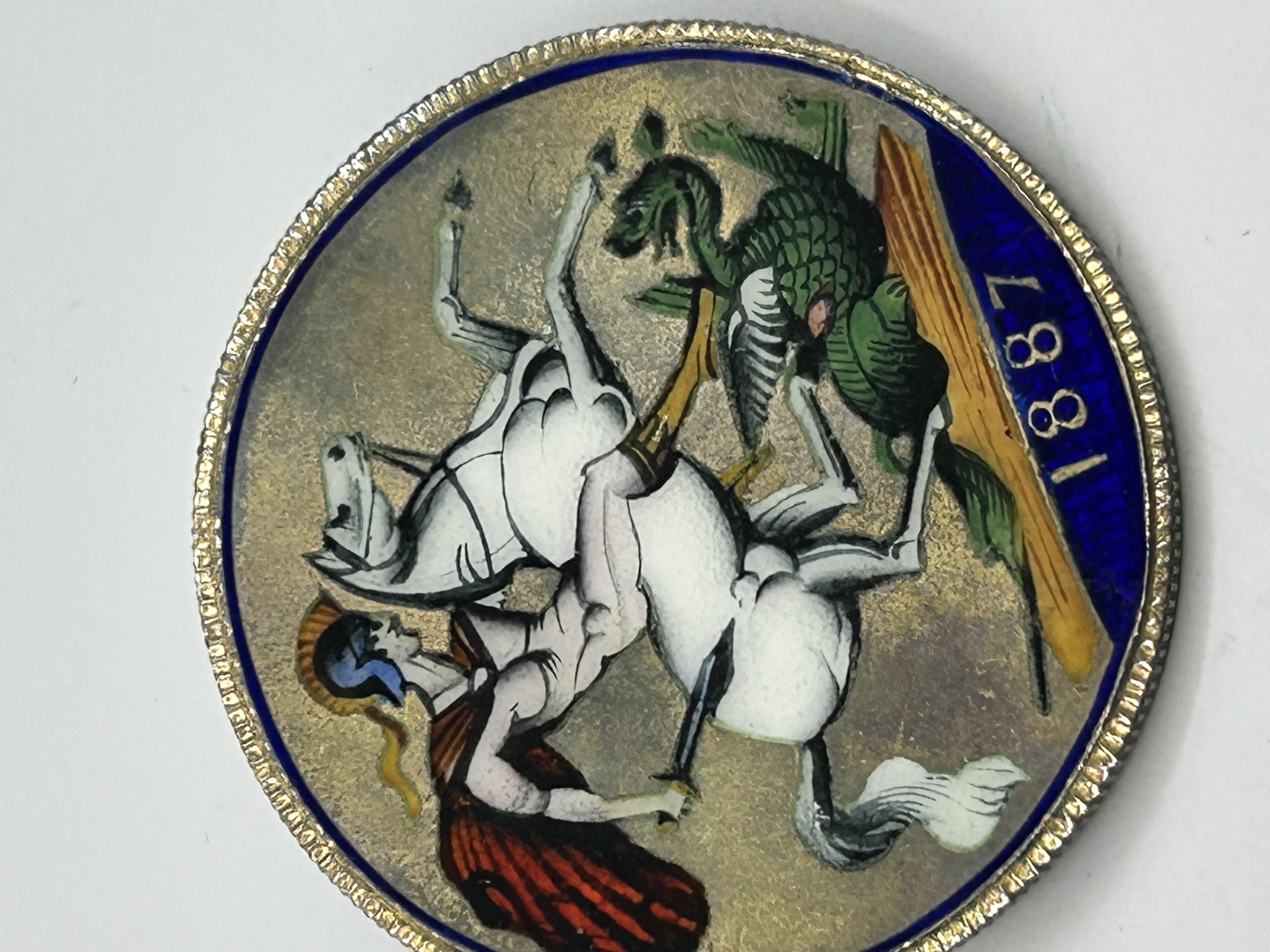 A Victorian-era silver crown coin converted into a brooch. The obverse features a hand-painted polychrome enamel scene depicting Saint George slaying the dragon. The date 1887 is set within a cobalt blue enameled section on the right side of the scene. The reverse of the brooch reveals the original silver coin surface, featuring the Jubilee head portrait of Queen Victoria. Visible legends on the reverse include VICTORIA and BRITT:. A metal pin and catch are soldered to the reverse for use as jewelry.