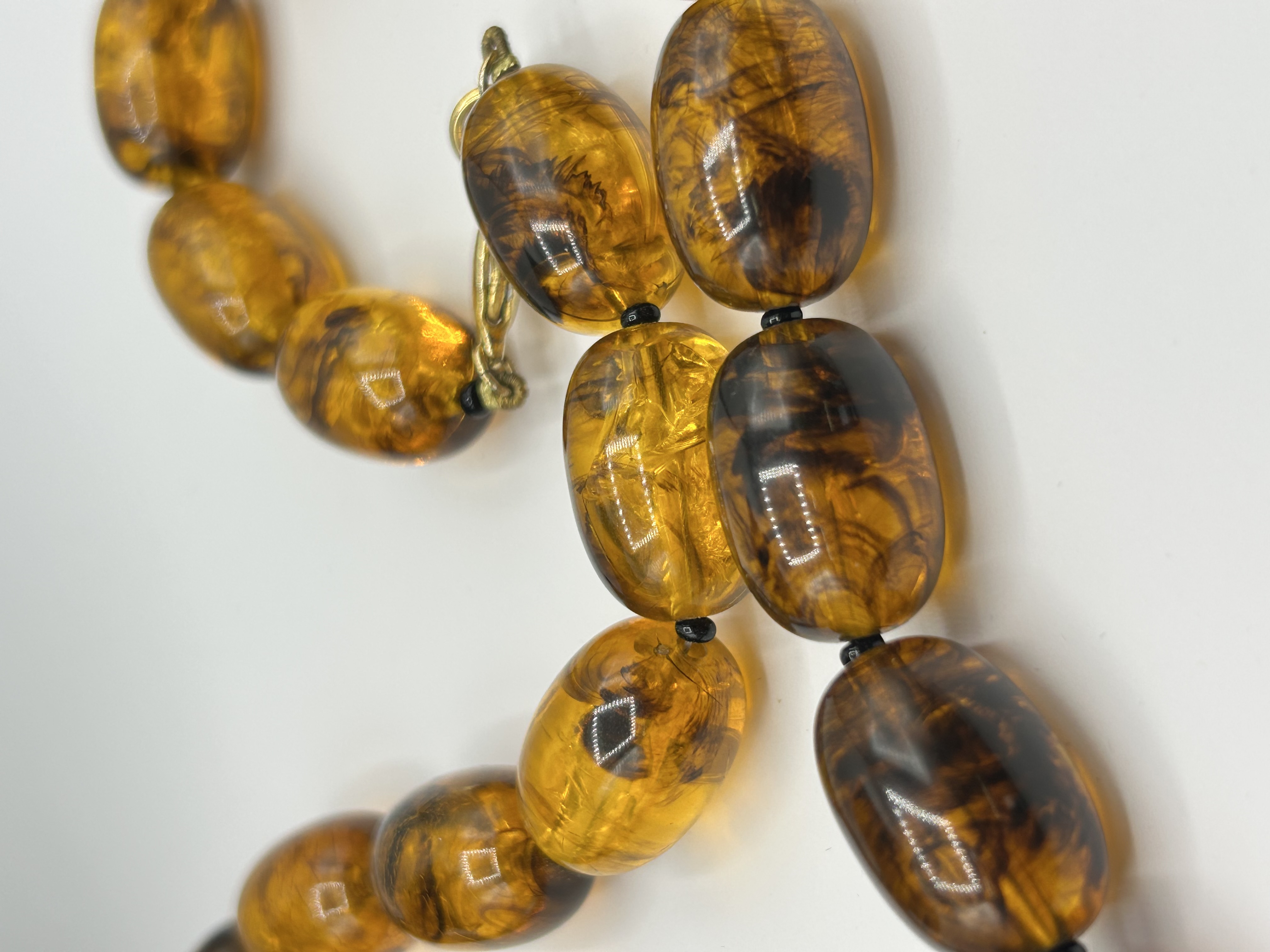 This single-strand necklace features a series of translucent, amber-colored barrel-shaped beads with a polished finish. The beads exhibit internal swirls and circular inclusions characteristic of honey amber. The elements are hand-knotted on a dark cord with small black spacer beads positioned between each amber component. The necklace is secured with a gold-tone metal screw-style clasp.