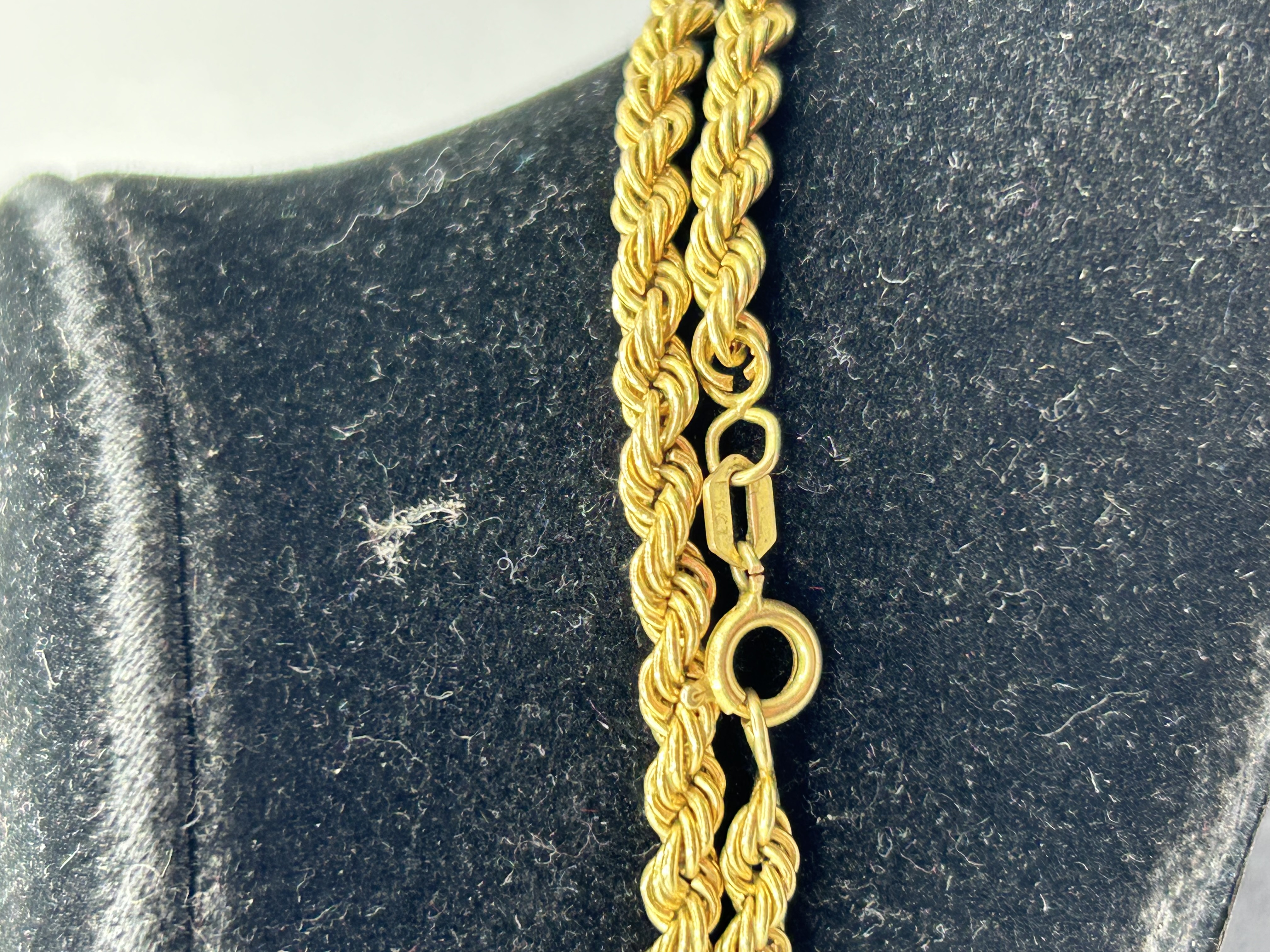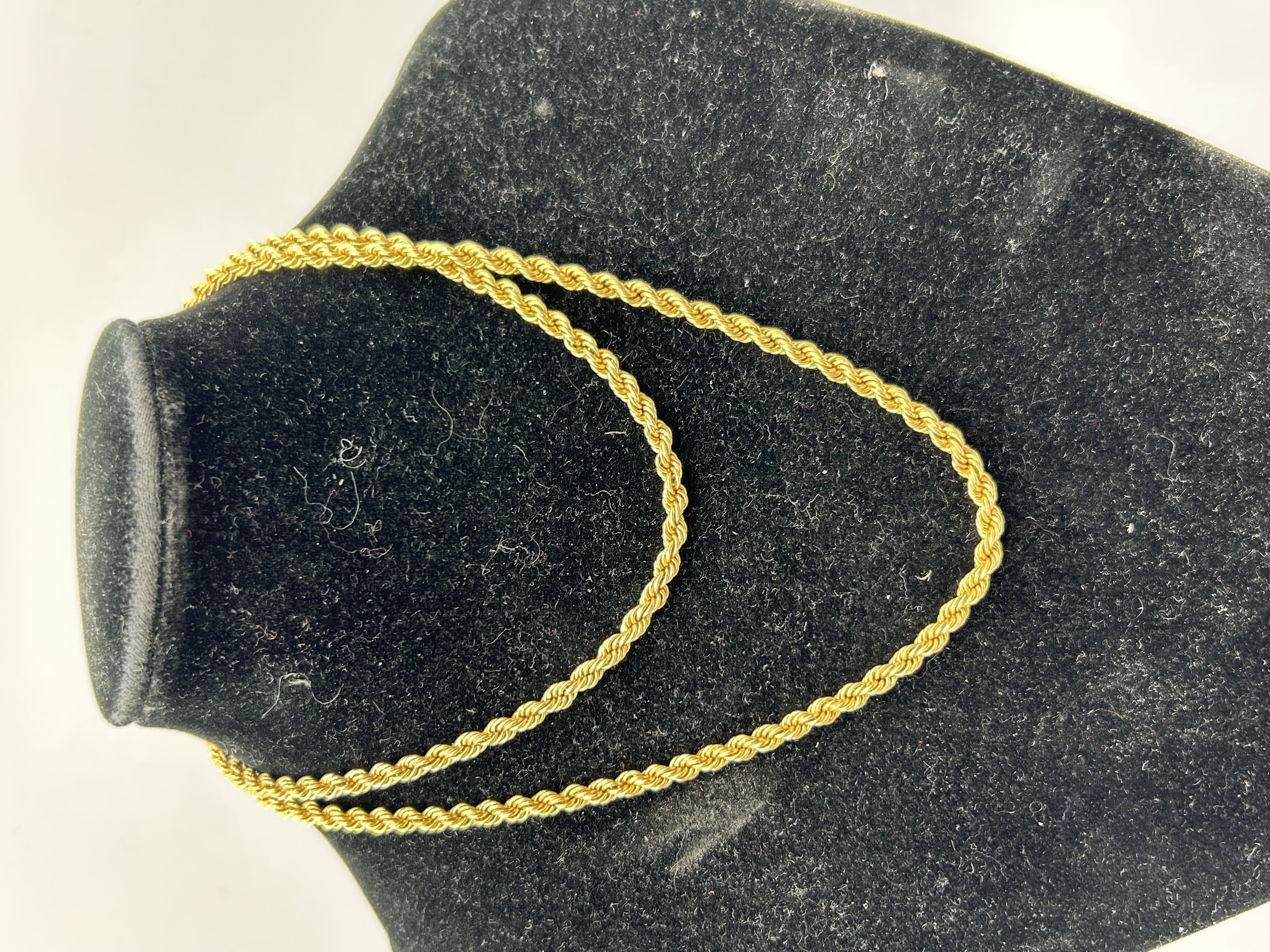 A 9ct yellow gold rope chain necklace featuring a hollow, twisted-link design. The piece is secured by a spring ring clasp and includes an elongated hallmark tag. The tag is stamped 9ct gold purity. The chain displays a bright, reflective finish throughout the weave.