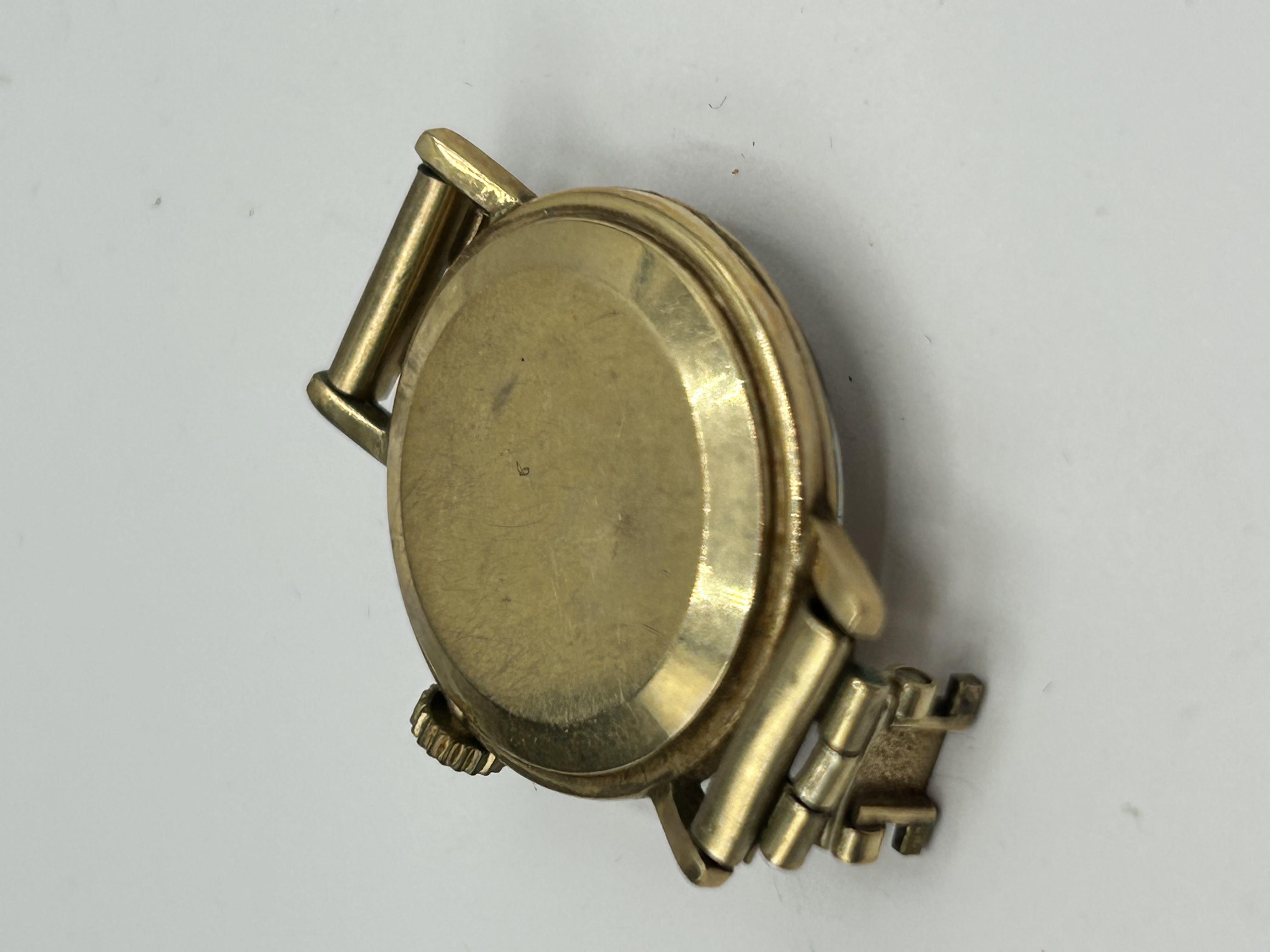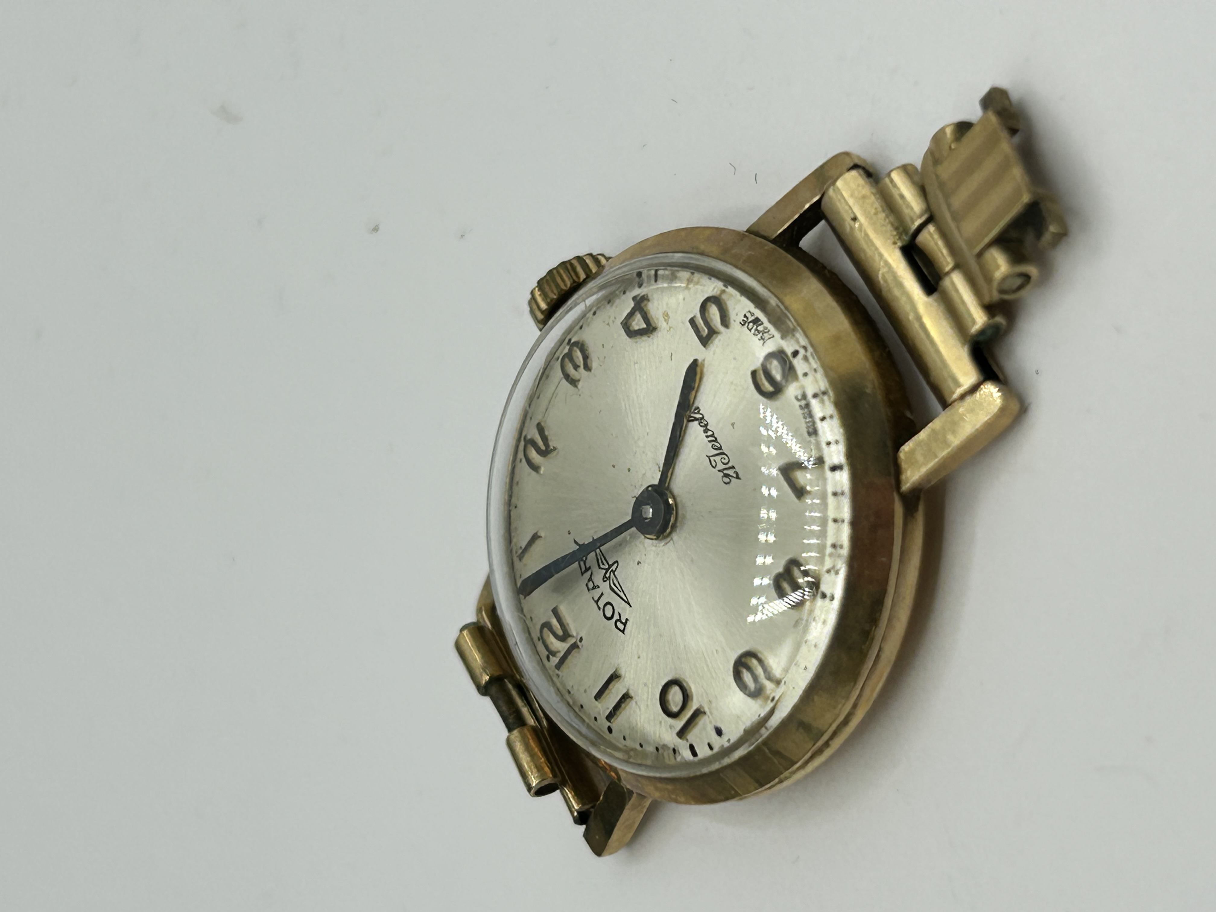 A vintage Rotary mechanical wristwatch featuring a 9ct gold round case and a champagne-colored sunburst dial. The dial is detailed with black Arabic numeral hour markers, black hands, and a center sweep seconds hand, and is marked with the Rotary brand name, its winged logo, and 21 Jewels. The watch includes a domed crystal and is presented on a partial gold-tone metal bracelet with expanding links. The plain, polished case back shows surface wear and scratches consistent with age.