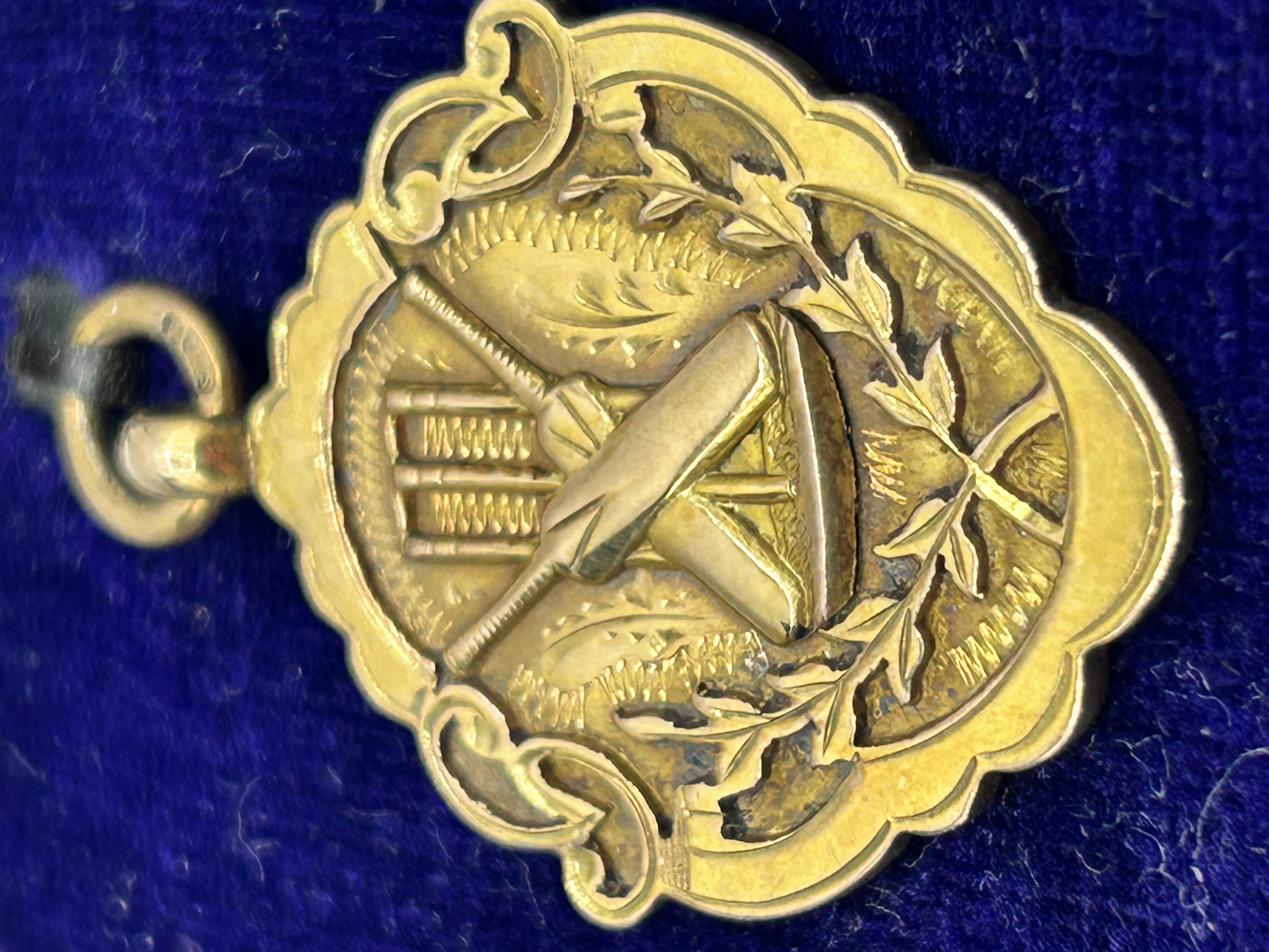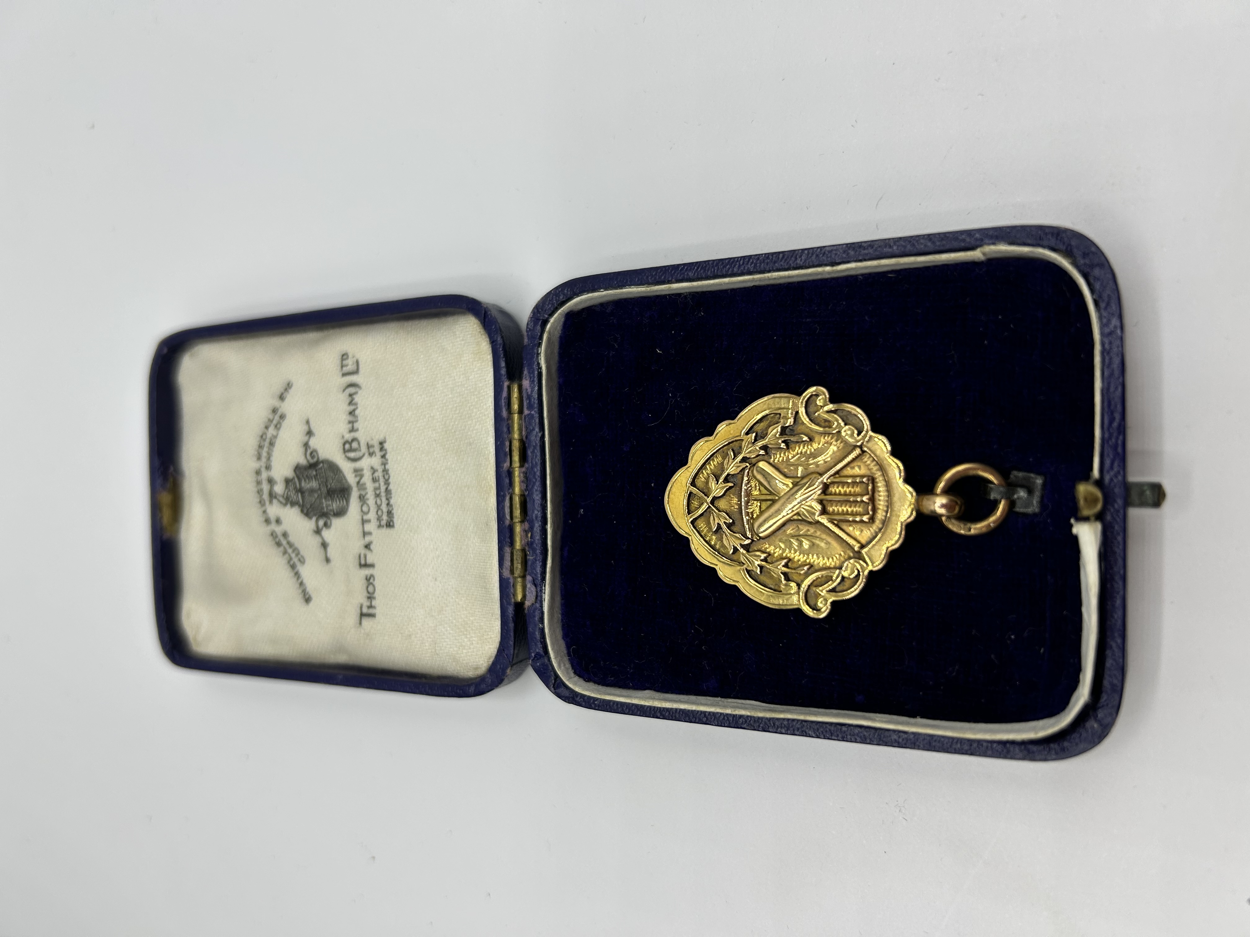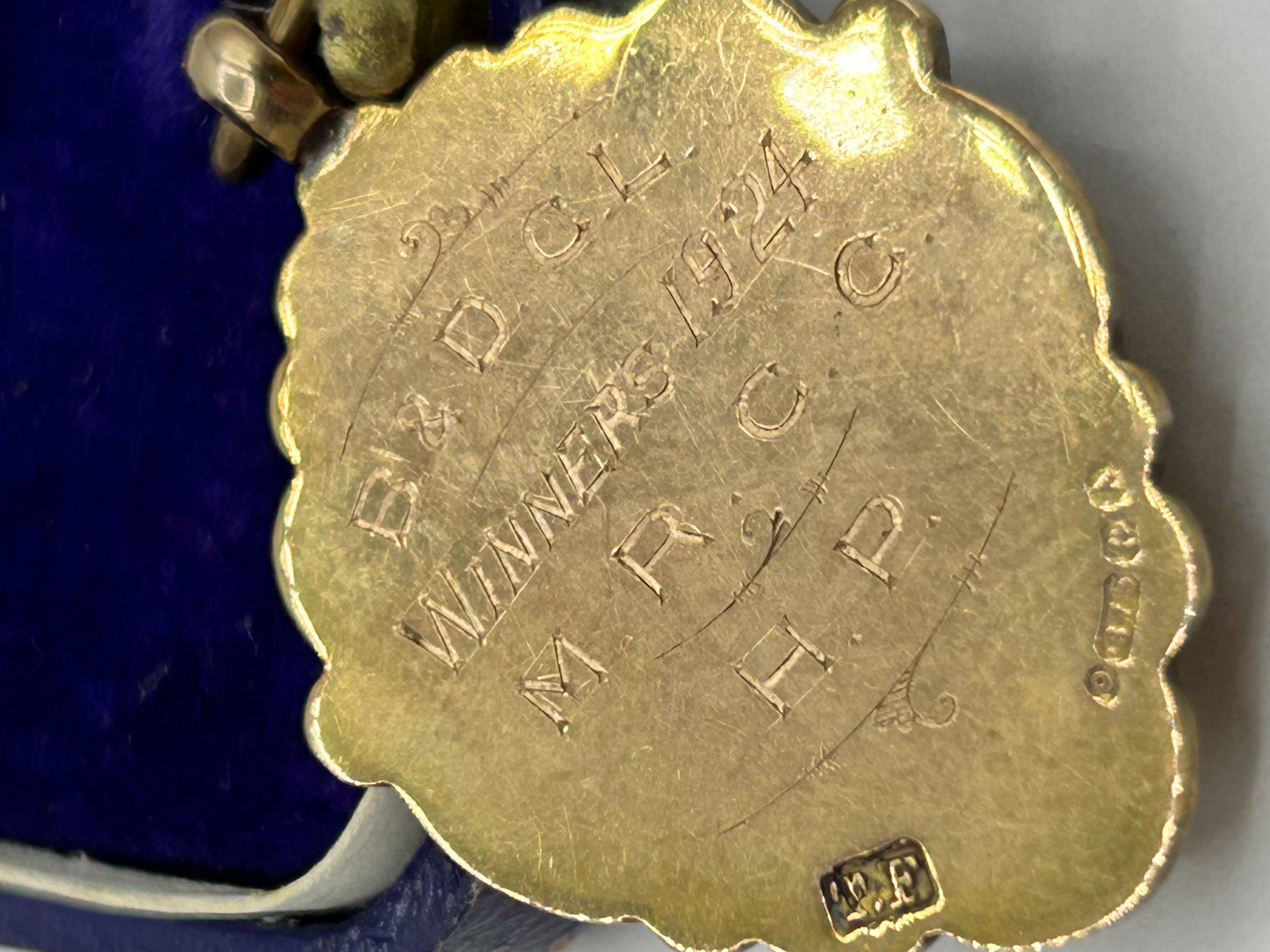 A 9-karat gold cricket winner’s medal or fob produced by Thomas Fattorini. The obverse features an embossed design depicting crossed bats, a ball, and stumps, framed by foliate and scrollwork borders. The reverse is hand-engraved with the inscription B & D C L WINNERS 1924 M. R. C. C. H. P. and bears full British hallmarks for 9ct gold, including the Birmingham anchor, the date letter z for 1924, and the T.F maker’s mark. The item is presented in its original blue velvet and silk-lined presentation case, with the interior lid stamped for Thos Fattorini (B’Ham) Ltd, Hockley St. Birmingham.