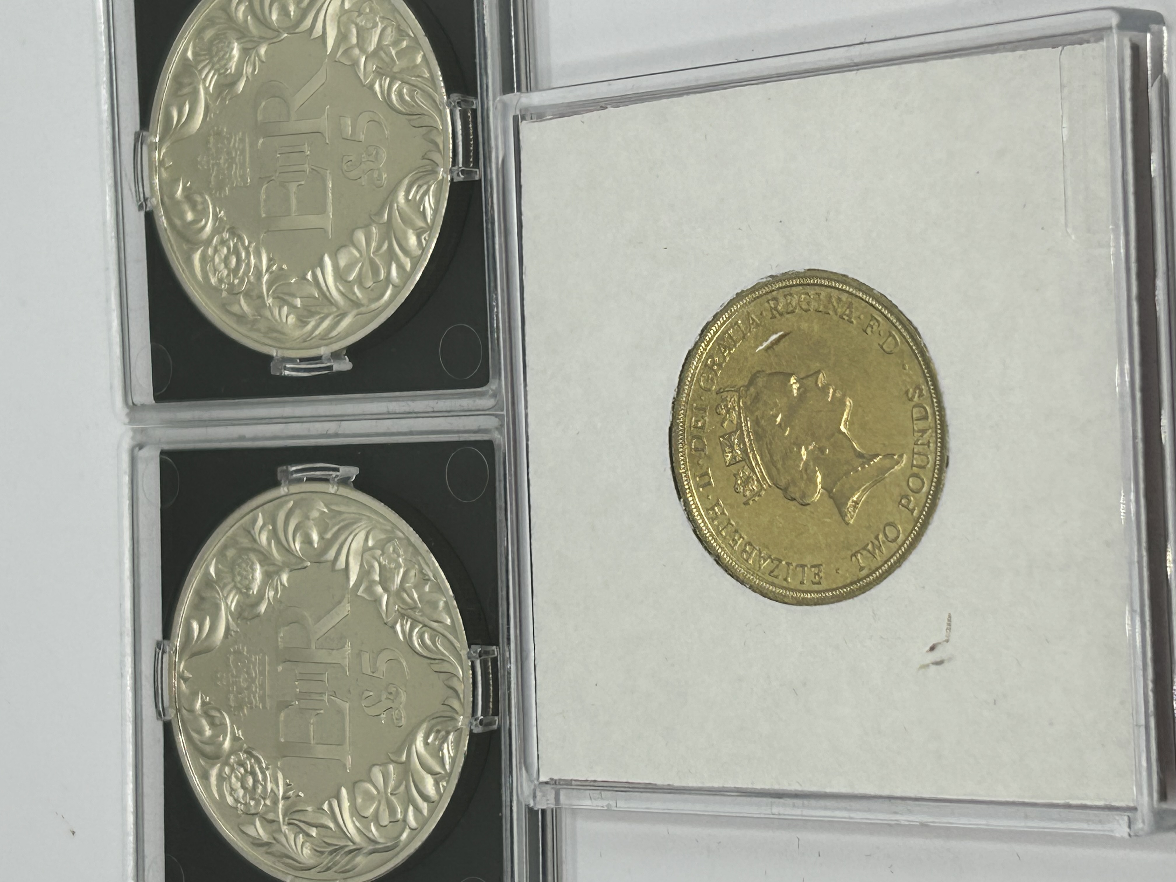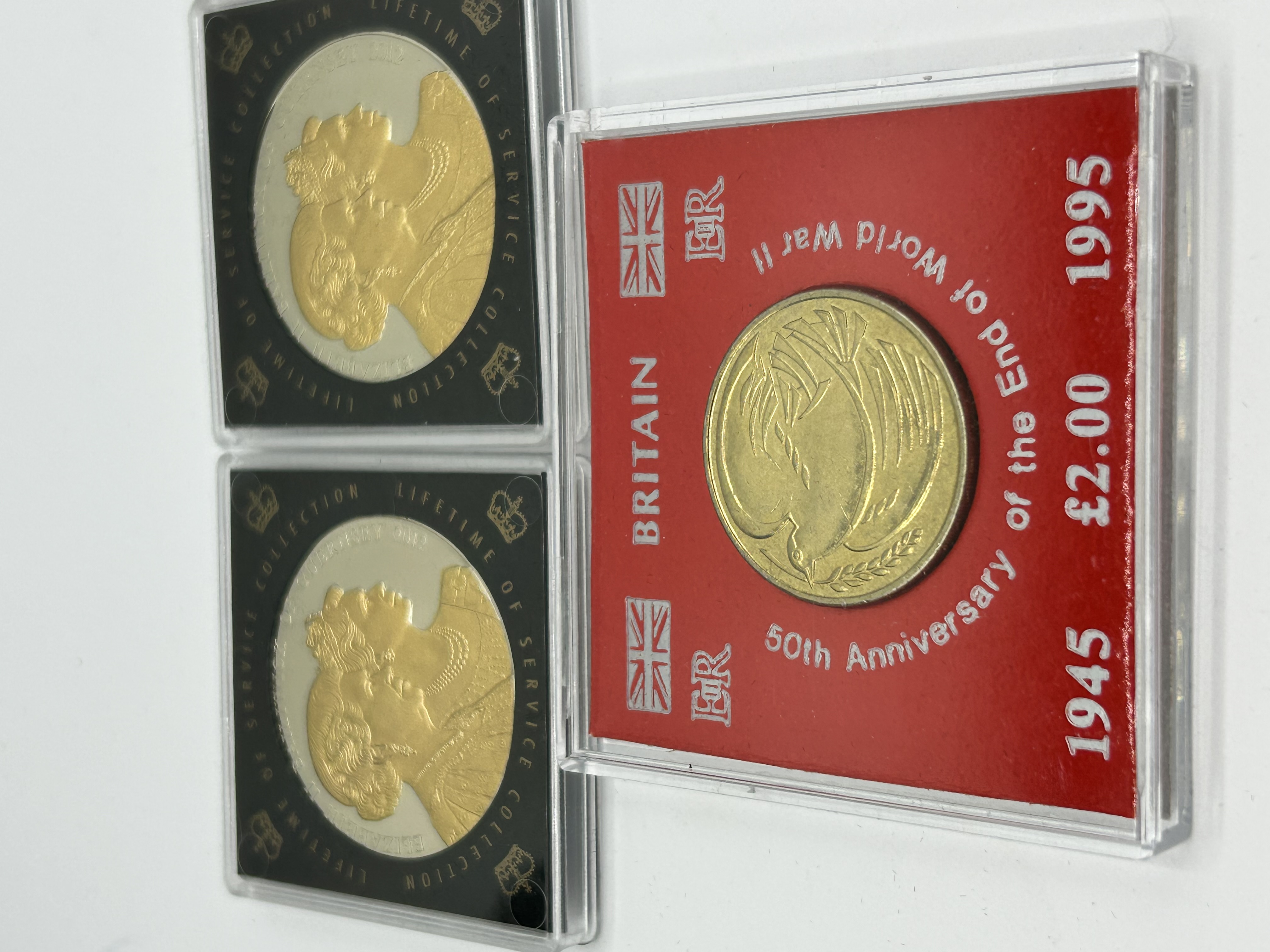 A collection of three commemorative coins comprising two Guernsey five-pound coins and one United Kingdom two-pound coin. The two 2012 Guernsey coins are from the Lifetime of Service collection, featuring silver-toned fields with gilded obverse portraits of Queen Elizabeth II and reverses displaying the EIIR cypher within a floral wreath. The 1995 United Kingdom two-pound coin commemorates the 50th anniversary of the end of World War II, featuring a dove of peace on the reverse and the royal portrait on the obverse. This coin is struck in a gold-colored metal and is presented in a red card insert labeled Britain. All items are housed in clear protective acrylic capsules.