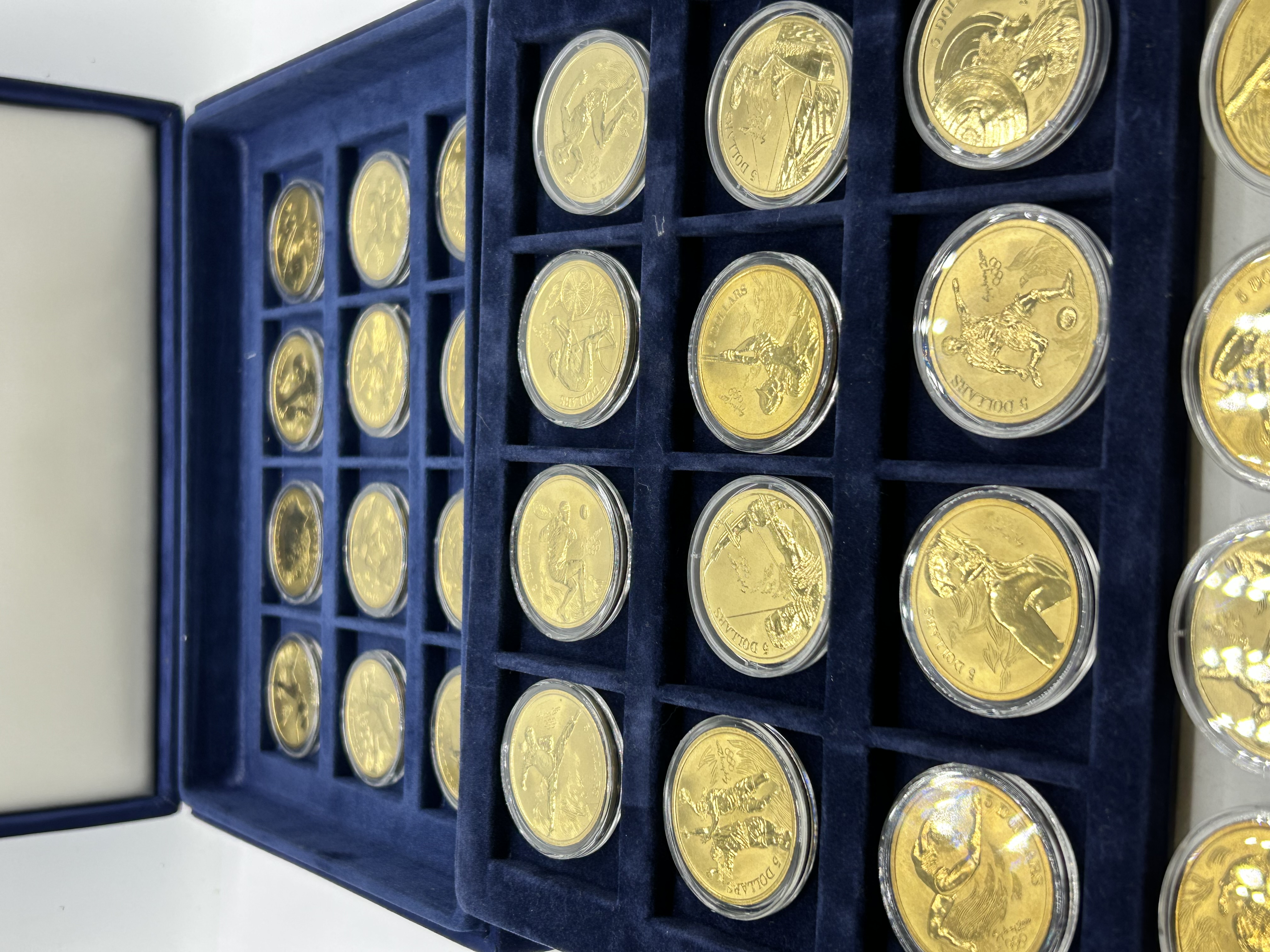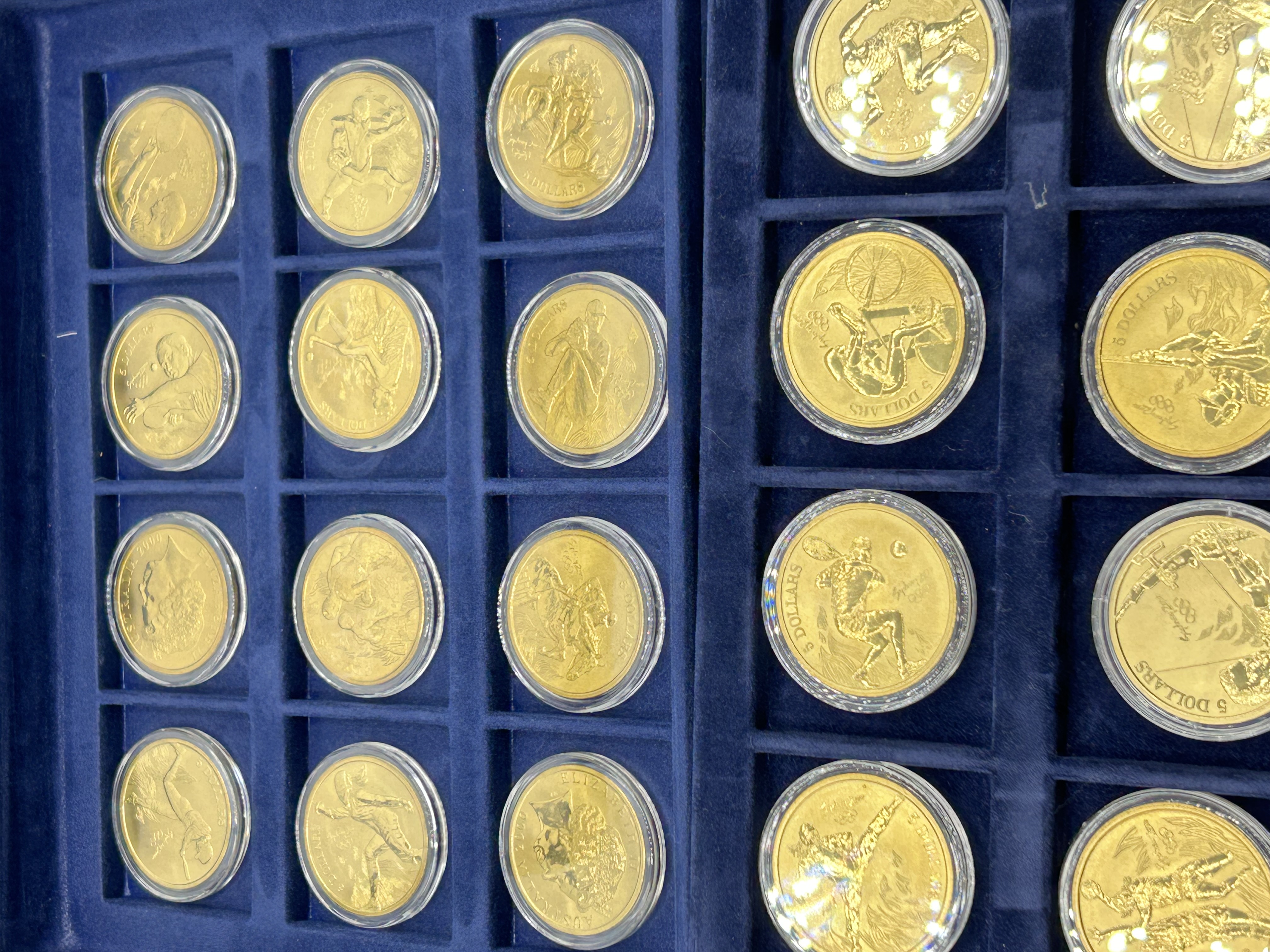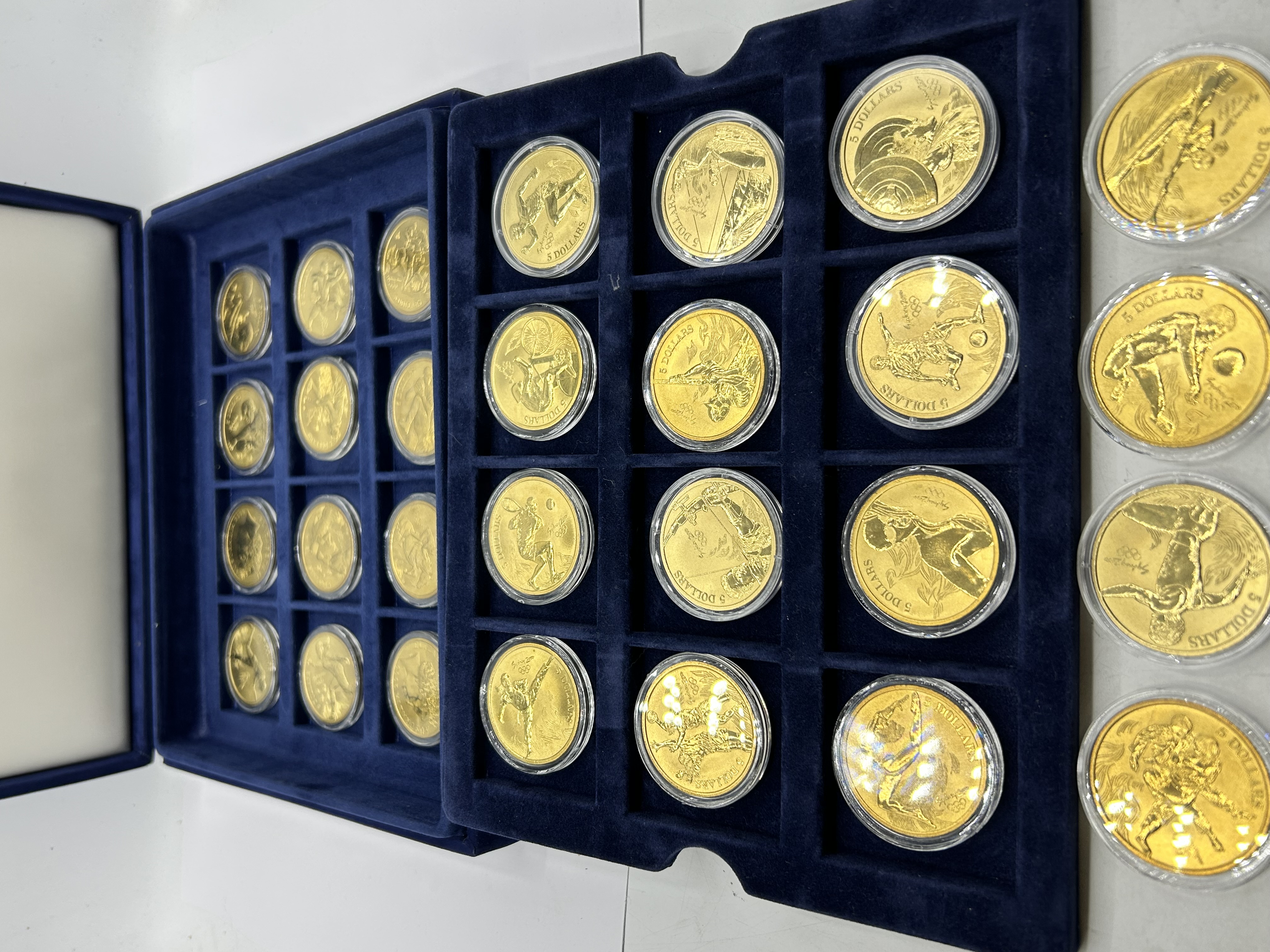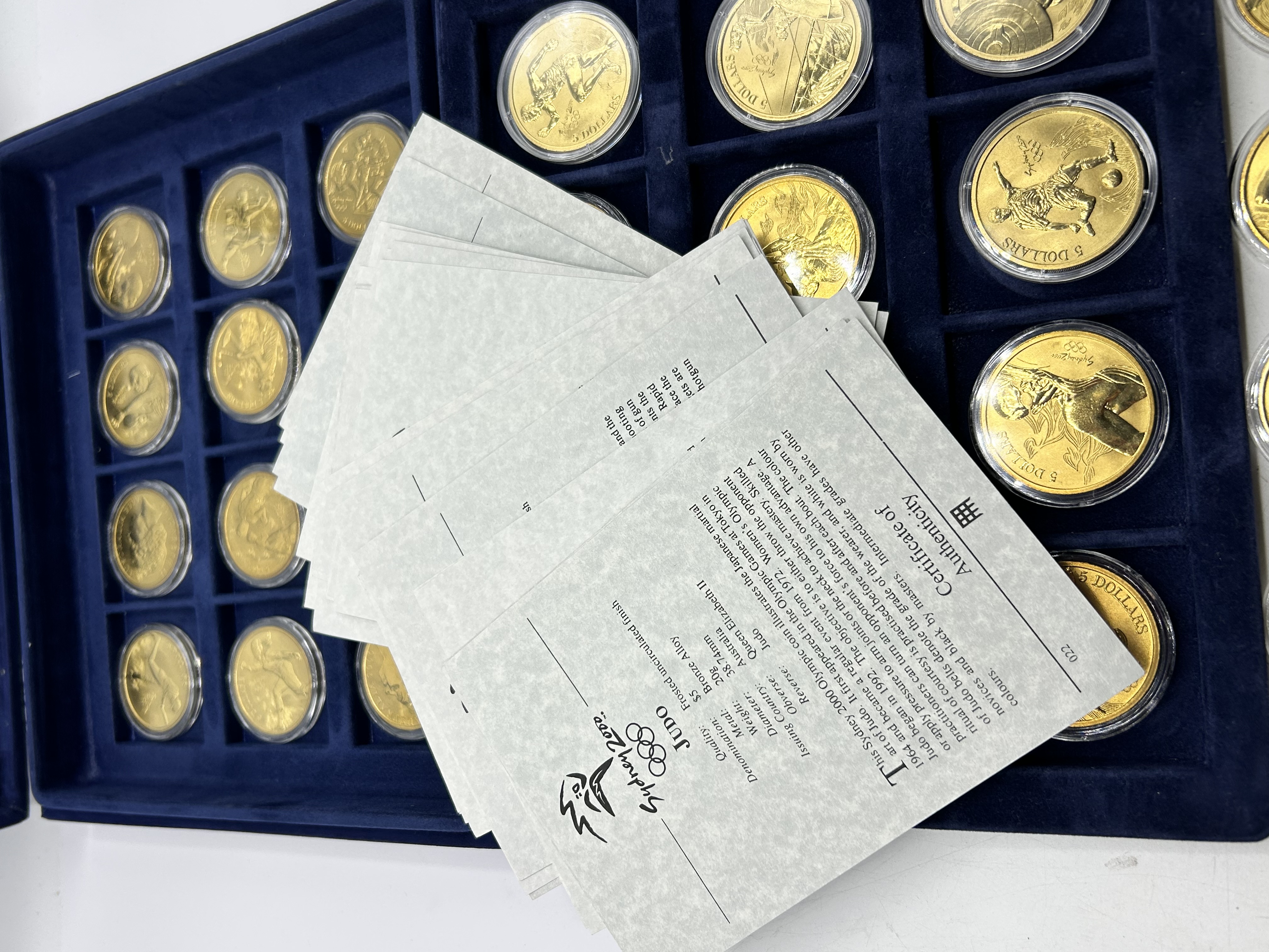 A collection of Australian five-dollar commemorative coins issued for the Sydney 2000 Olympic Games. Each coin is struck in a gold-toned bronze alloy with a frosted uncirculated finish. The obverse of each coin features the effigy of Queen Elizabeth II, dated 2000, with the inscription Australia. The reverse designs depict various Olympic sporting disciplines, including judo, soccer, and cycling, among others. The coins are housed in individual clear protective acrylic capsules and presented within blue velvet-lined display trays. The collection is accompanied by several individual certificates of authenticity providing technical specifications for each sport-themed coin.