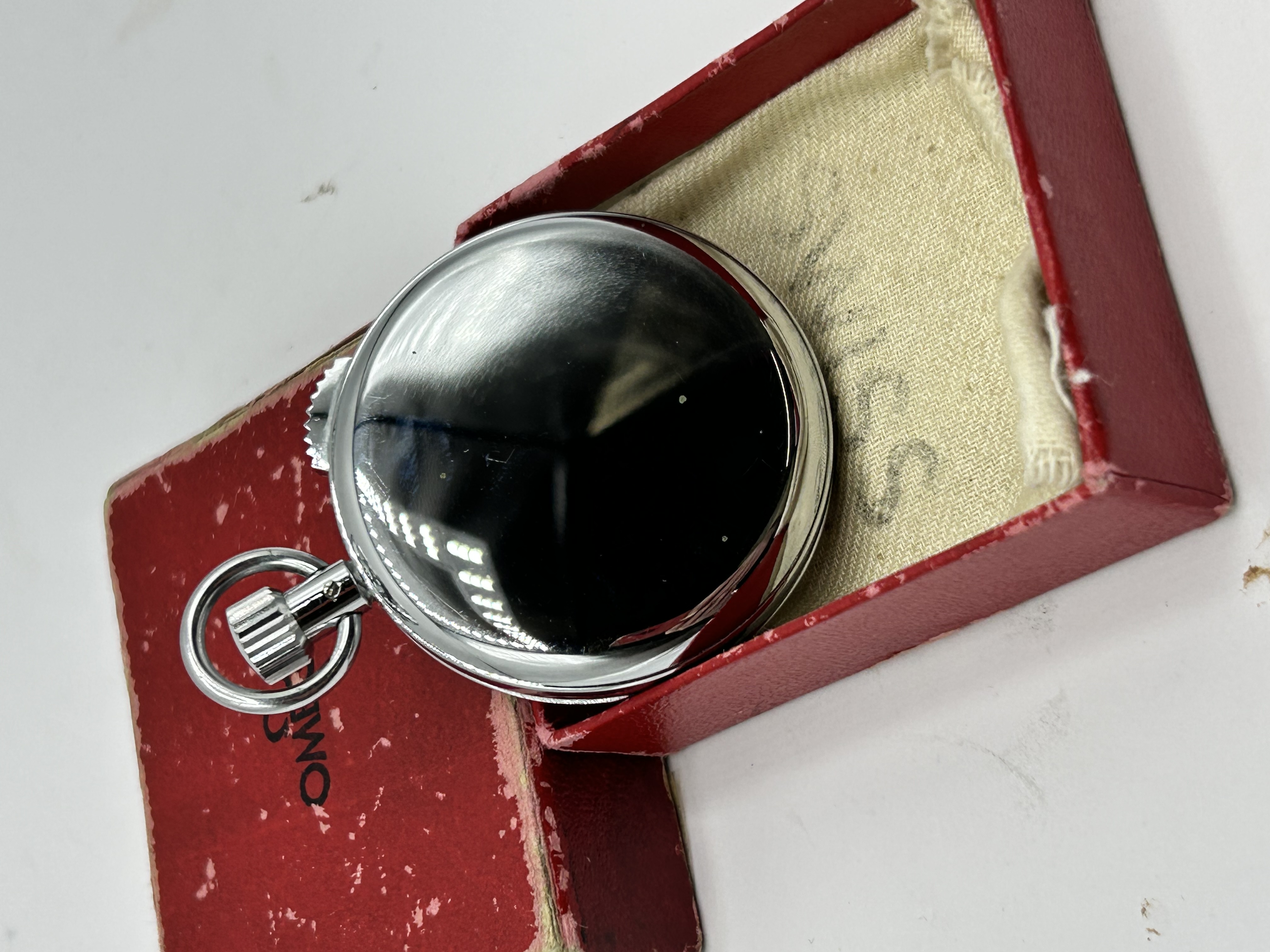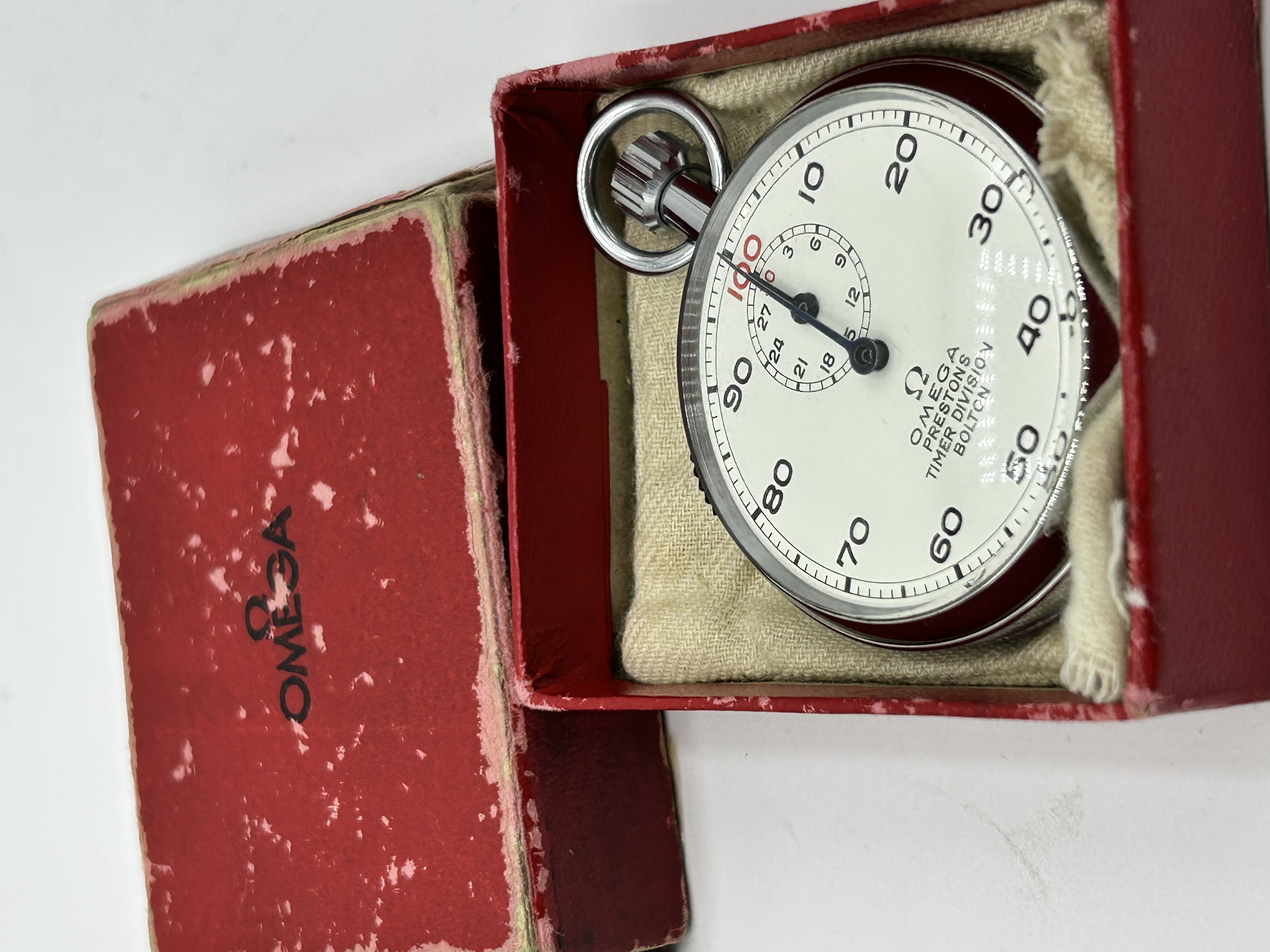 A vintage Omega mechanical stopwatch distributed by Prestons Timer Division, Bolton. The timepiece features a chrome-finished metal case with a large knurled crown and a suspension loop. The white dial is configured with a decimal scale, featuring black Arabic numerals from 10 to 90 and a red 100 at the twelve o’clock position. It includes a small 30-minute sub-dial located below the twelve o’clock position. The dial is marked with the Omega logo and the inscription OMEGA PRESTONS TIMER DIVISION BOLTON. The stopwatch is housed in its original red branded cardboard presentation box.