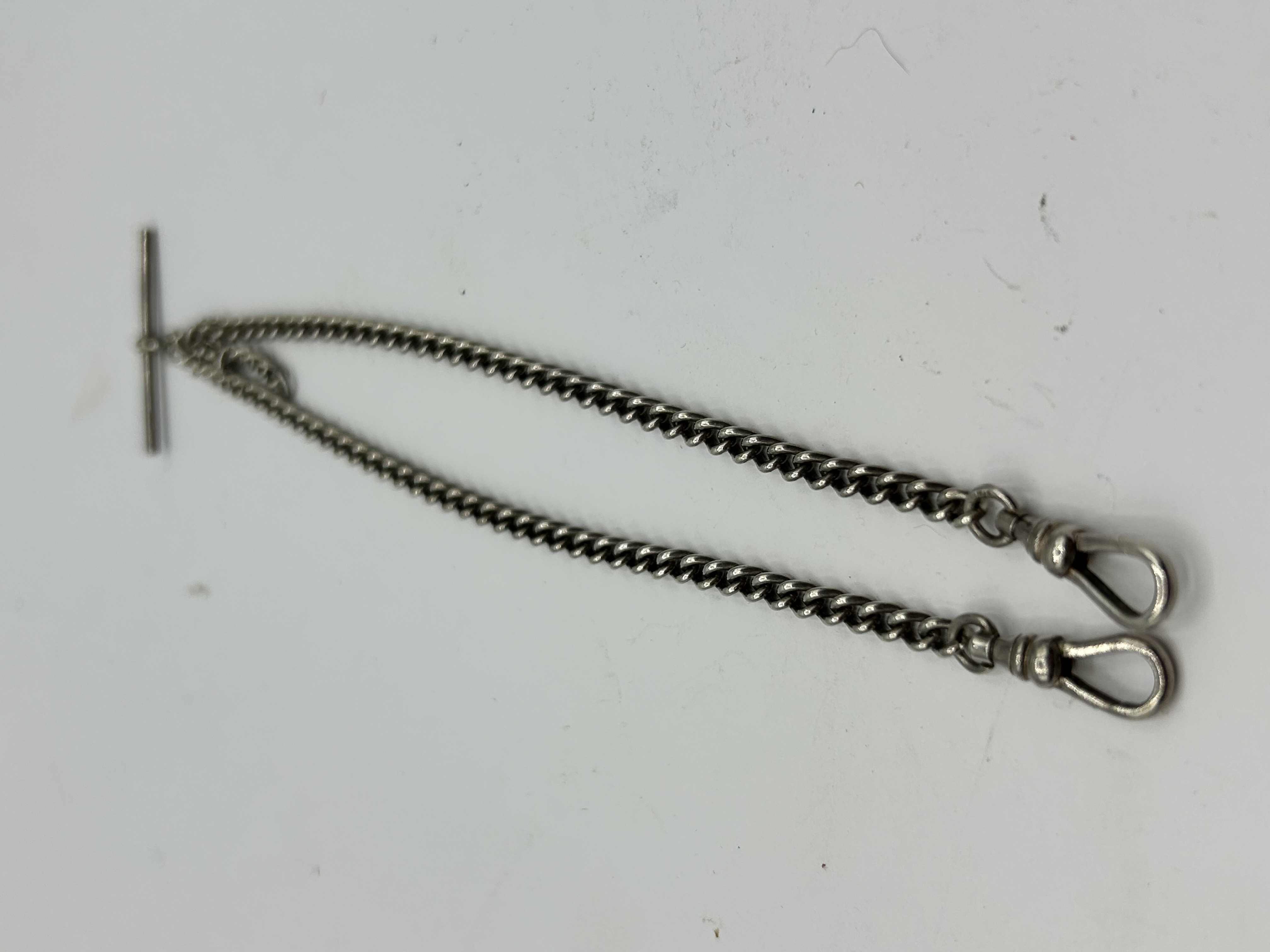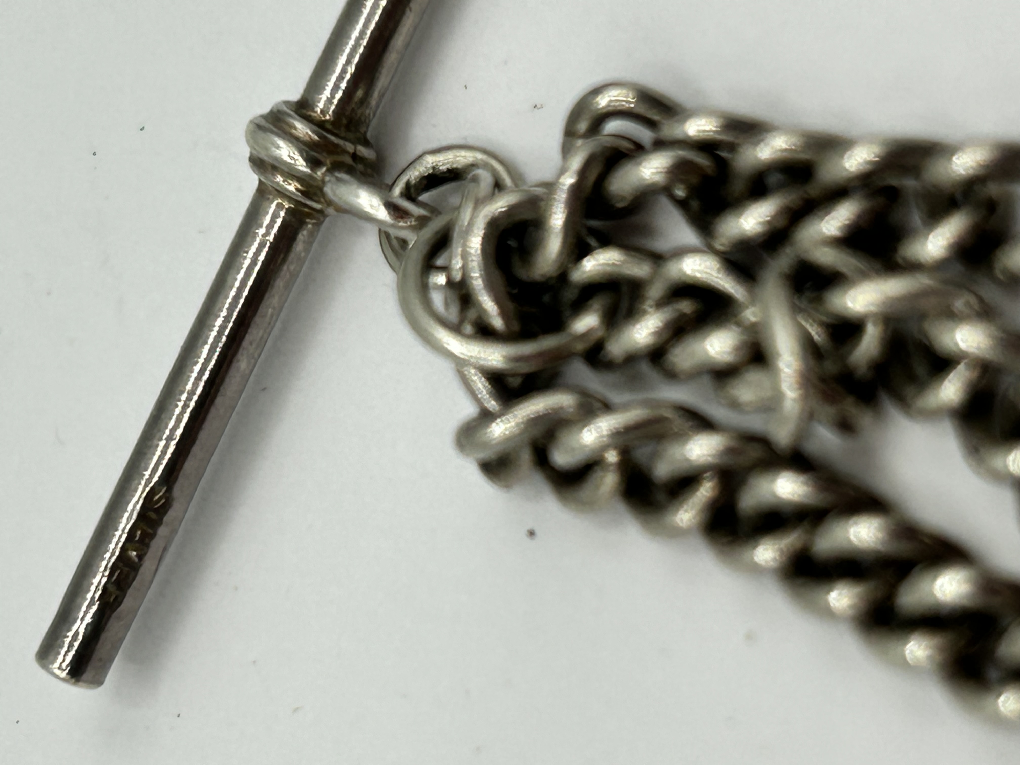 A silver double Albert pocket watch chain featuring two parallel curb-link chains. Each chain terminates in an individual swivel dog clip clasp. The chains are joined at a central jump ring assembly that holds a T-bar fastener. The T-bar is stamped with the word SILVER.