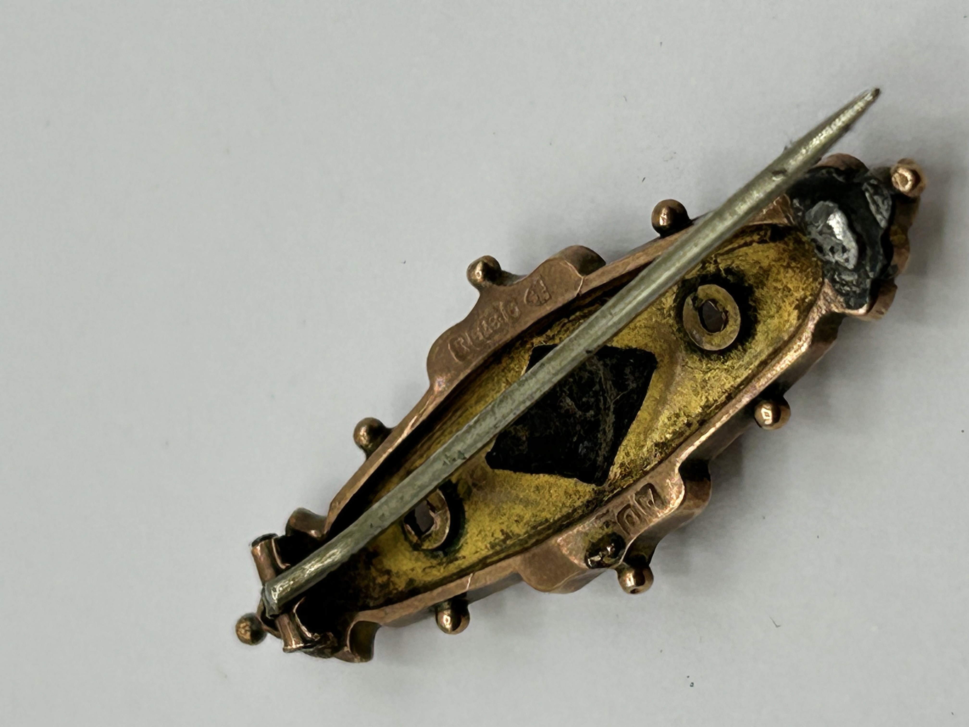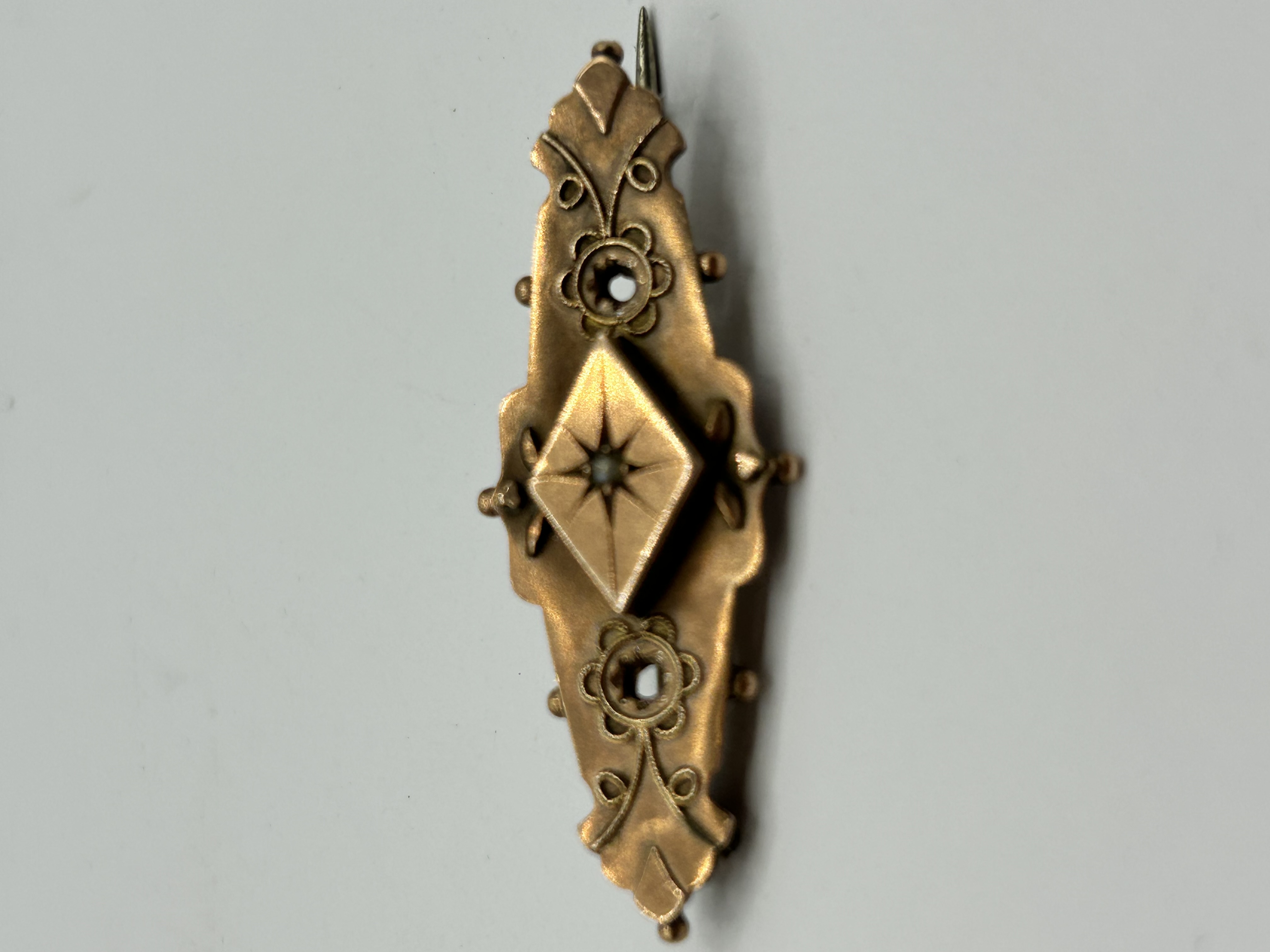 A Victorian-style 9ct gold bar brooch of elongated lozenge form, weighing 1.8g. The design reflects the Etruscan Revival style, featuring a central raised diamond-shaped boss set with a single seed pearl in a star-shaped mount. The body is decorated with scrolled floral motifs, two circular openwork apertures, and small applied bead accents along a scalloped border. The reverse is stamped alongside an indistinct maker mark.