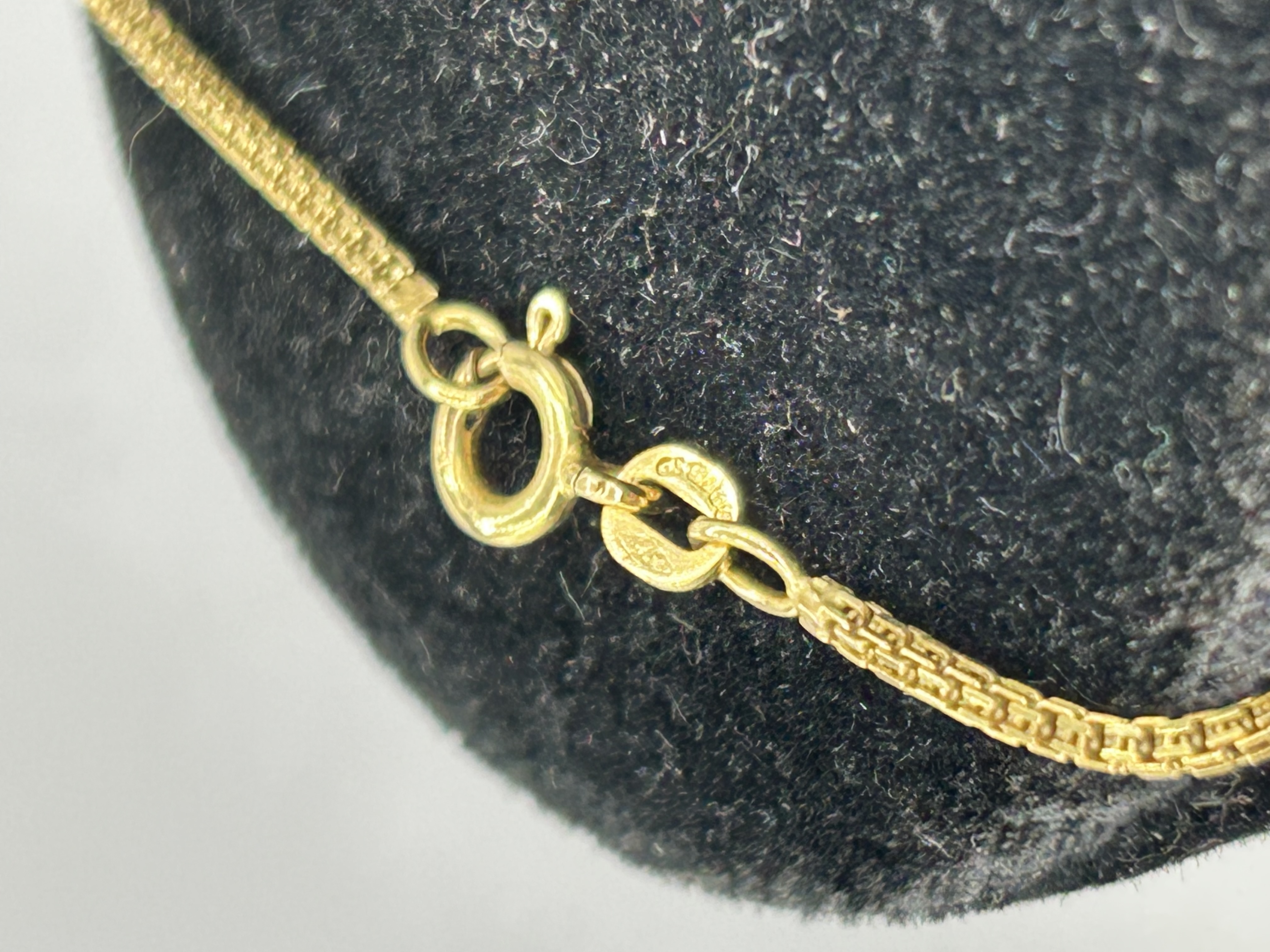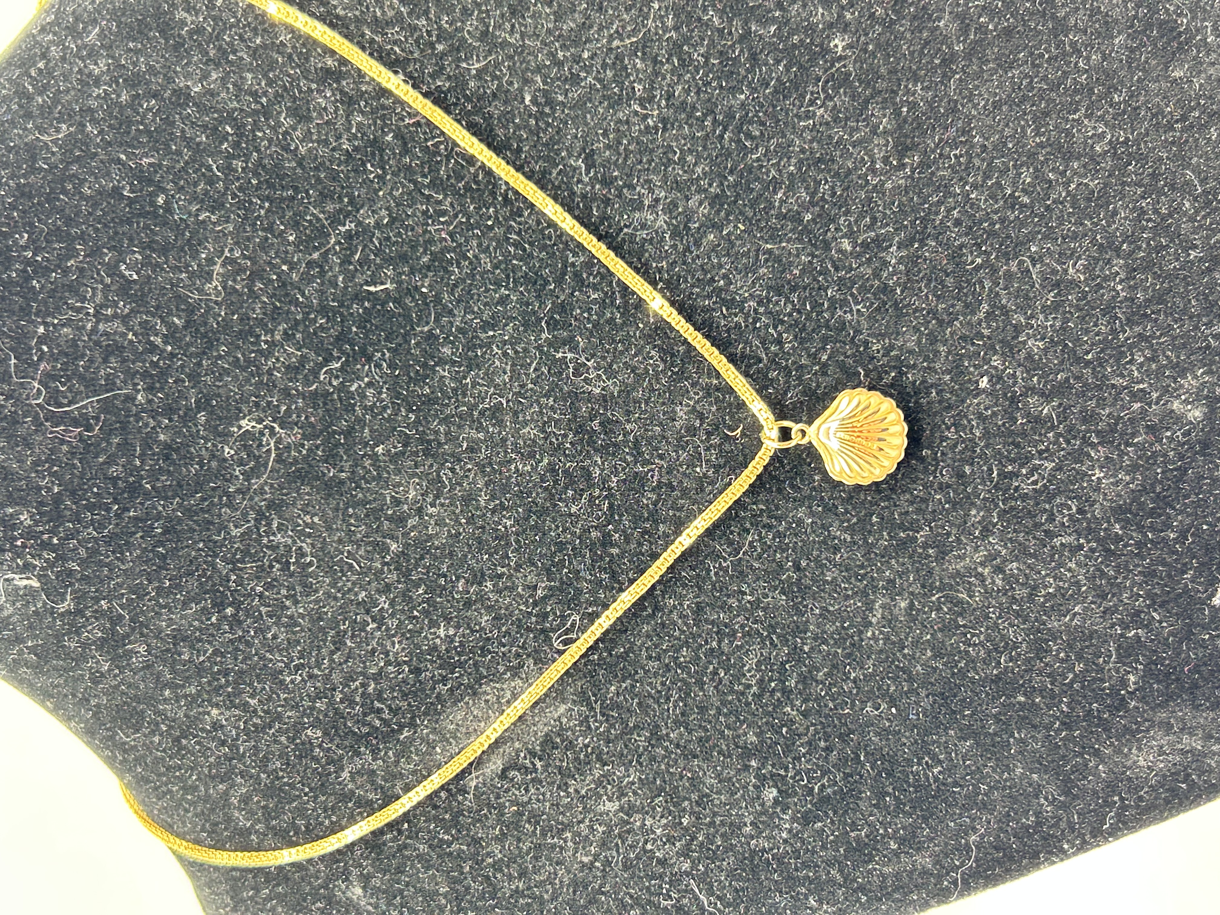 A yellow gold necklace featuring a box-link chain and a textured seashell-shaped pendant. The pendant is suspended from a jump ring. The necklace is secured with a spring ring clasp. An oval hallmark tag is attached to the clasp, stamped with 750 and other partially legible maker marks. The piece is finished with a high polish.