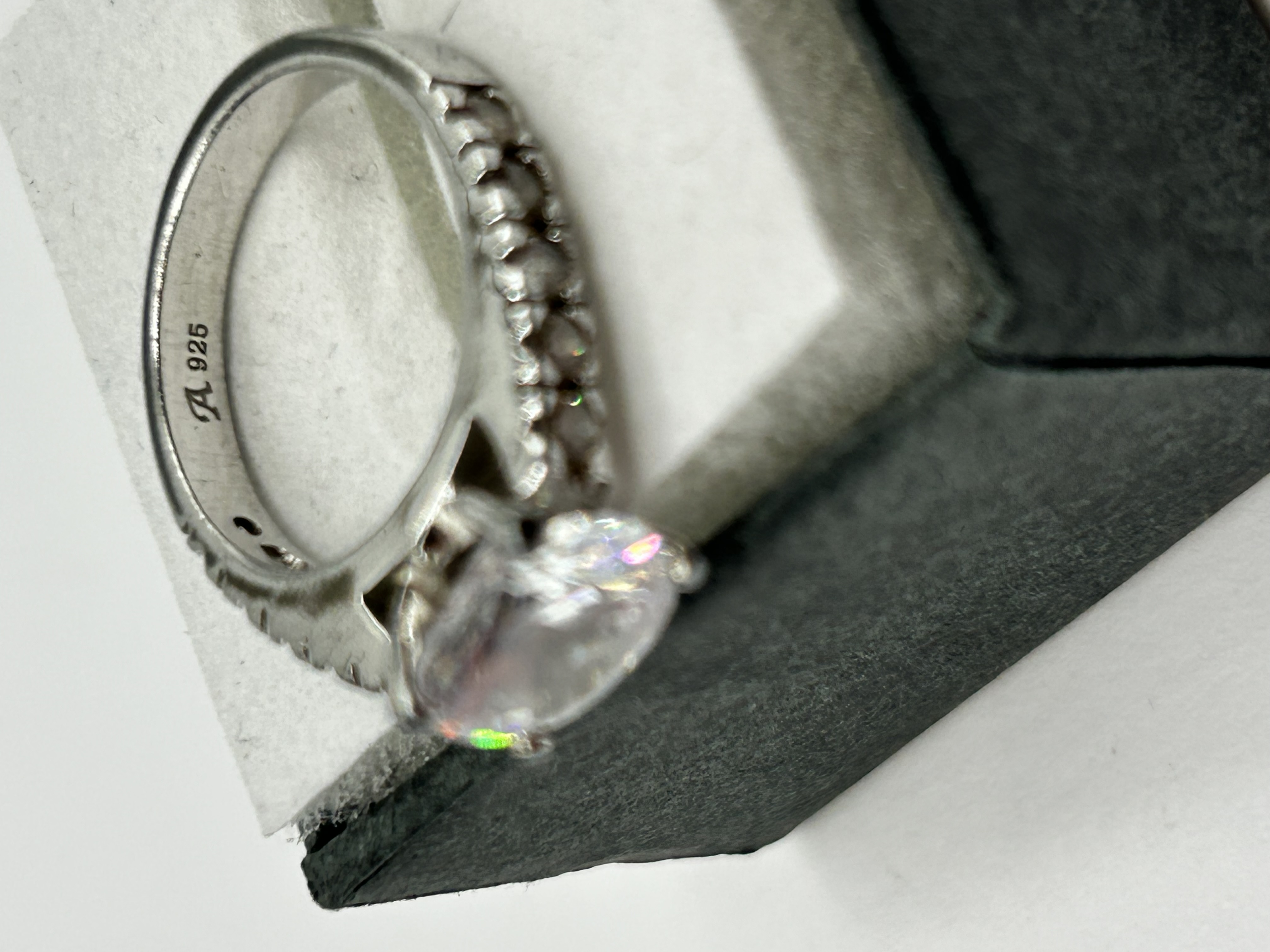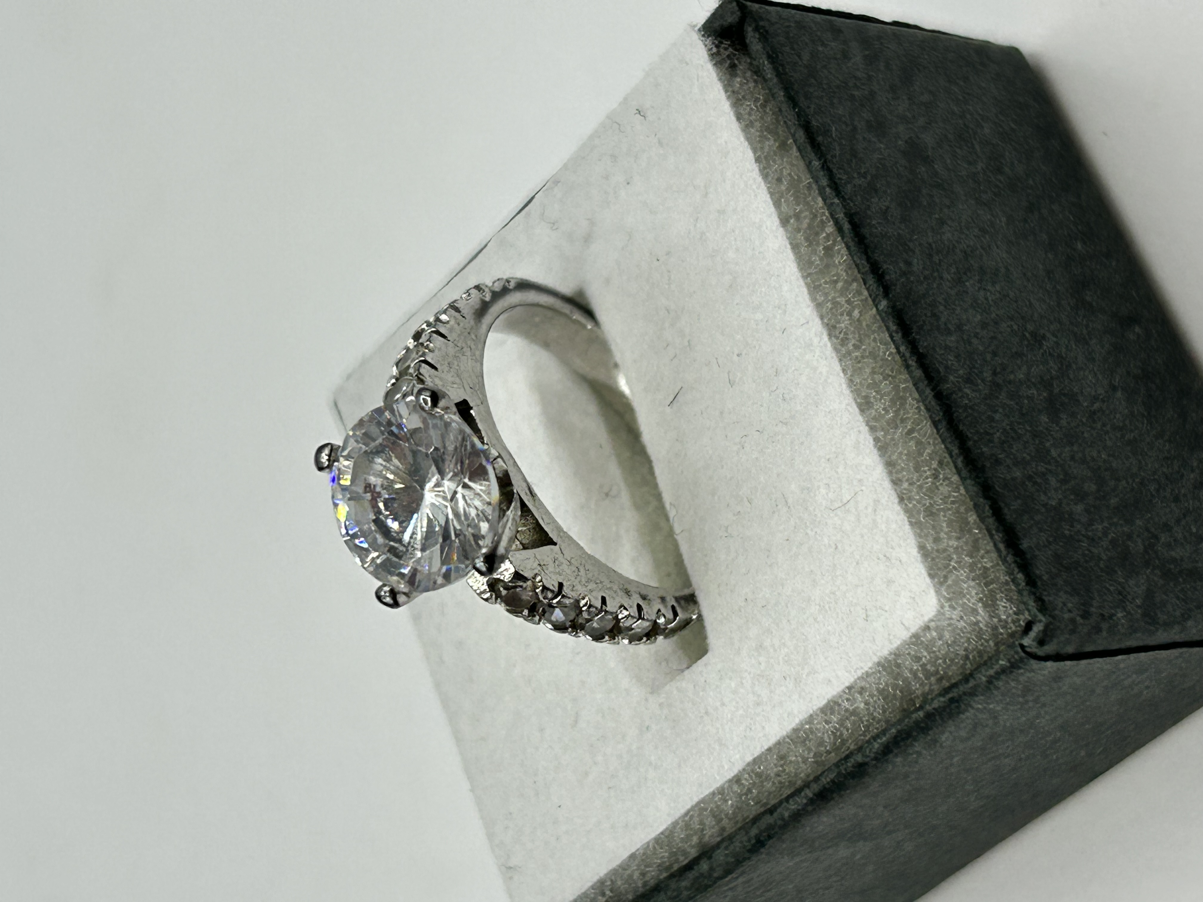 A sterling silver solitaire ring featuring a large round brilliant cut clear center stone. The center stone is secured in a four-prong setting and is flanked by a row of smaller clear accent stones along the shoulders of the band. The interior of the shank is stamped with A 925, indicating its sterling silver composition. The item is presented in a black jewelry box with a white foam insert.