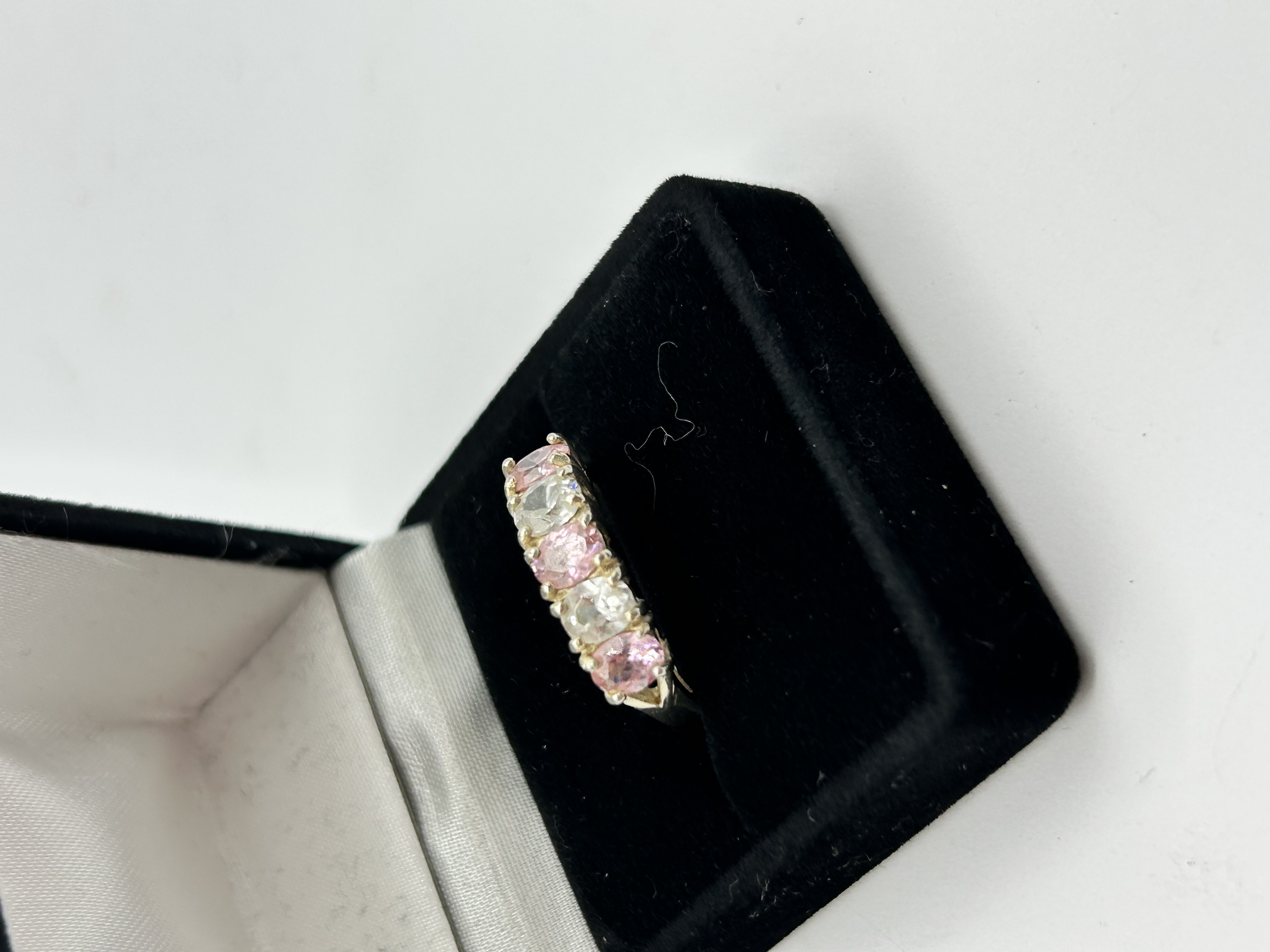 A sterling silver band ring featuring a linear arrangement of five oval-cut faceted stones. The stones alternate between lab-created pink sapphires and clear white zircons, set within a raised, decorative openwork gallery. The inner band bears an indistinguishable hallmark. The piece is presented in a black velvet-lined jewelry box.