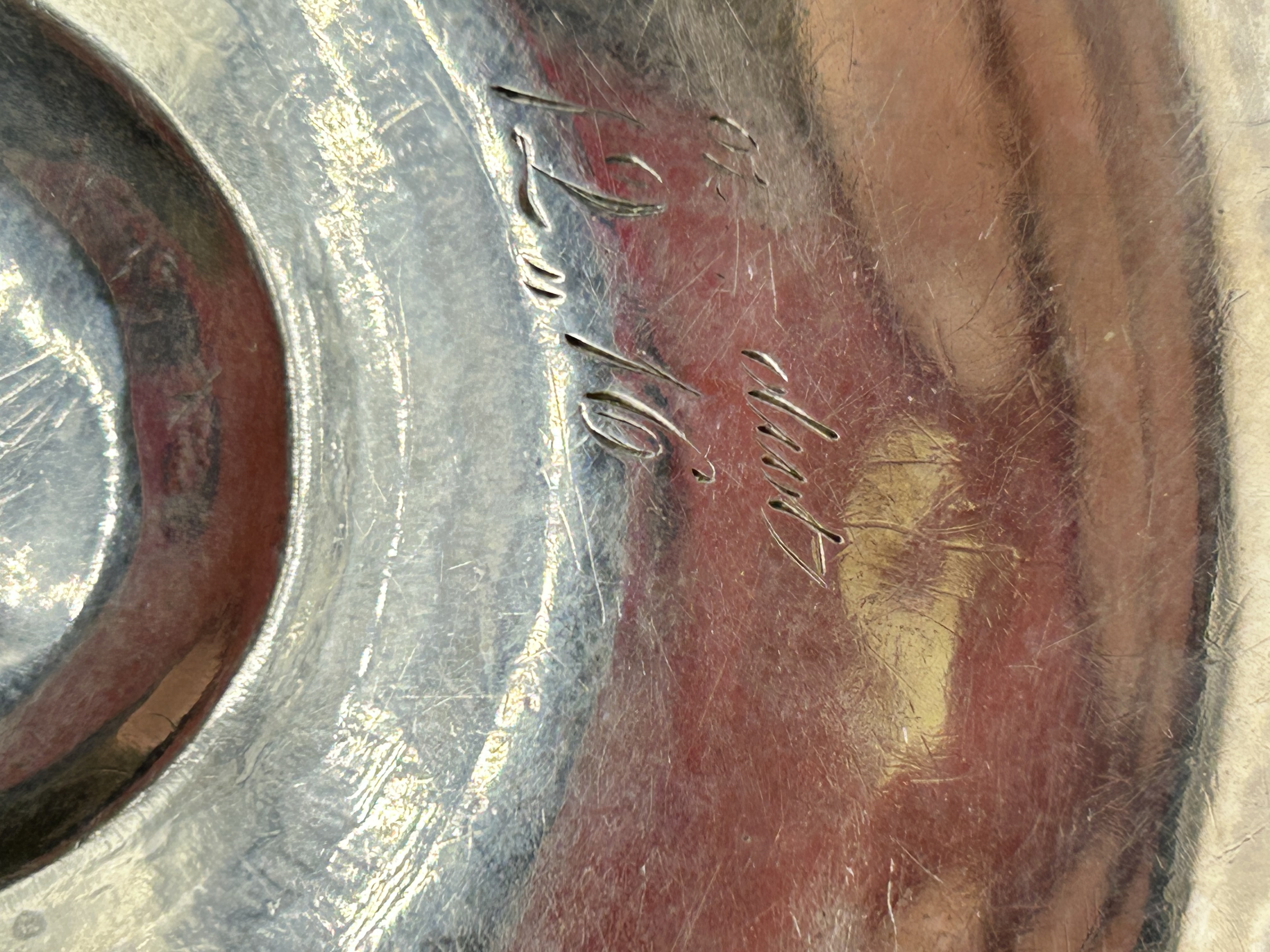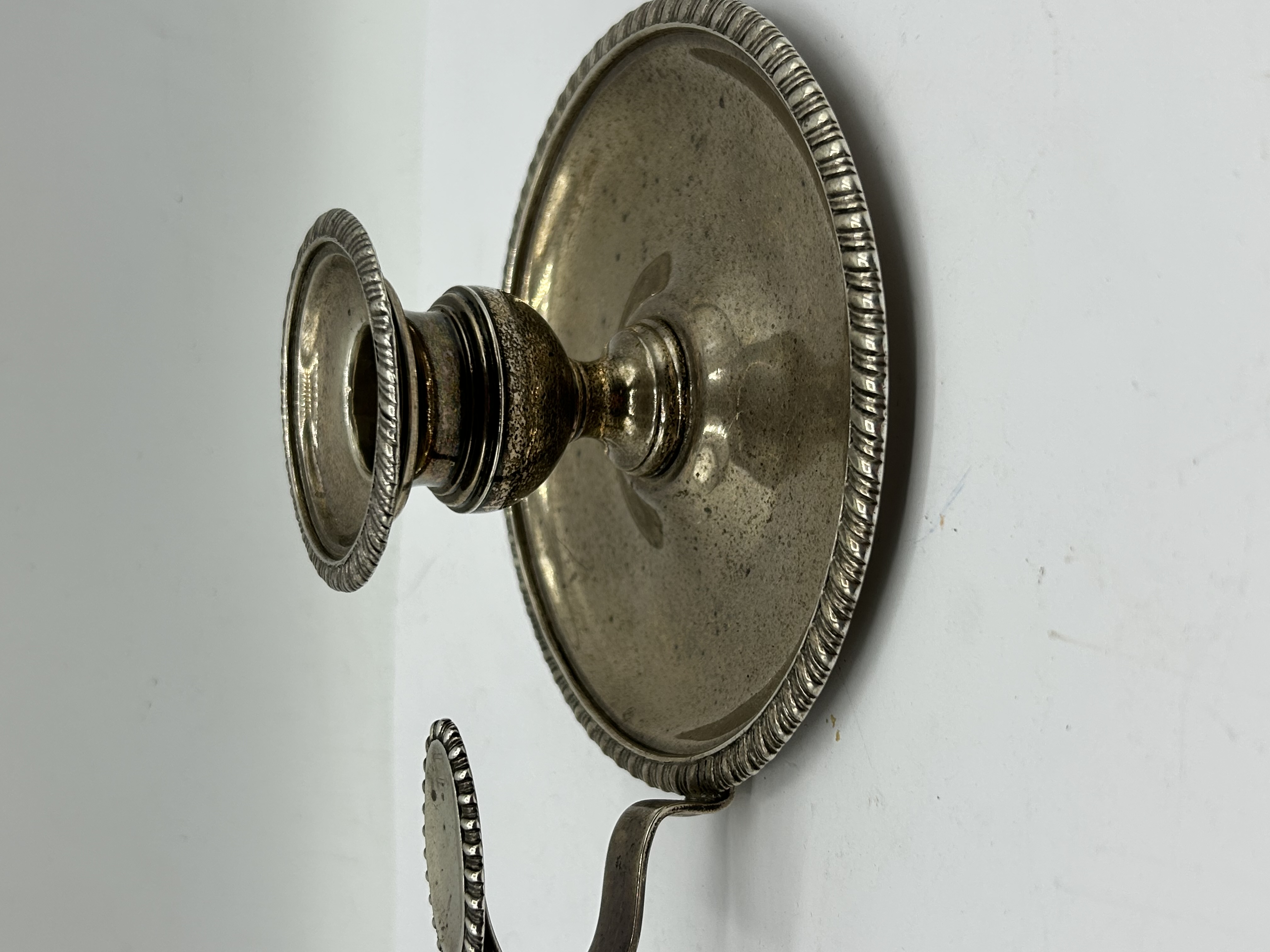 A George III sterling silver chamberstick, London, 1815, bearing the maker mark of William Burwash. The piece features a circular drip pan with a gadrooned rim and a central candle socket with a conforming gadrooned rim. A curved handle is attached to the base, terminating in a gadrooned thumbpiece. The underside of the base displays a clear set of London hallmarks including the lion passant, leopard head crowned, duty mark. Hand-engraved scratch weight or inventory marks are present on the underside.