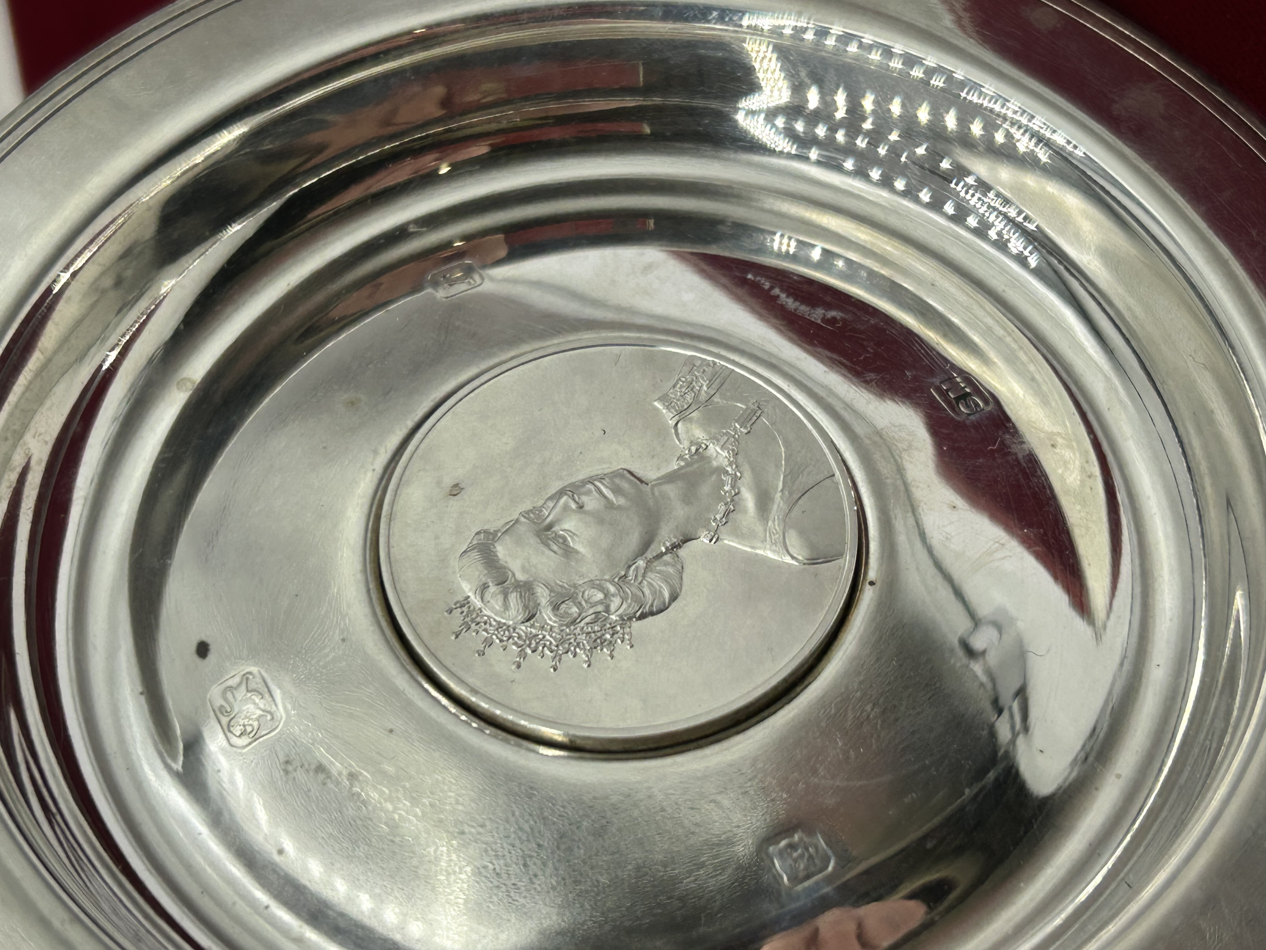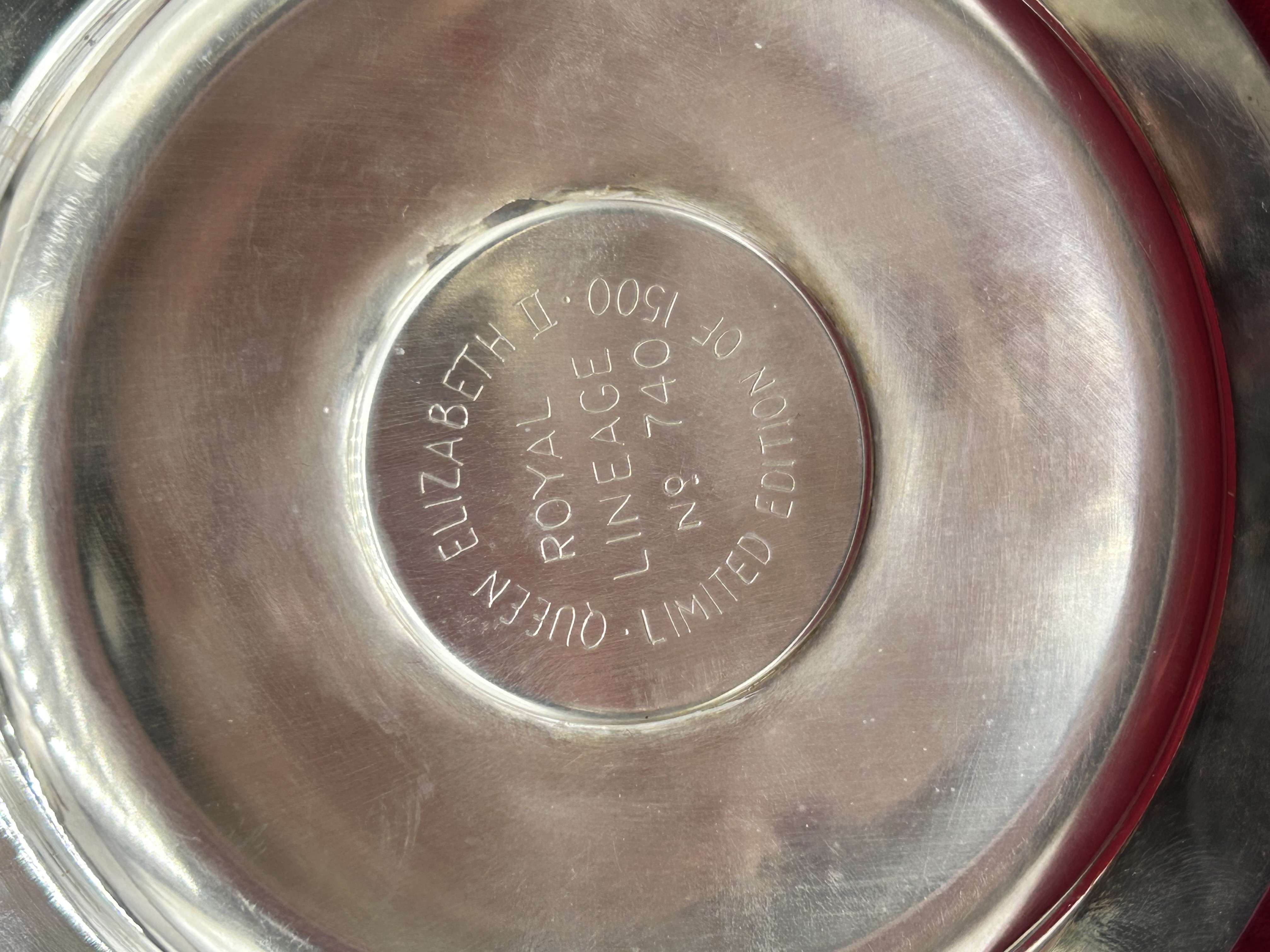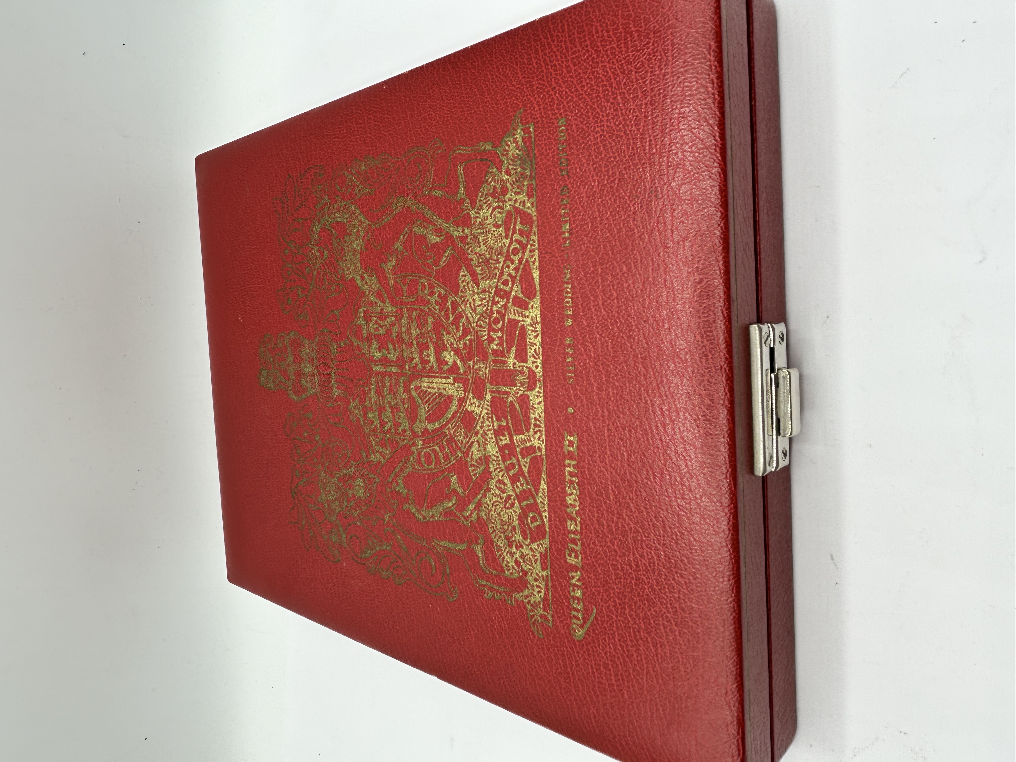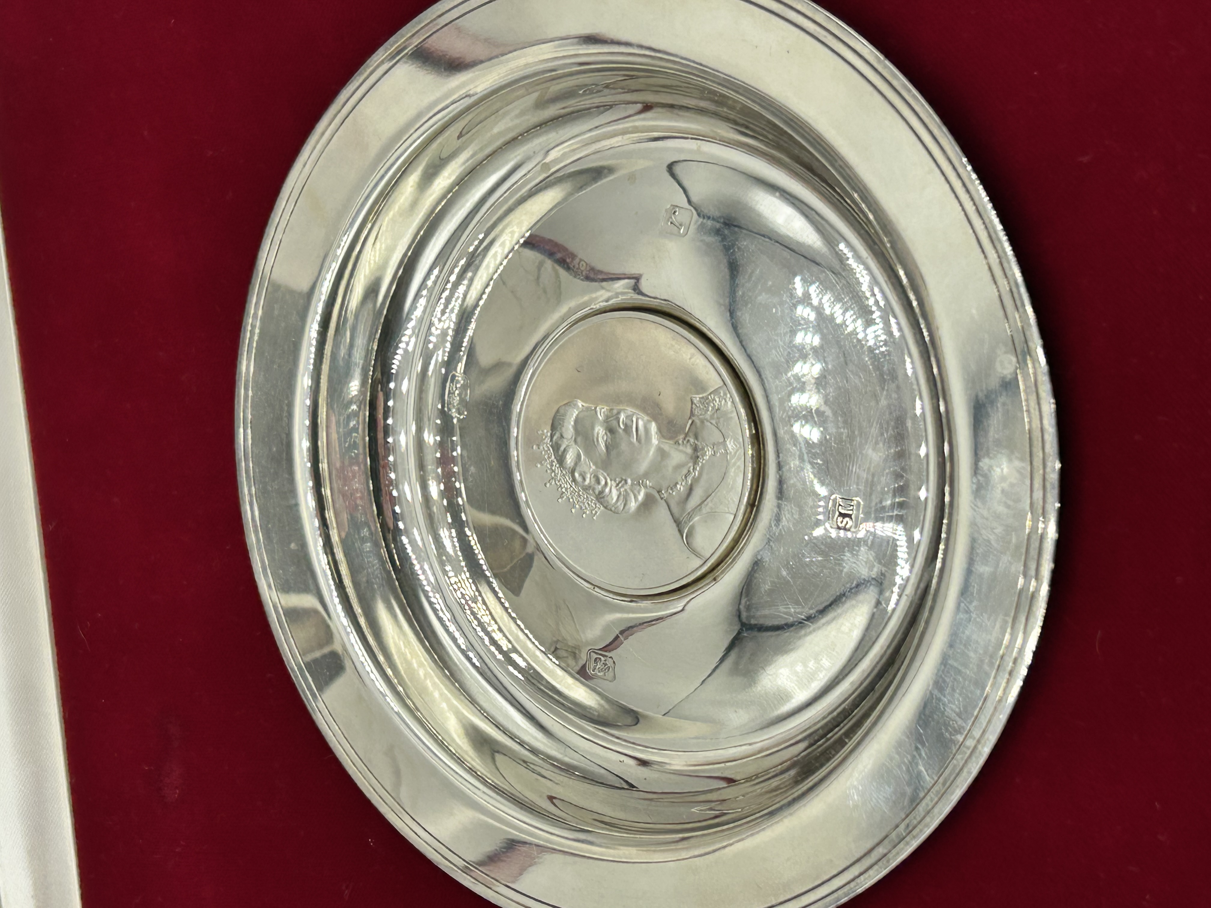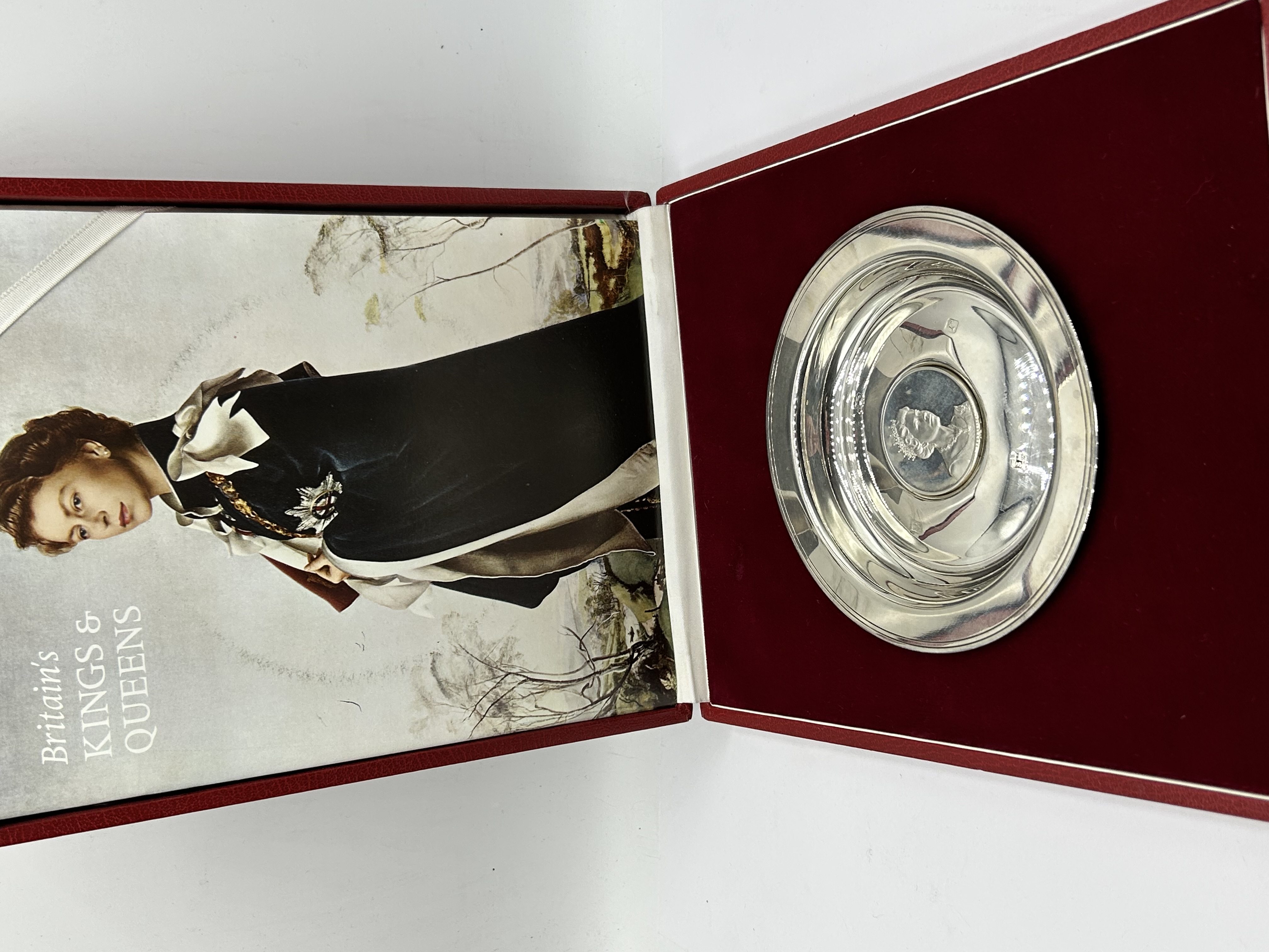 A Silverware Manufacturing sterling silver commemorative armada dish, hallmarked for London, 1972, with the maker mark SM. The center features a medallion with a profile portrait of Queen Elizabeth II in relief. The reverse is engraved QUEEN ELIZABETH II ROYAL LINEAGE No 740 LIMITED EDITION OF 1500, marking the Queen’s Silver Wedding anniversary. The dish is housed in its original red leatherette-covered presentation case, which is embossed in gilt with the Royal Coat of Arms and the title QUEEN ELIZABETH II SILVER WEDDING LIMITED EDITION. The set includes an illustrative booklet titled Britain’s Kings & Queens.