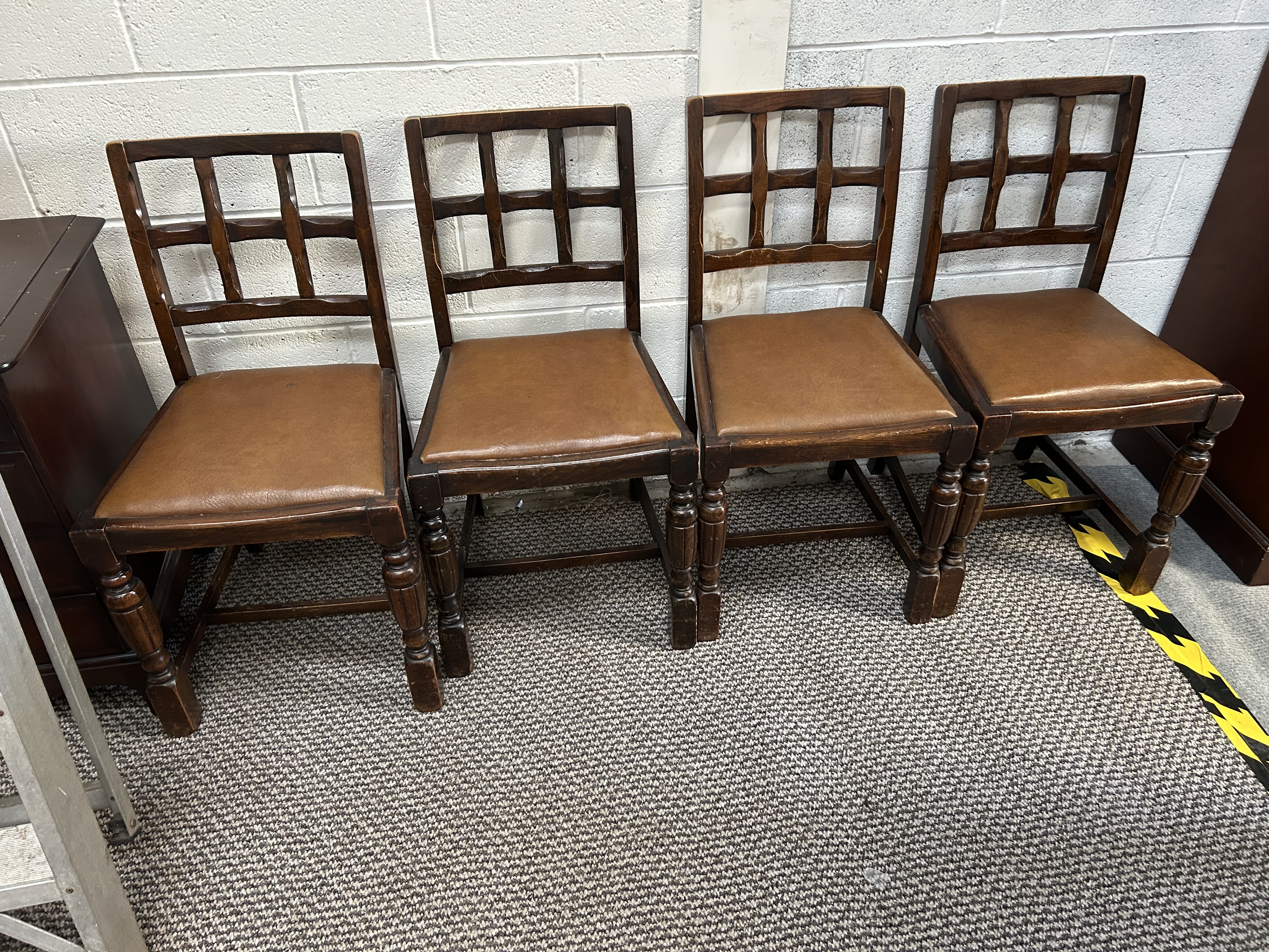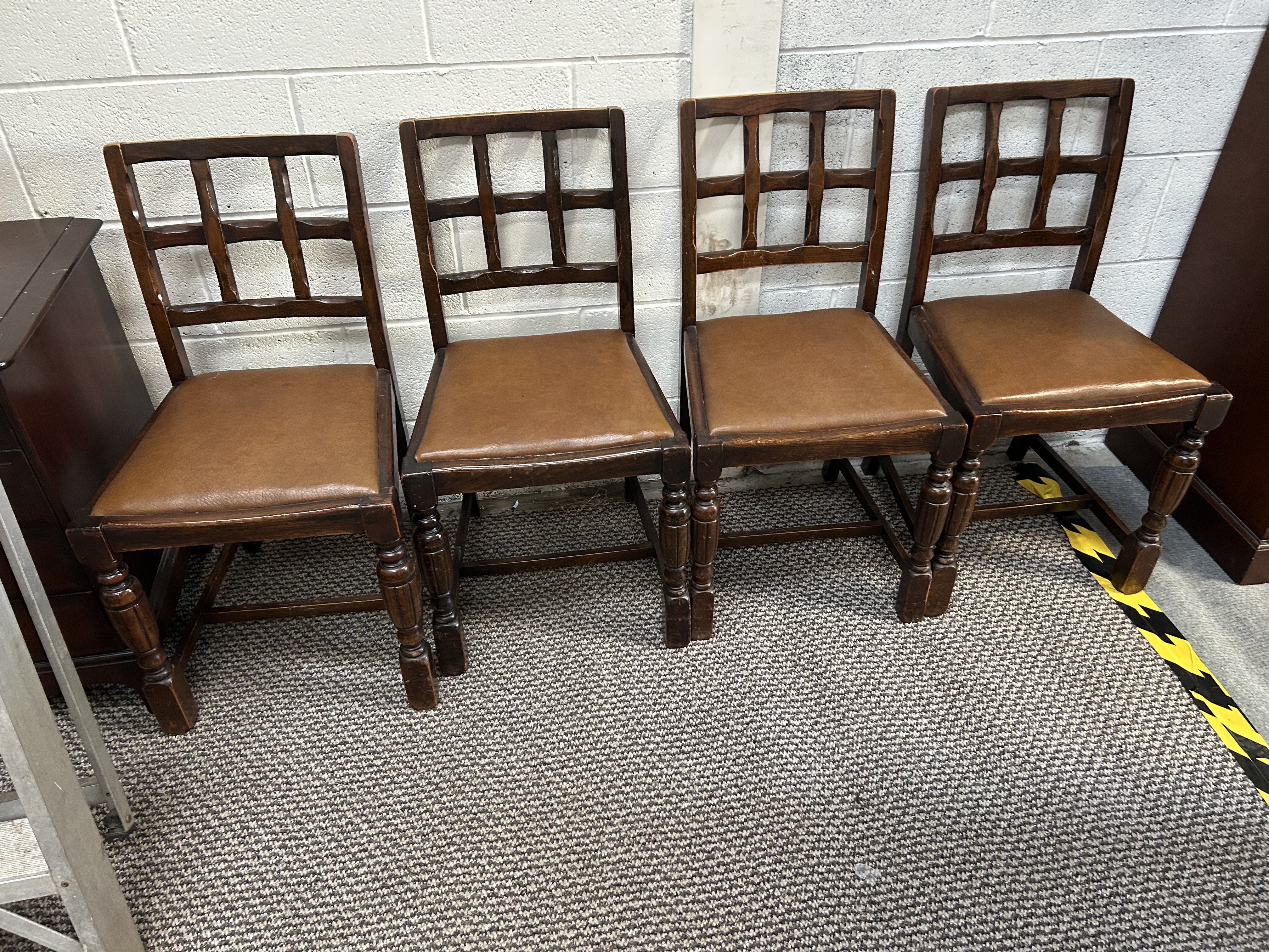 A set of dining side chairs constructed from dark-stained oak. Each chair features an open backrest with a grid-patterned splat, a design characteristic of the Aesthetic Movement and Eastlake era. The seats are upholstered in brown leather or faux-leather. The chairs are supported by turned front legs on square block feet, joined by an H-stretcher for structural stability. The construction and style are consistent with English furniture from the late 19th to early 20th century.
