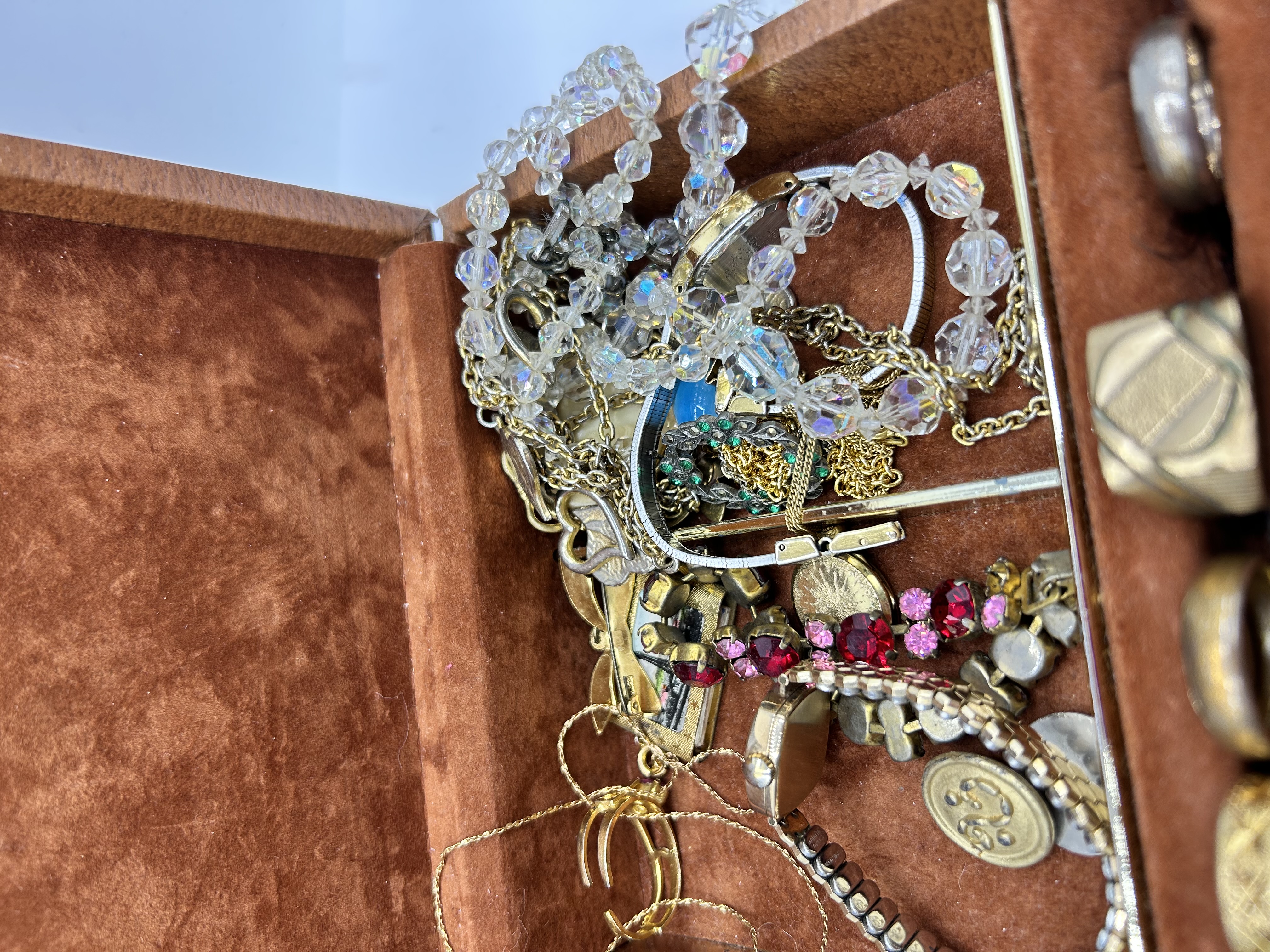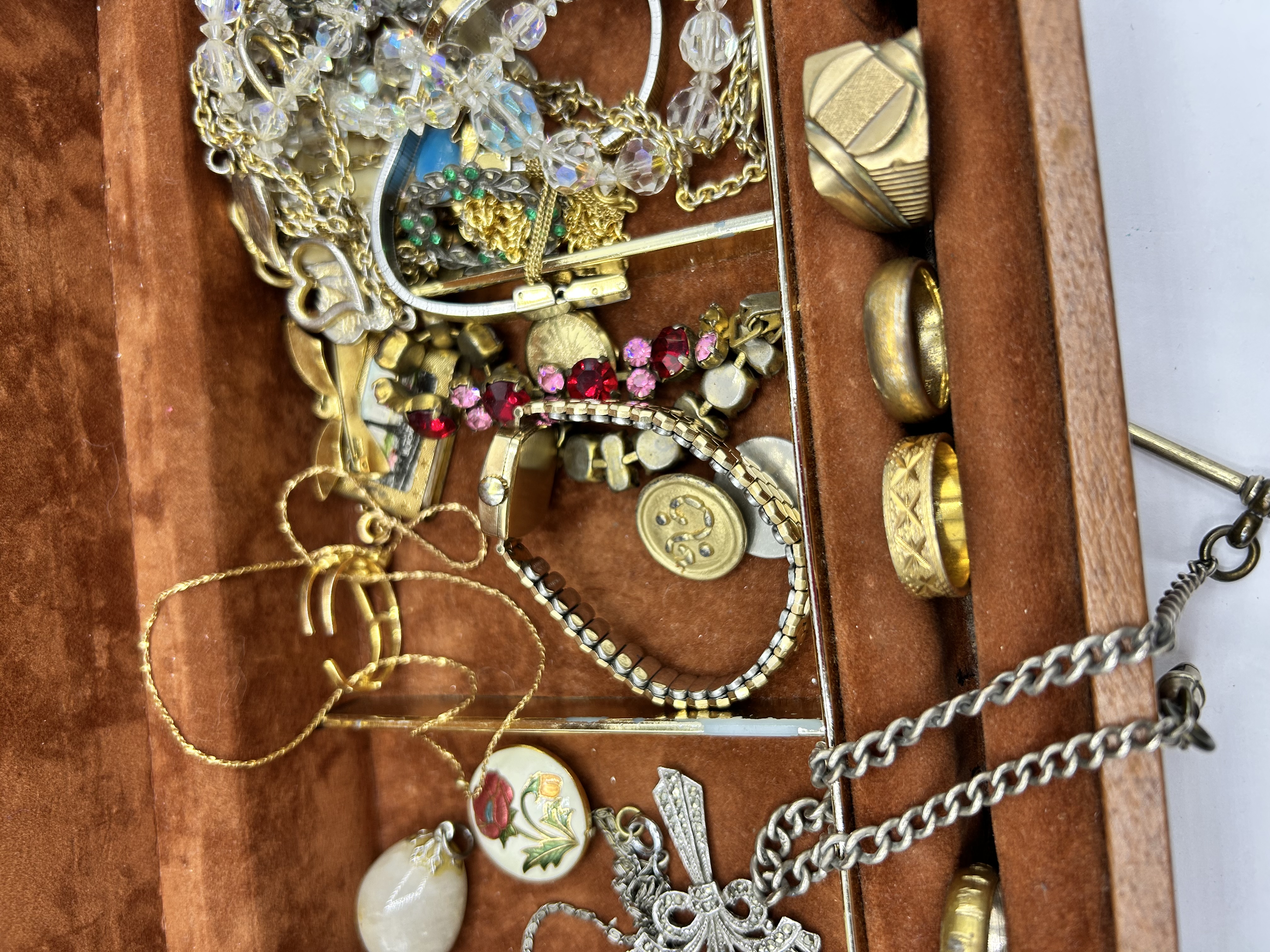 An assortment of vintage costume jewelry presented in a hinged wooden jewelry box with a brown plush-lined interior. The collection includes several rings, such as gold-tone bands and a signet-style ring, and multiple necklaces featuring a faceted iridescent glass bead strand alongside various silver-tone and gold-tone chains. Notable pendants include a round floral enamel disc depicting a red rose and a white teardrop-shaped cabochon. The group also contains assorted brooches, including a marcasite-style bow and a pink and red rhinestone-set piece, as well as a vintage ladies gold-tone wristwatch with an expansion bracelet. The items are primarily composed of base metals, glass, and synthetic stones.