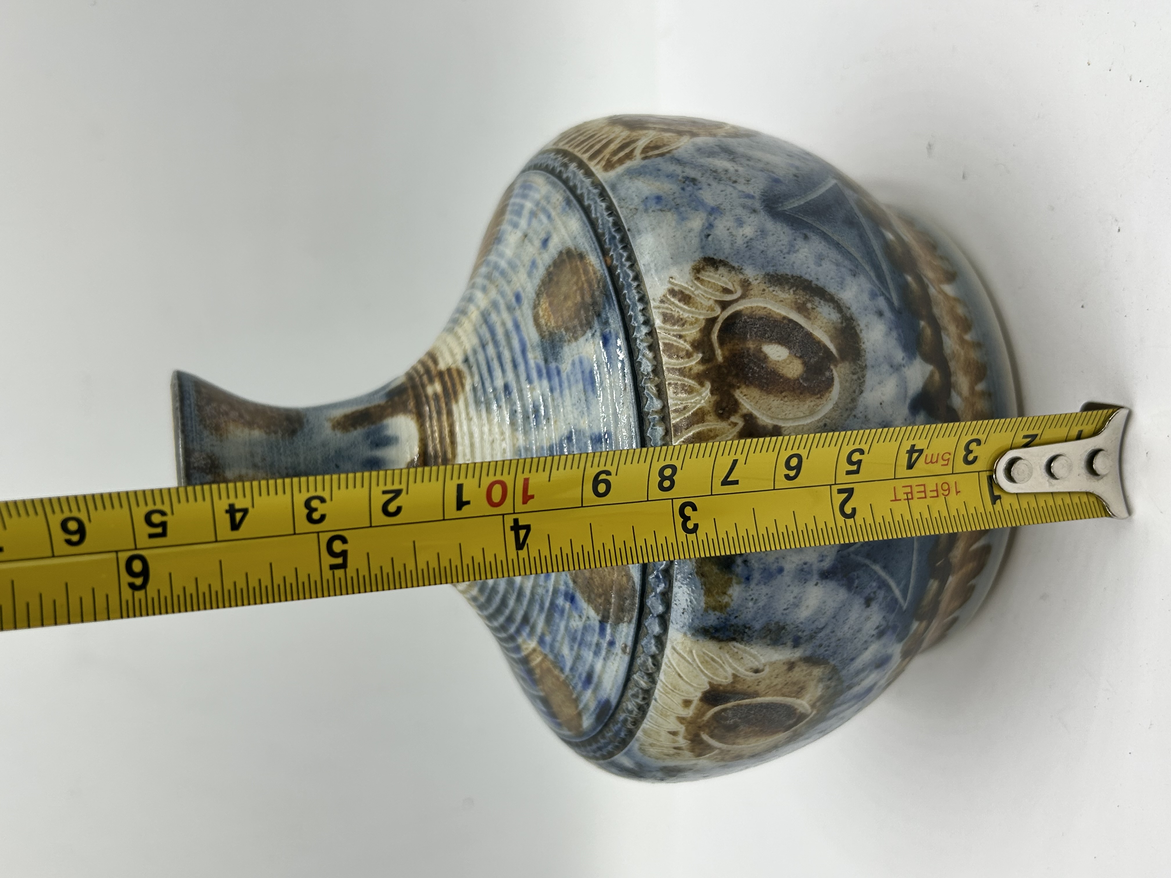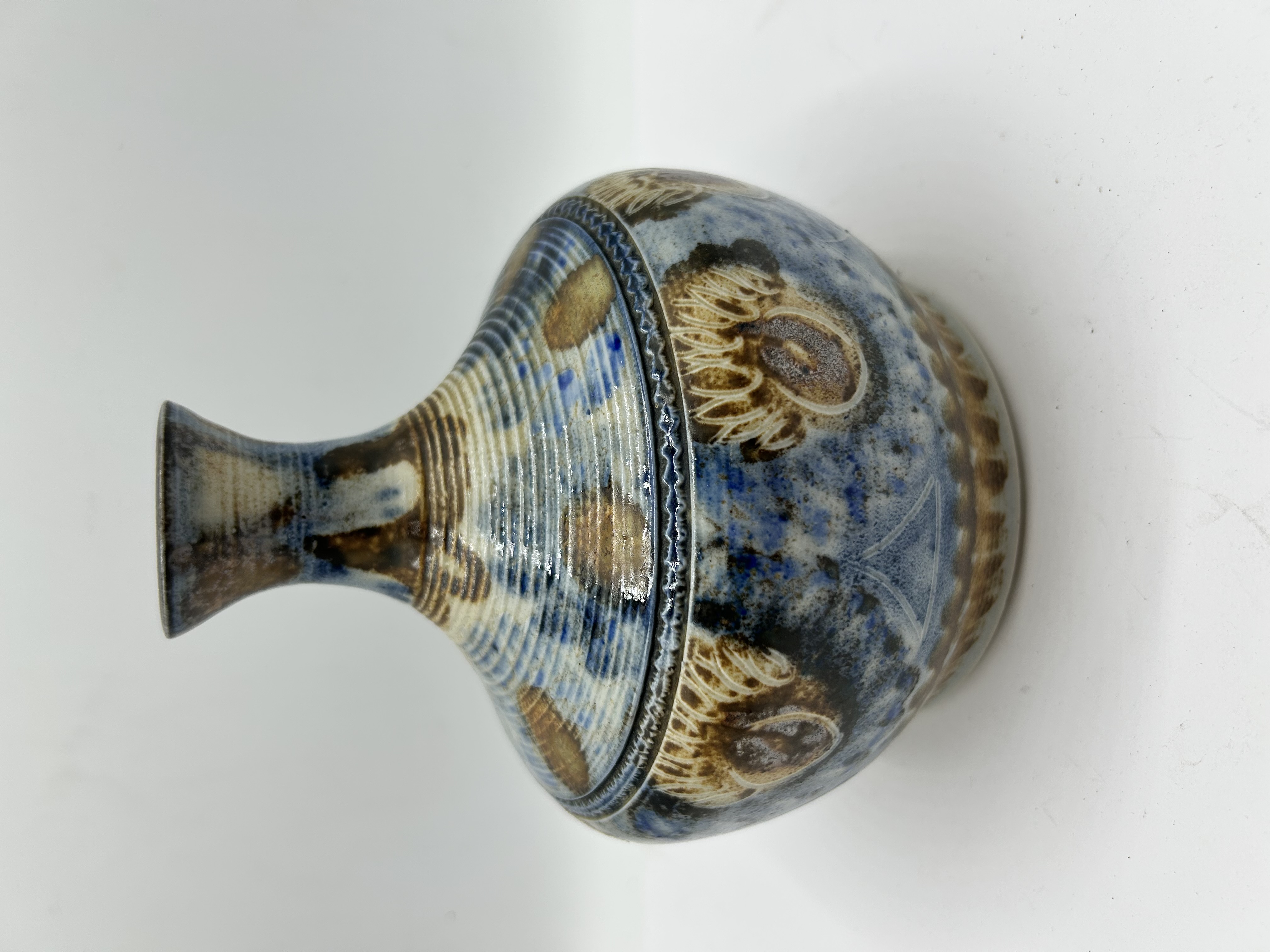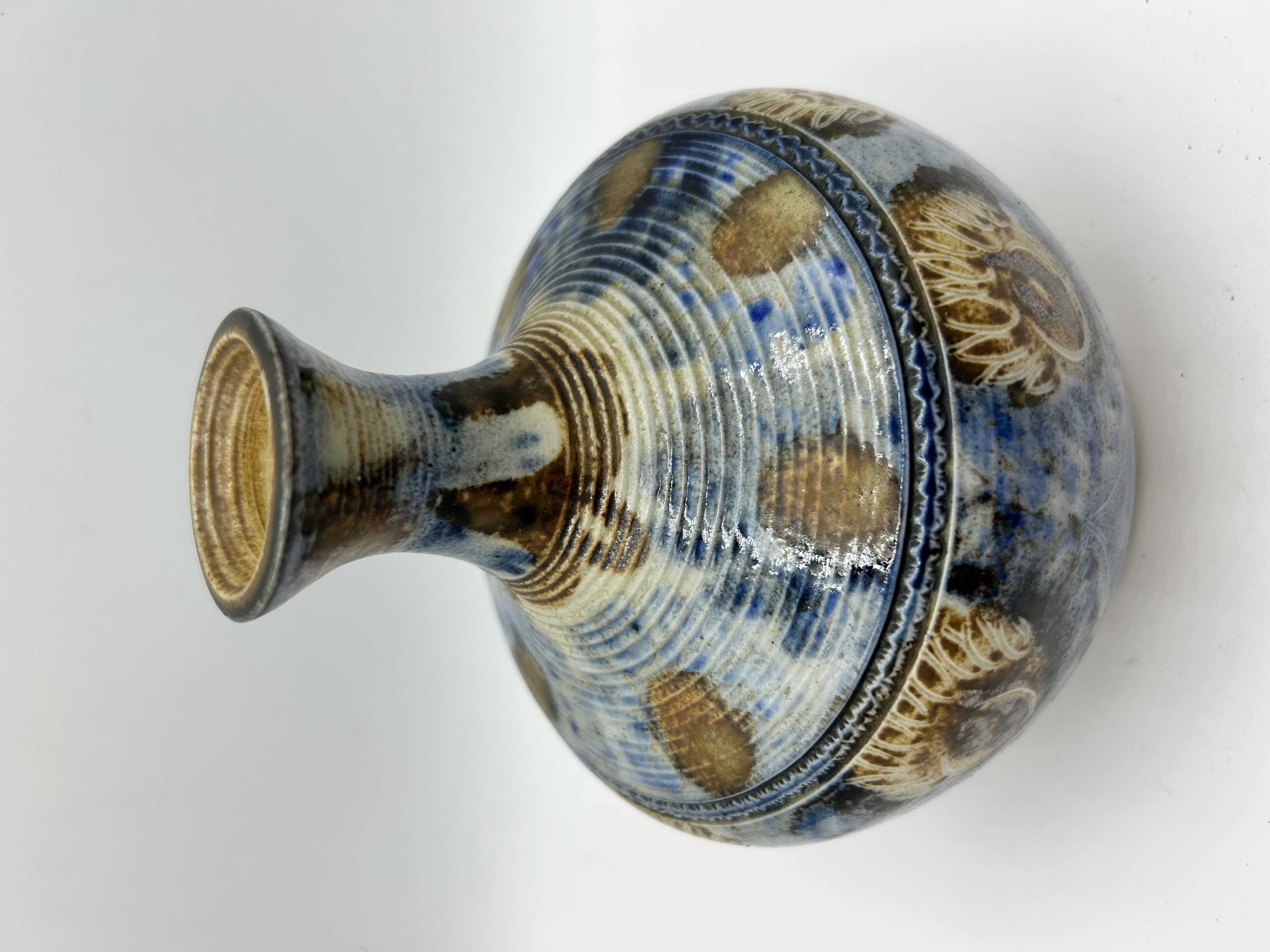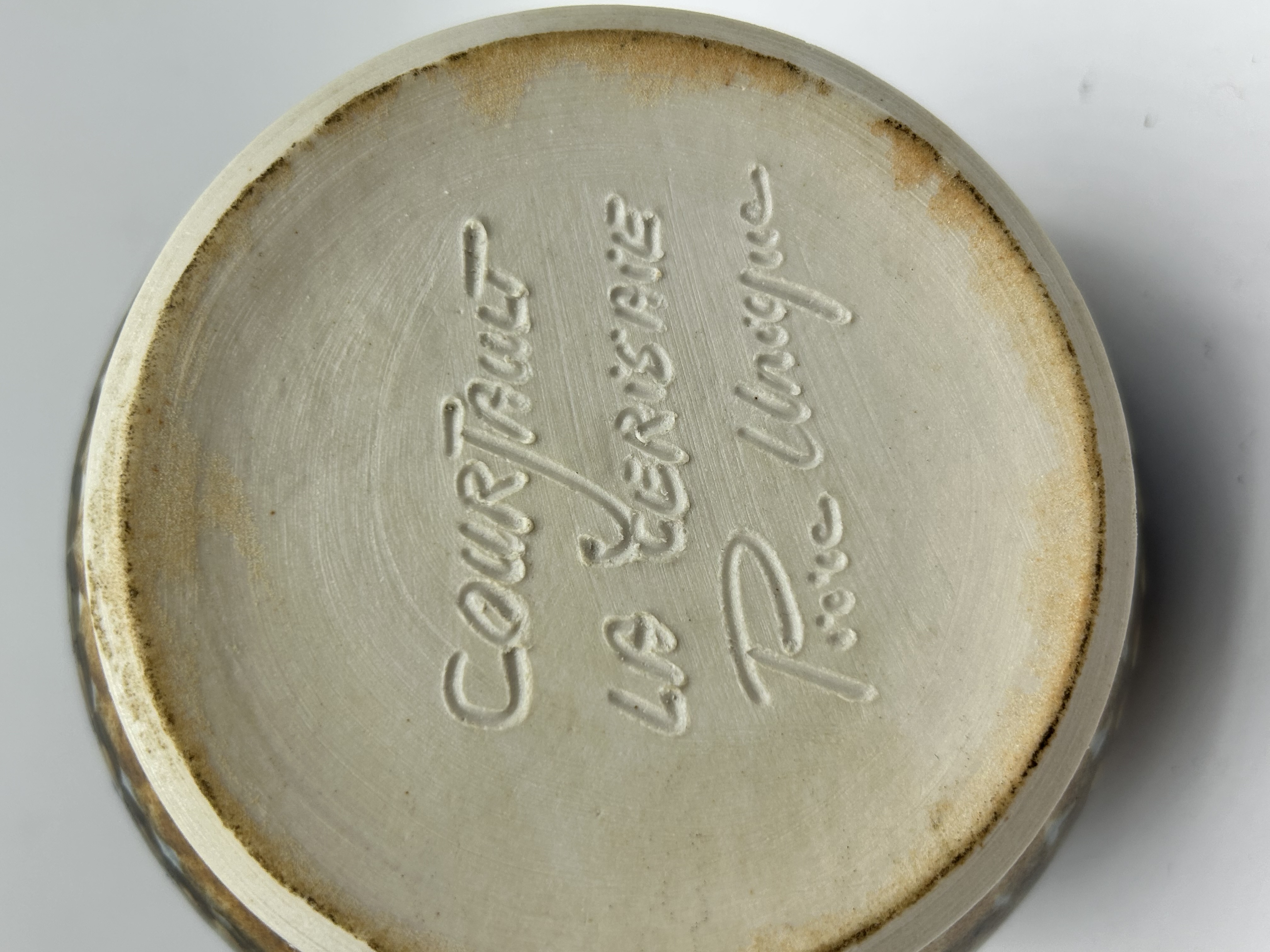 A studio pottery ceramic vase by Jean-Claude Courjault, produced at the La Cerisaie studio. The vessel features a bulbous body that tapers into a ribbed, conical upper section and a narrow, flared neck. The exterior is finished with a multi-toned glaze in shades of mottled blue, brown, and cream, decorated with abstract circular and stylized floral motifs. The underside is hand-incised with the inscriptions Courjault, La Cerisaie, and Piece Unique, indicating its status as a one-of-a-kind work.