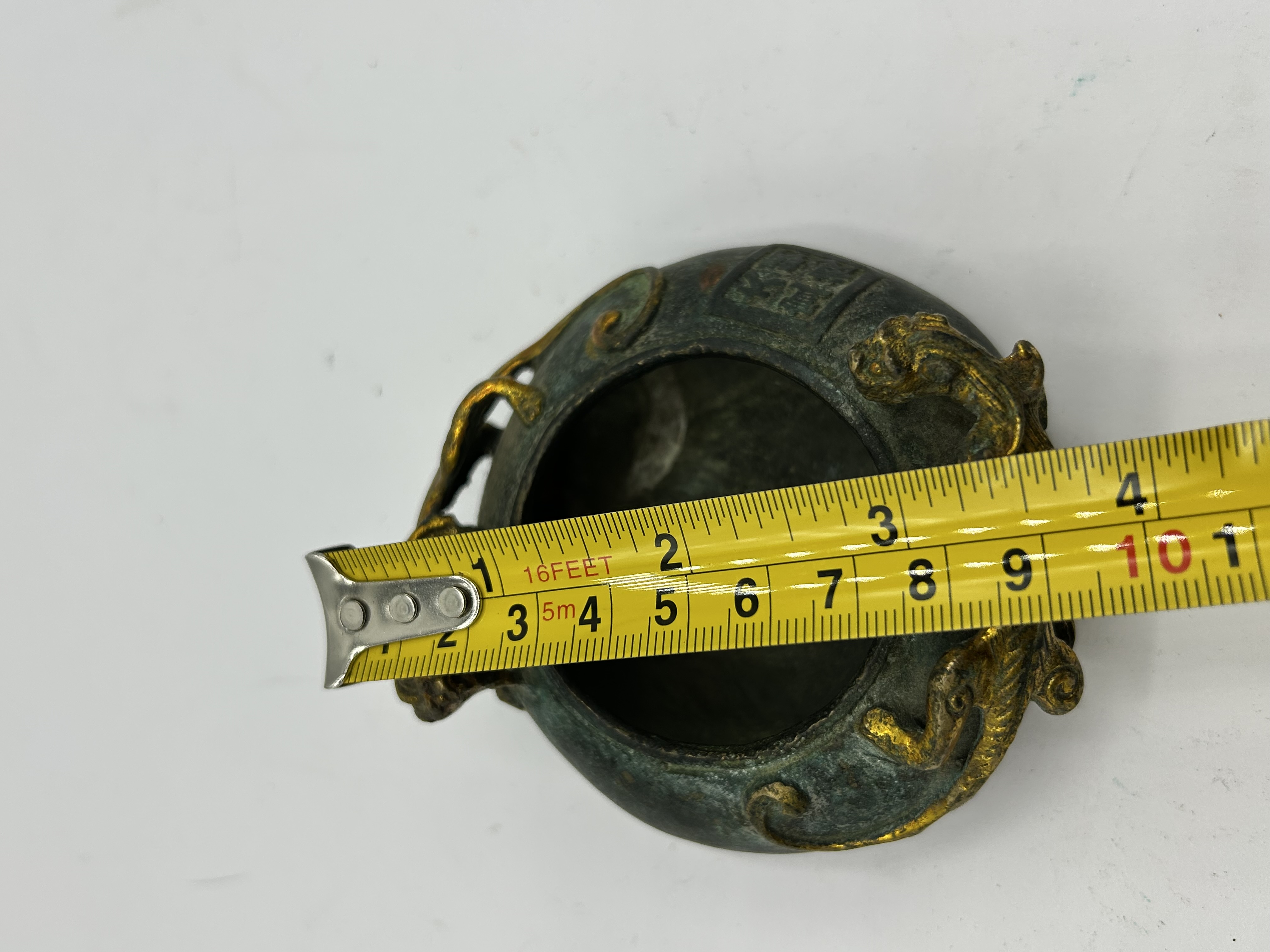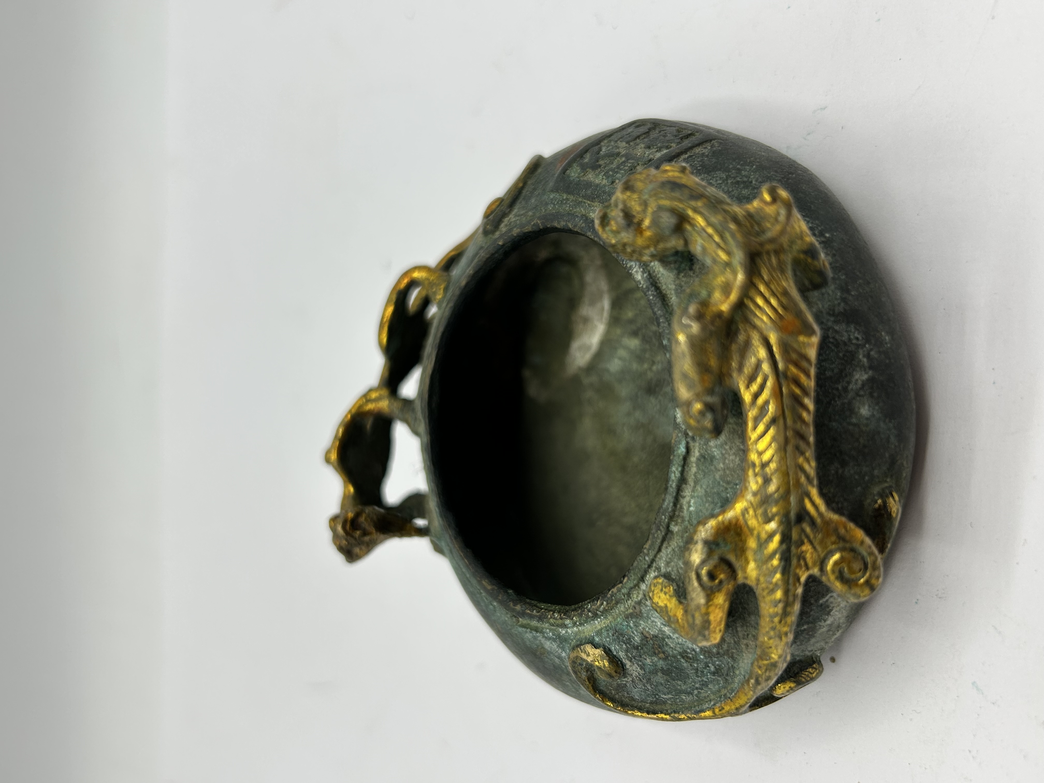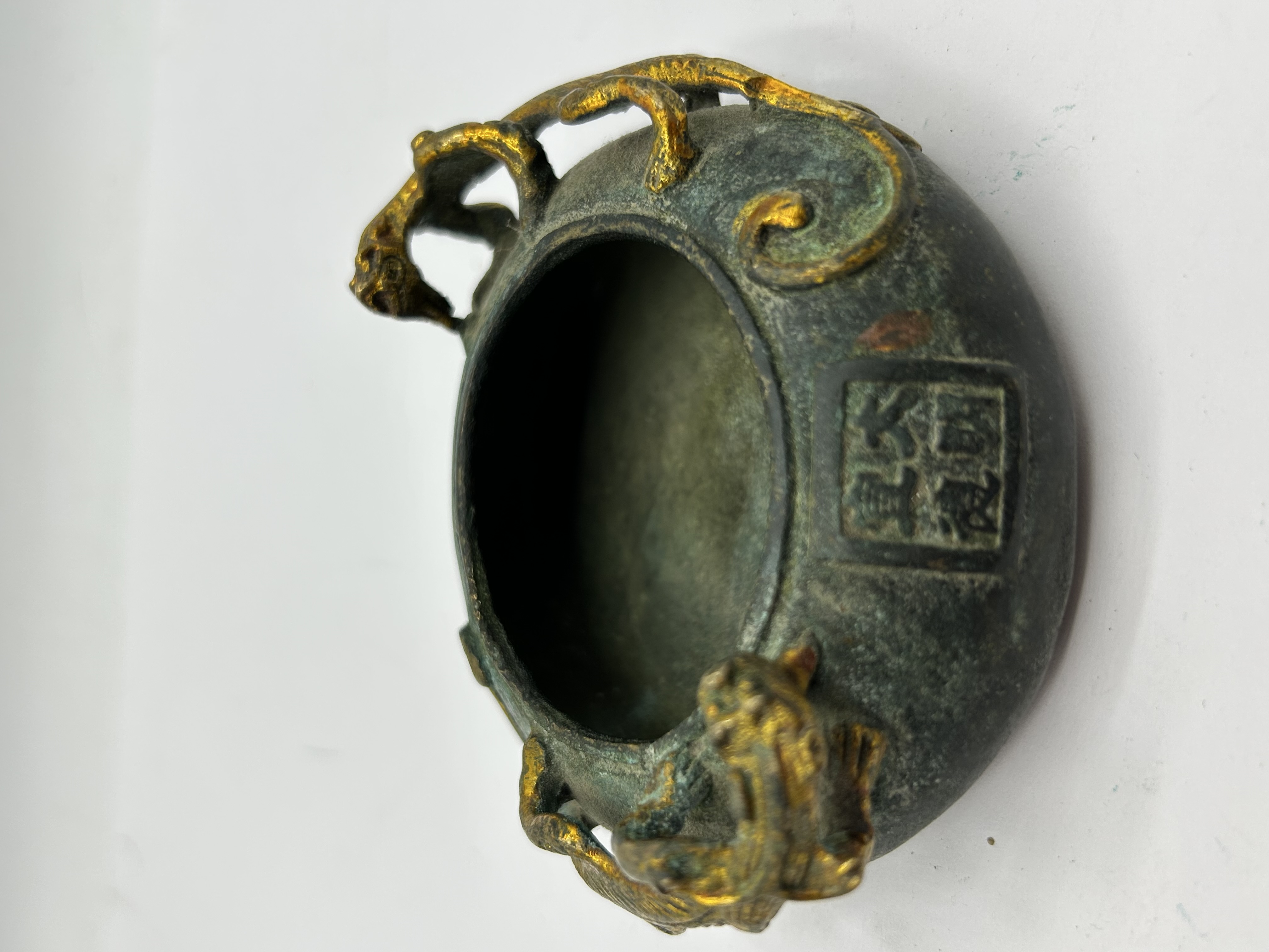 A small Chinese cast bronze vessel of globular form featuring twin dragon-form handles and relief scroll decorations. The body is finished with a heavy green verdigris patina and retains areas of surface gilding. A four-character square seal mark is cast into the side, which translates to Da Ming Xuan De. The interior shows a dark, oxidized surface.