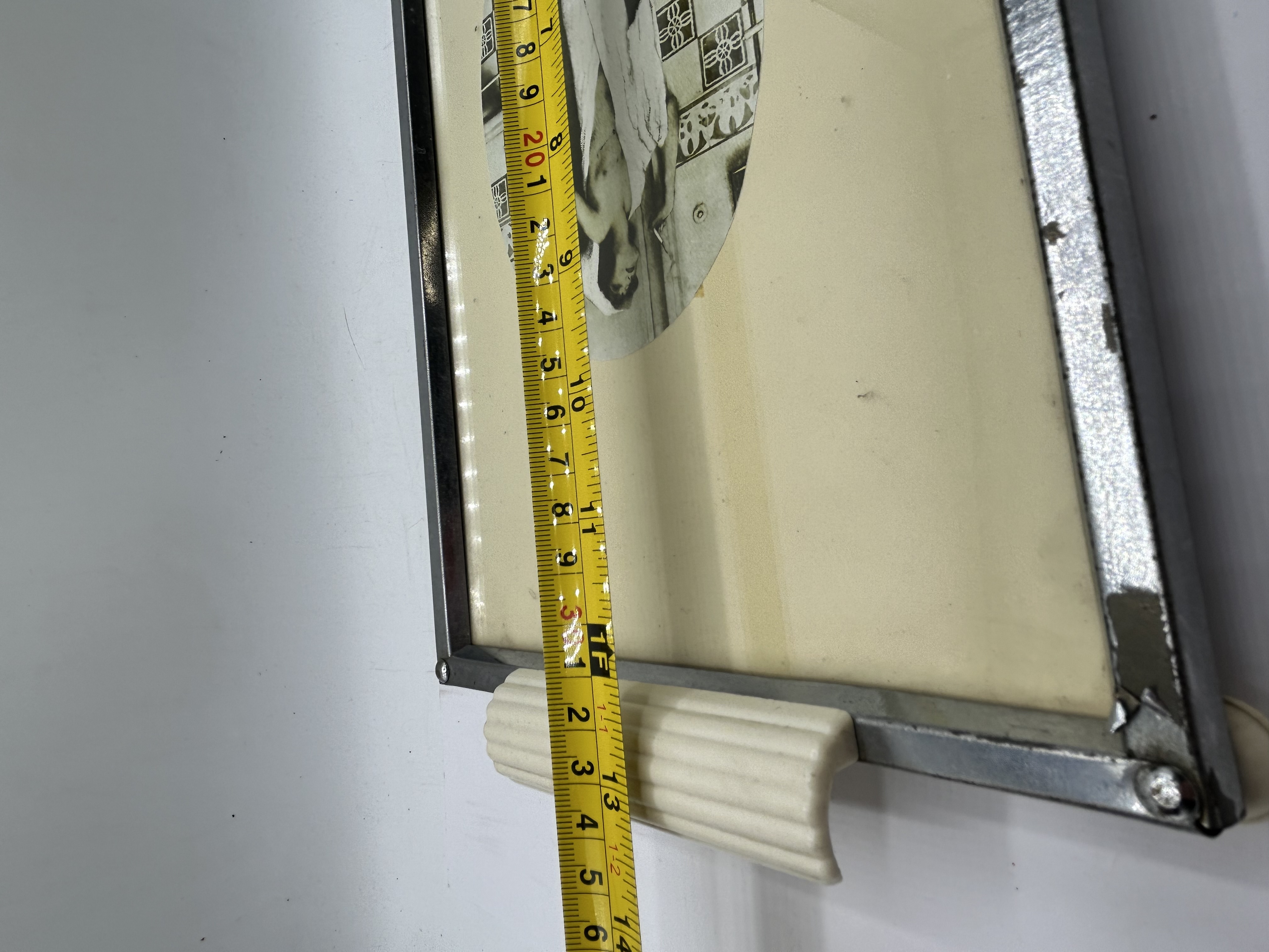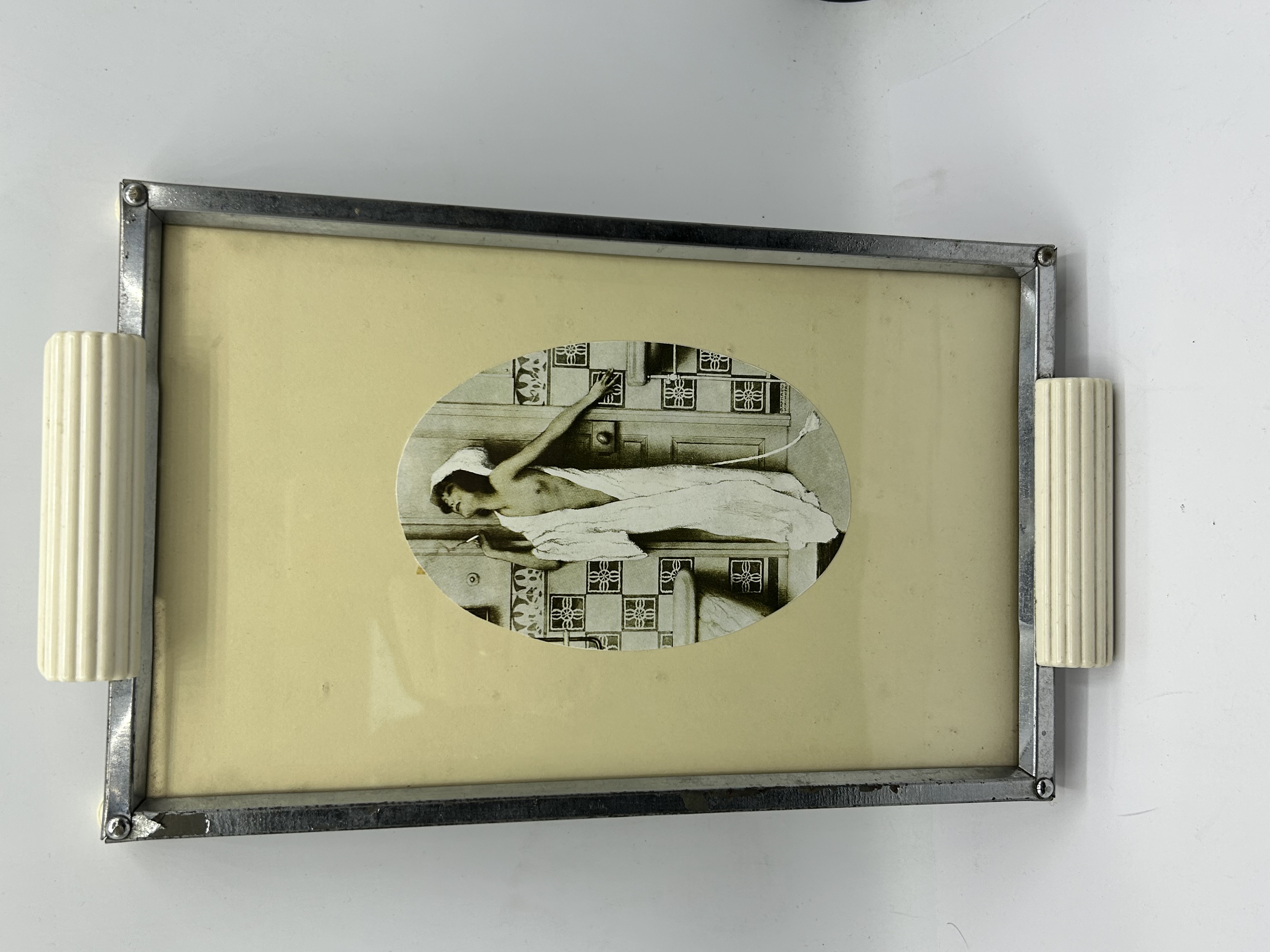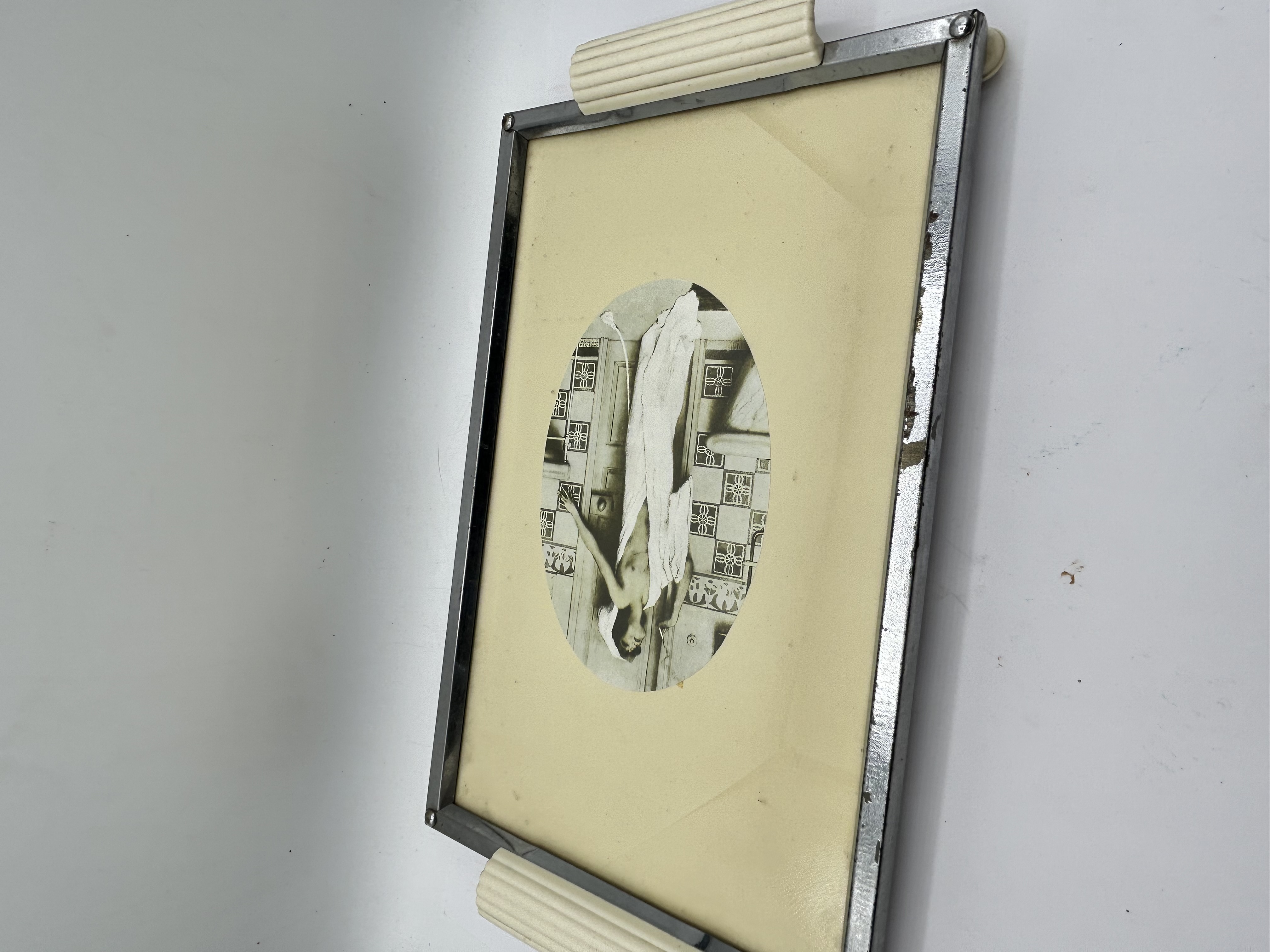 An Art Deco cocktail or serving tray featuring a rectangular chrome-plated metal frame and two ribbed, cream-colored Bakelite handles. The tray houses a central oval black-and-white illustration of a semi-nude female figure draped in a white towel, leaning against a door with decorative tiling, in the manner of Louis Icart. The illustration is set against a cream paper background protected by a glass pane. The construction utilizes a metal frame secured with screws at the corners.